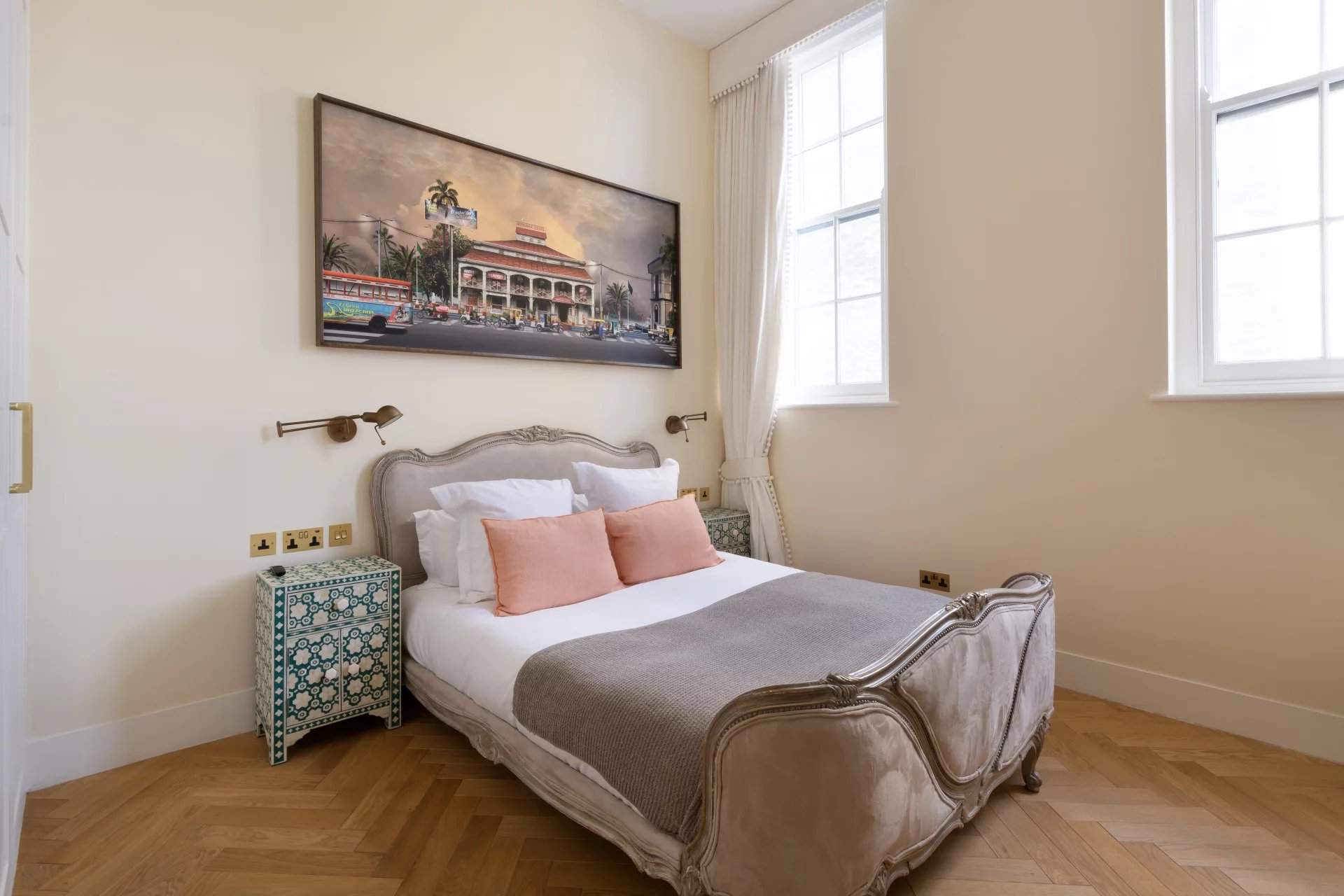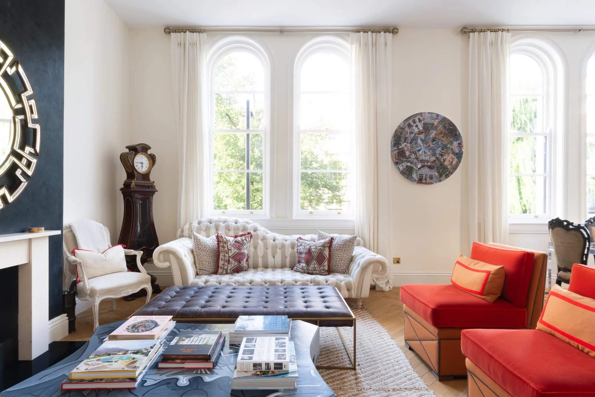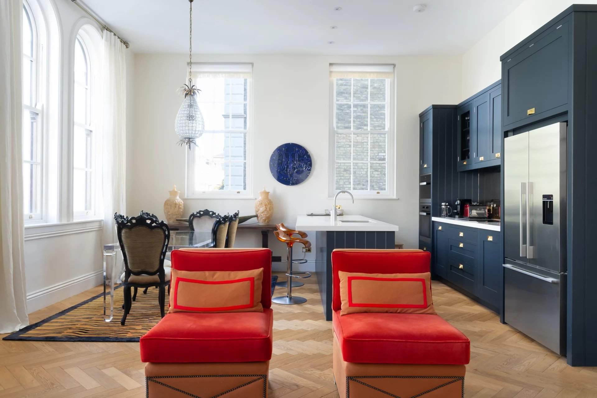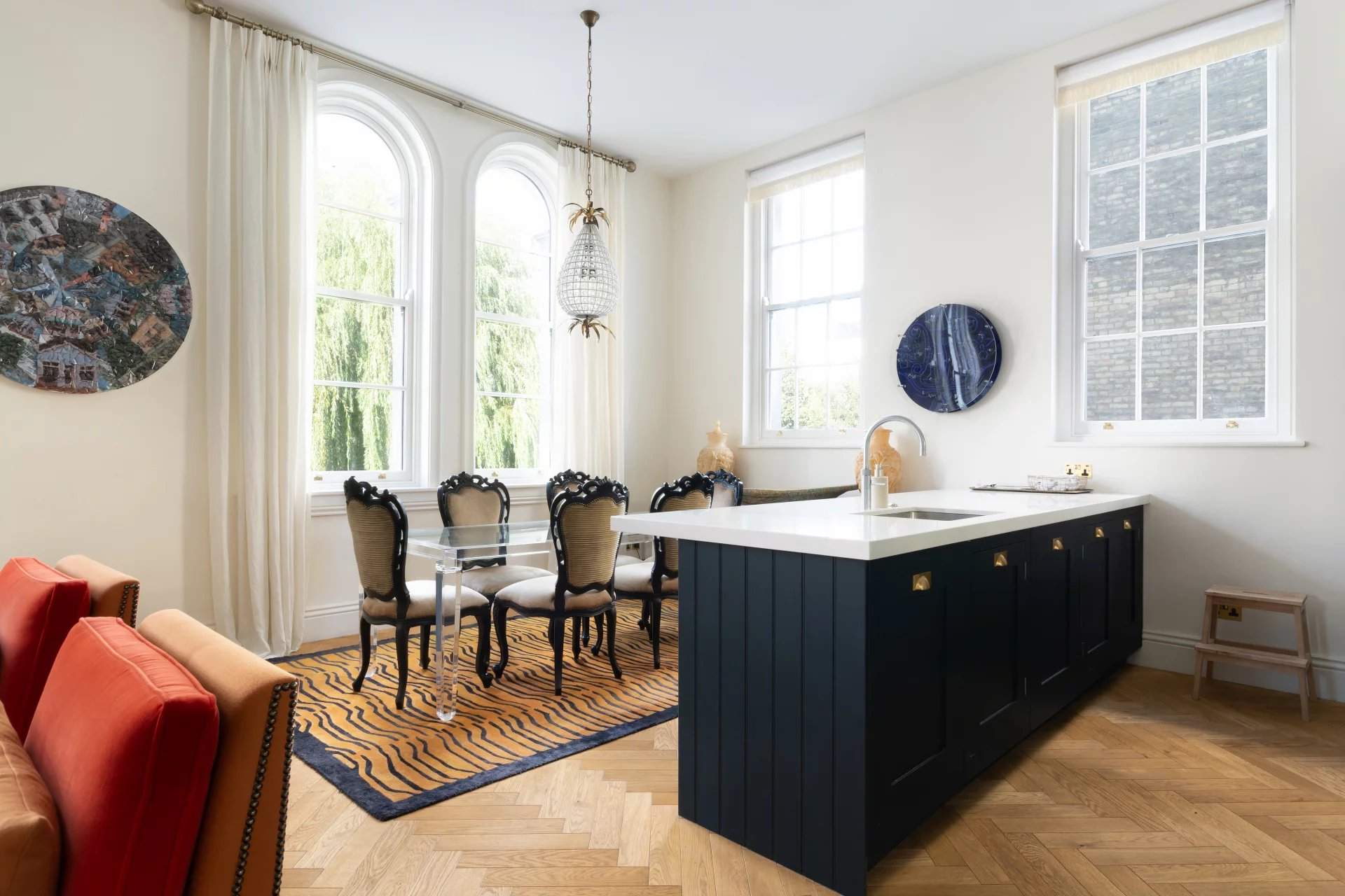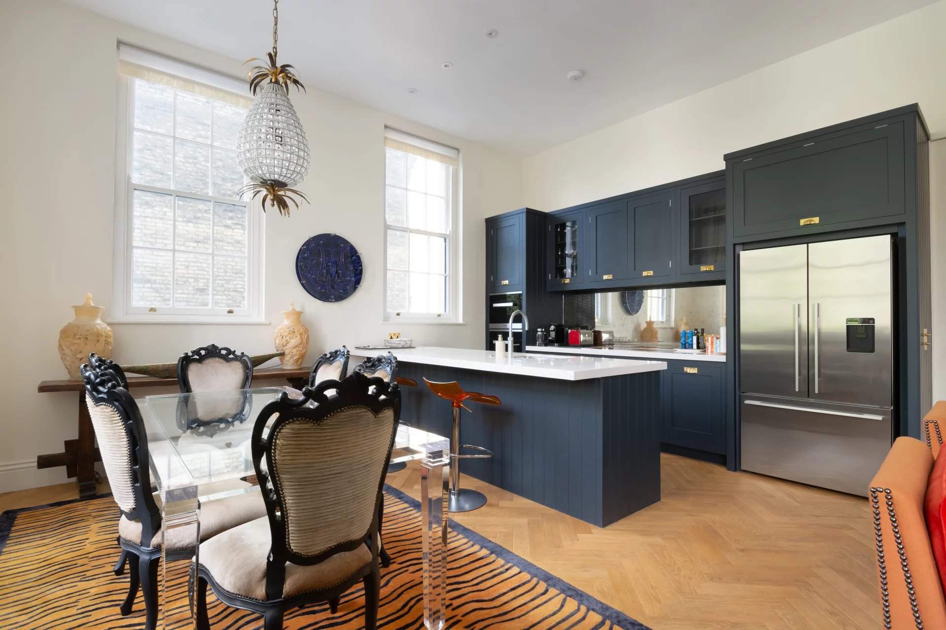 This two-bedroom lateral apartment just off Westbourne Grove blends calm sophistication with bold, textural interior design. The first-floor open-plan kitchen, dining, and reception room features warm parquet floors, arched and sash windows, and thoughtfully delineated zones for cooking and lounging. The kitchen pairs navy cabinetry with whitewashed worktops, a mirrored splashback, integrated appliances, and orange bar stools, while the dining area seats six beneath an antique glass and brass chandelier. The living area includes tuxedo sofas, tangerine mid-century chairs, a stone fireplace, and a granite-toned feature wall. The principal suite features dark wall panelling, a velvet bed, and an en suite with greyscale marble shower and large vanity. The guest suite is minimalist, with pale walls, wood floors, full-height wardrobes, and a skylit en suite with bath. An expansive private terrace with lush planting completes the apartment, ideal for al fresco entertaining.