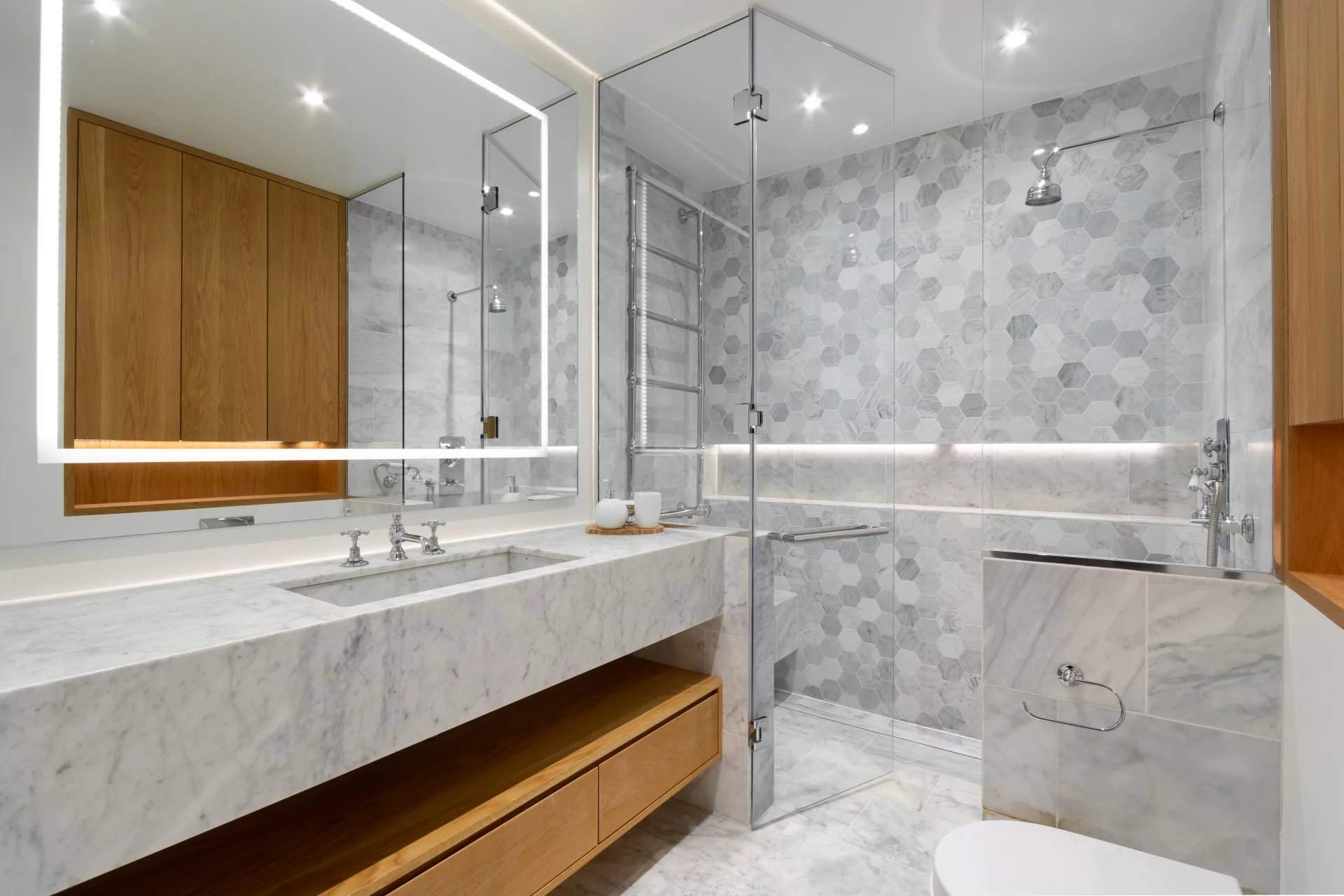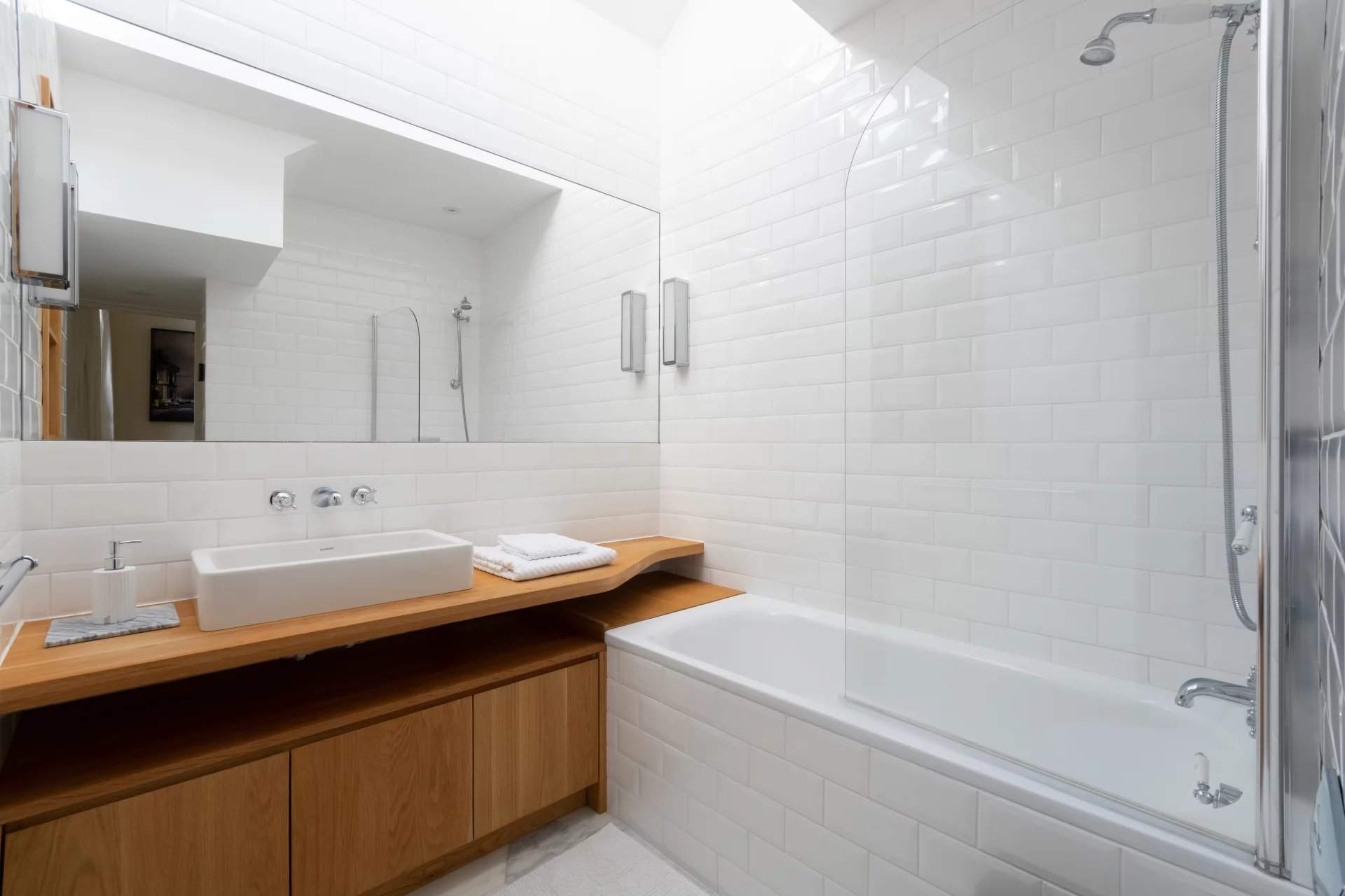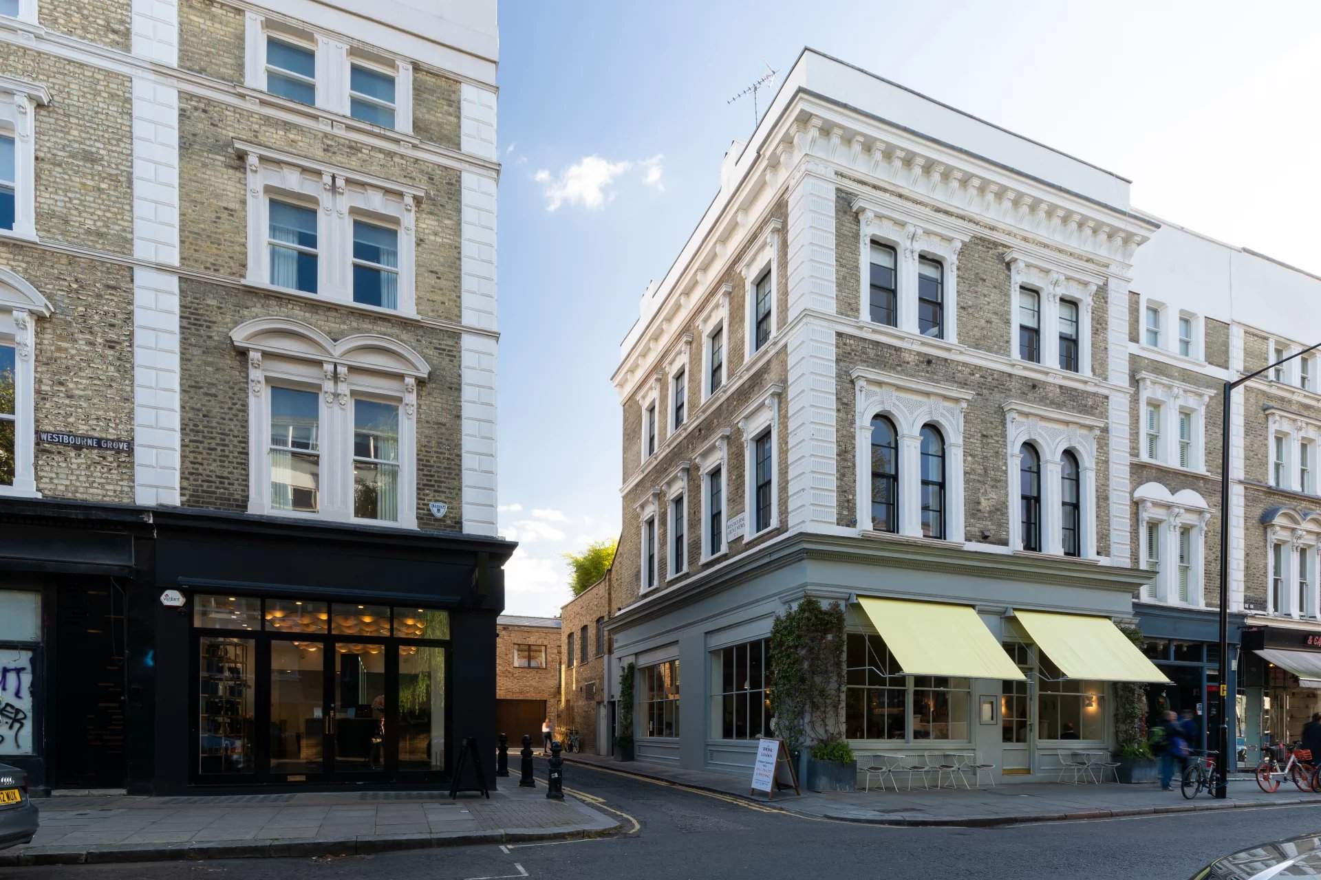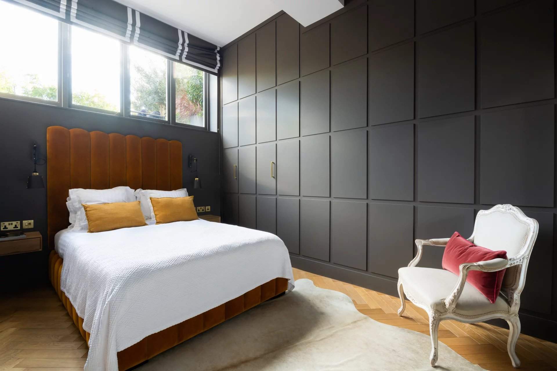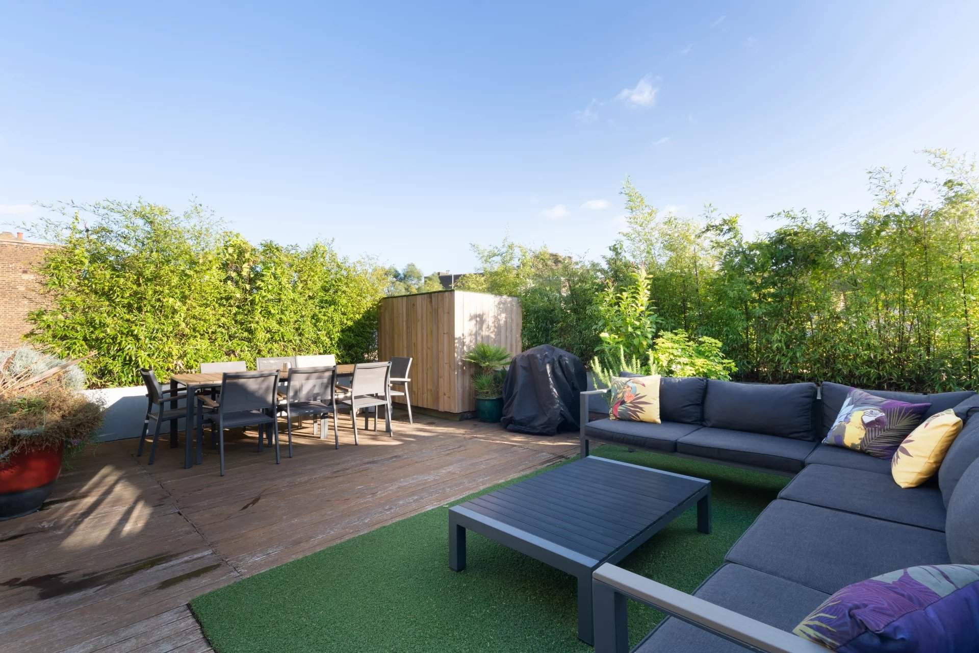 This two-bedroom lateral apartment just off Westbourne Grove blends calm sophistication with bold, textural interior design. The first-floor open-plan kitchen, dining, and reception room features warm parquet floors, arched and sash windows, and thoughtfully delineated zones for cooking and lounging. The kitchen pairs navy cabinetry with whitewashed worktops, a mirrored splashback, integrated appliances, and orange bar stools, while the dining area seats six beneath an antique glass and brass chandelier. The living area includes tuxedo sofas, tangerine mid-century chairs, a stone fireplace, and a granite-toned feature wall. The principal suite features dark wall panelling, a velvet bed, and an en suite with greyscale marble shower and large vanity. The guest suite is minimalist, with pale walls, wood floors, full-height wardrobes, and a skylit en suite with bath. An expansive private terrace with lush planting completes the apartment, ideal for al fresco entertaining.