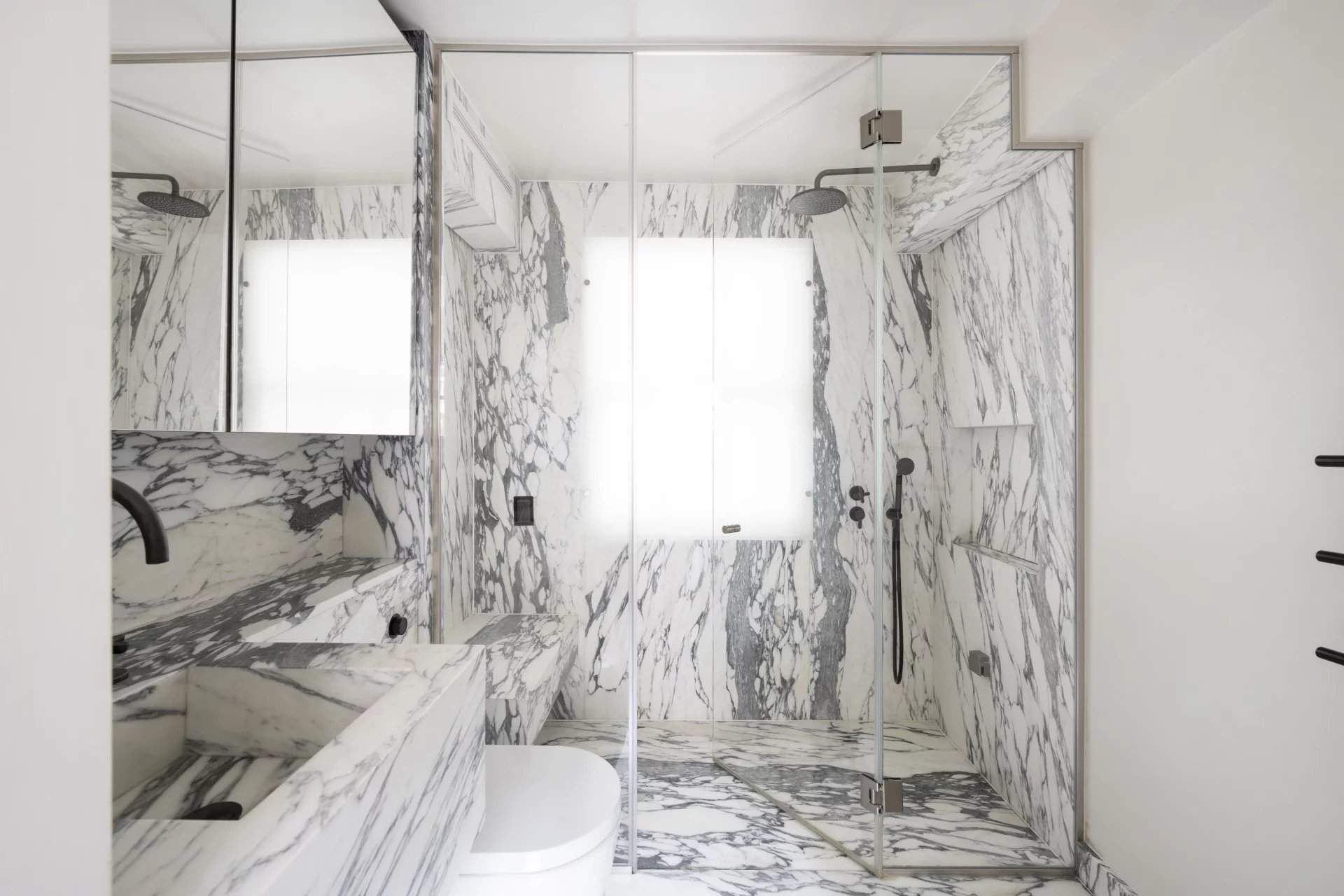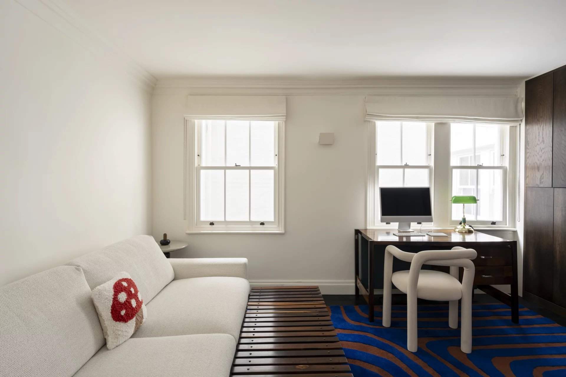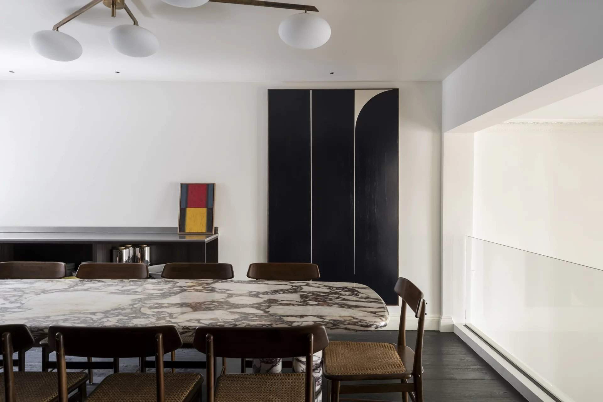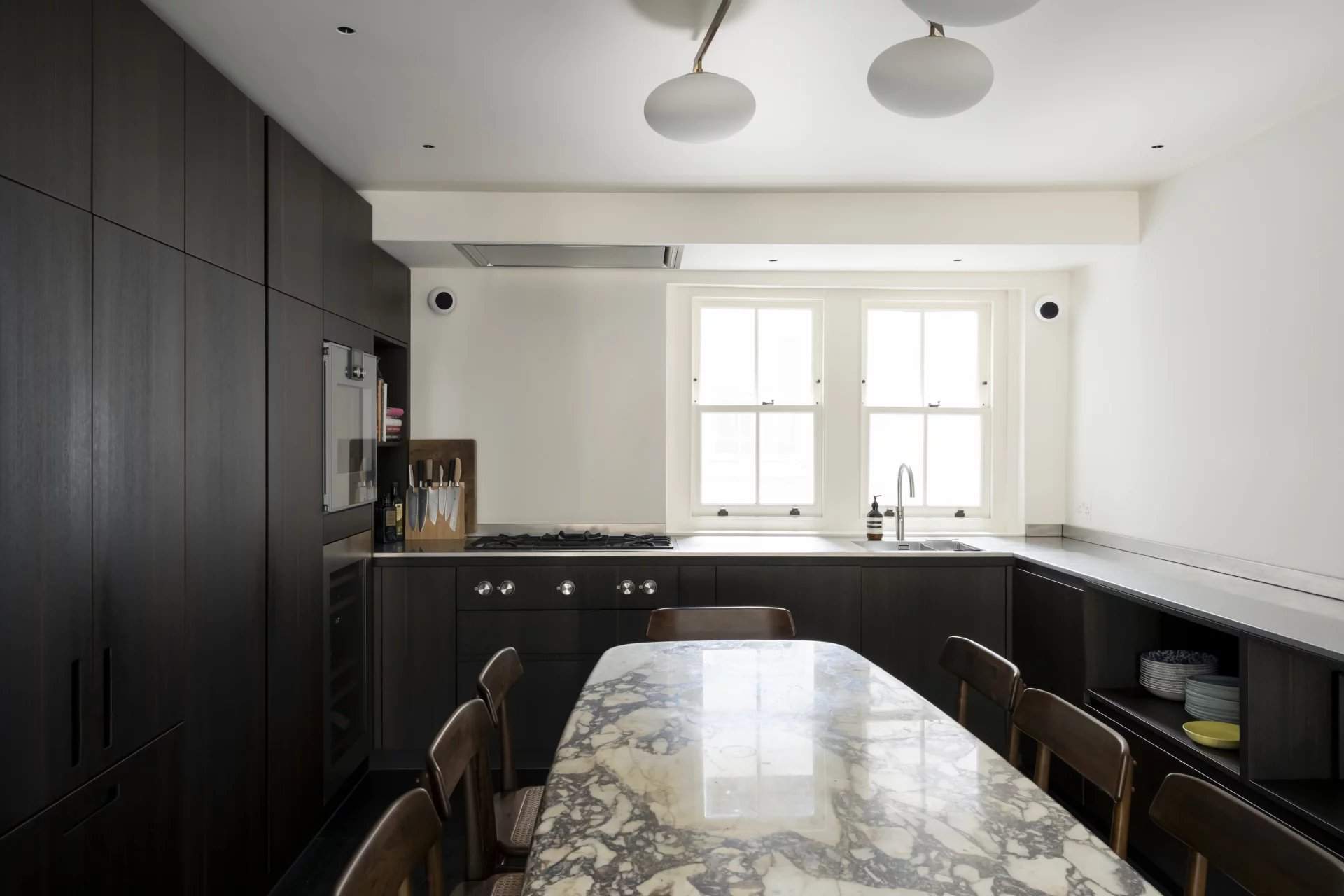Spread across the first floor of a 1900s townhouse, this two-bedroom apartment strikes a refined balance between classic charm and contemporary design. Renovated by Studio D3 London in collaboration with FingersHome interiors, the space flows from a grand reception room with soaring ceilings and sash windows into a raised kitchen and dining area. The award-winning Kochwerk kitchen features bespoke wood cabinetry, art deco lighting, and premium appliances, all framed by pale walls, dark wood floors, and underfloor heating. The private spaces continue the home's thoughtful design. The principal suite embraces a minimalist palette, complete with a dressing room and a marble-wrapped en suite that includes a steam shower and Japanese Sensoflush toilet. The guest bedroom offers versatility as a workspace or additional storage, while its bathroom showcases striking black marble floors, a custom Japanese ofuro bathtub, and mid-century accents. Together, the home's details blend elegance and innovation within a historic townhouse setting.