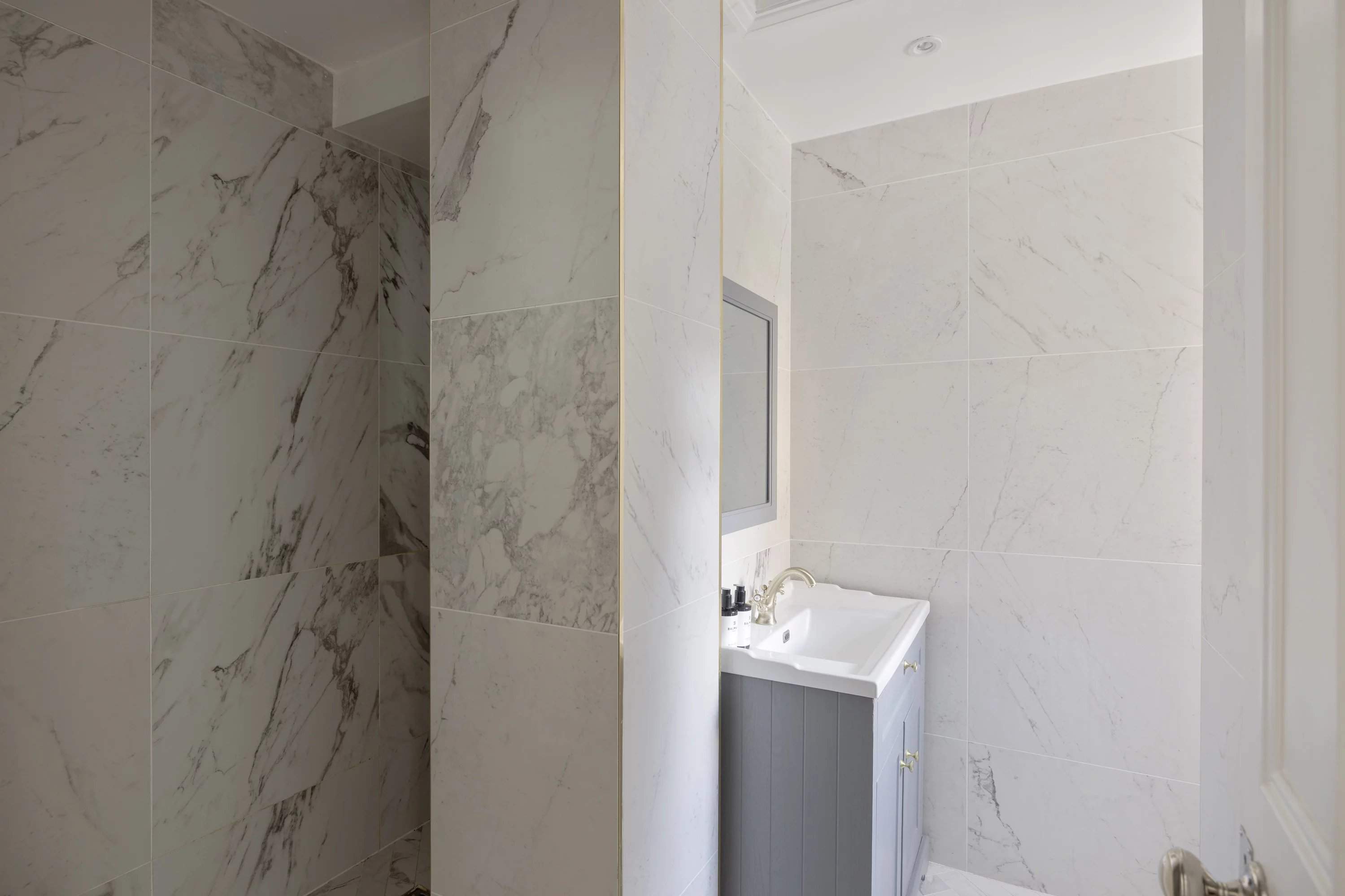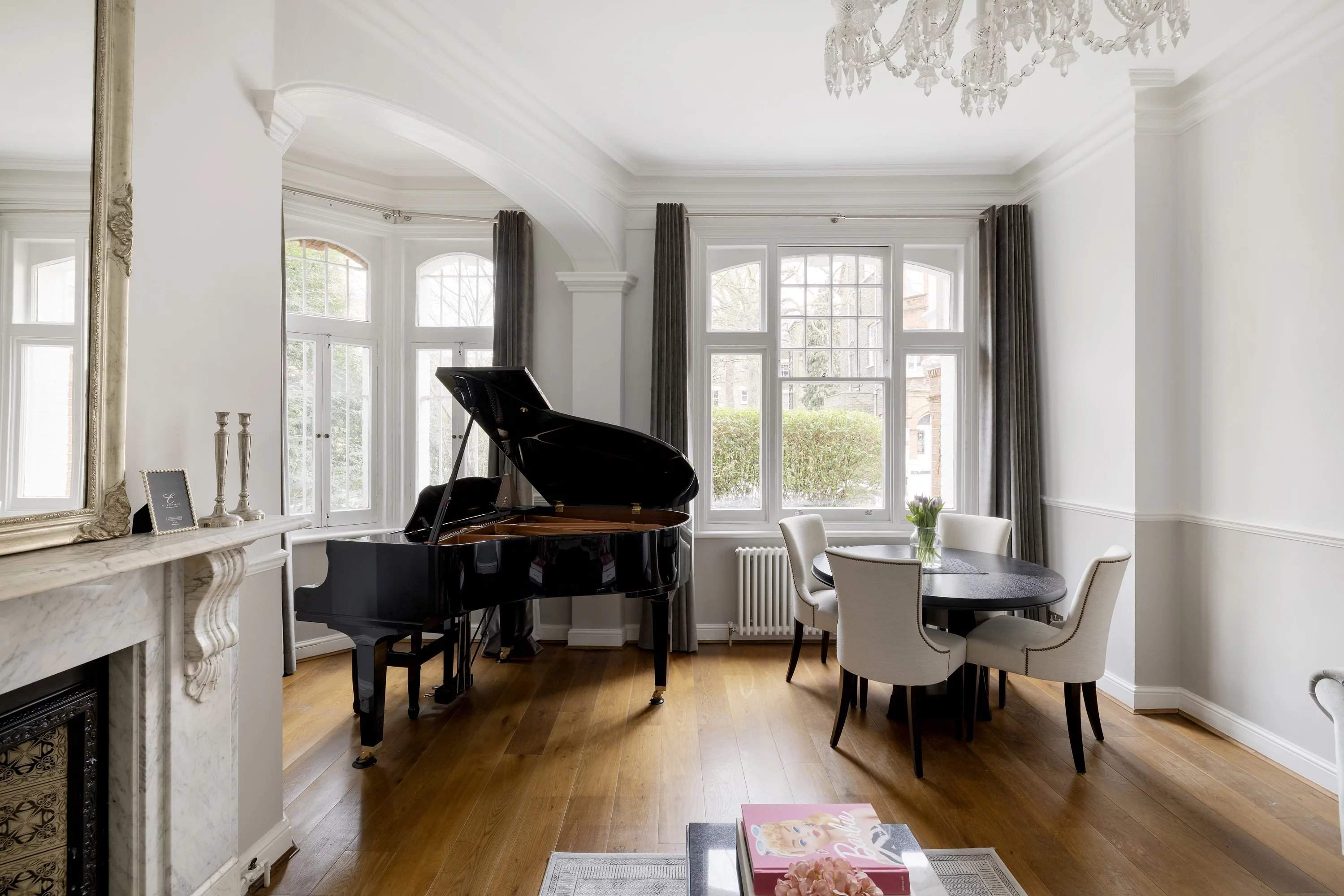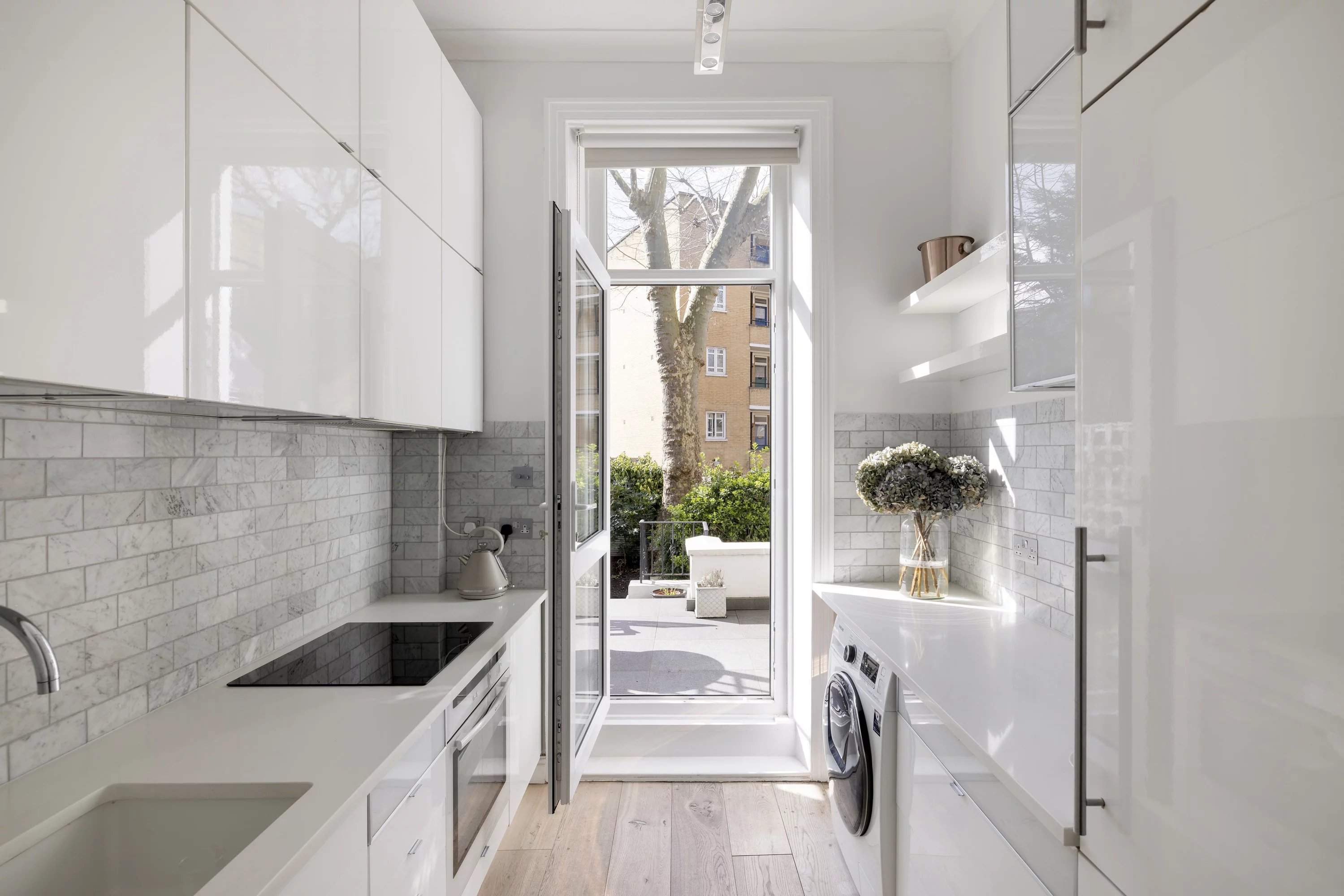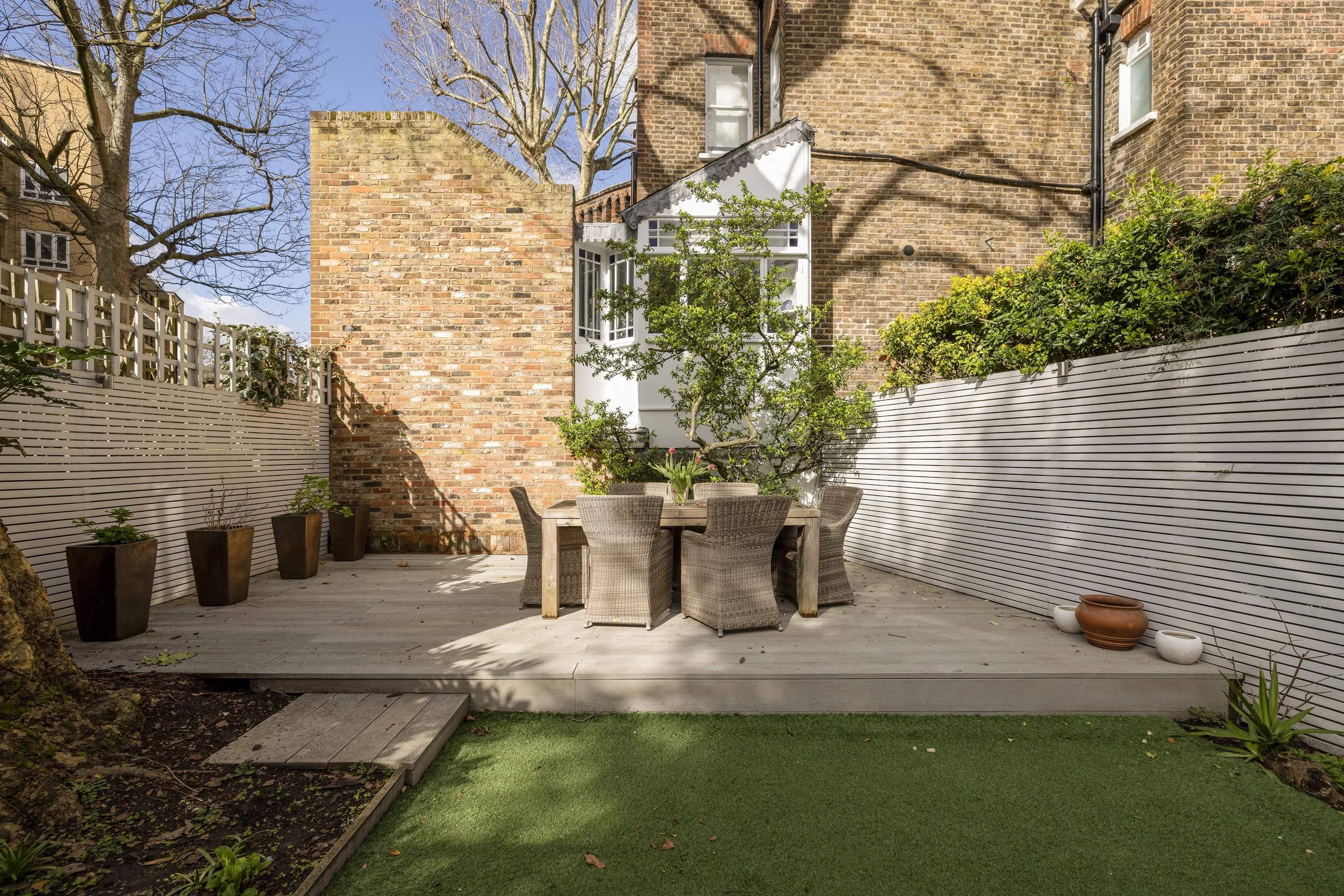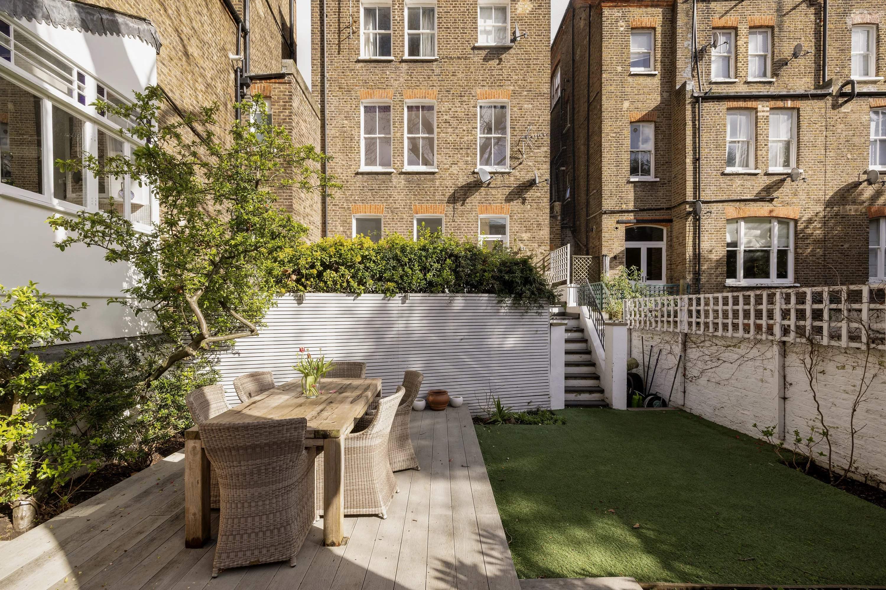 Set within a distinguished 19th-century terrace on Mornington Avenue, this two-bedroom apartment offers a refined sanctuary of classic design and contemporary comfort. The spacious reception room, with its soaring ceilings, decorative cornicing, and a striking Carrara marble fireplace, makes a sophisticated first impression. Oak floorboards, a pale colour palette, and tall sash windows allow light to flood the space, highlighting the elegant bay area, ideal for a grand piano or dining setting. The streamlined galley kitchen, with marble-effect subway tiles and pale stone worktops, opens directly onto a private terrace that flows into two levels of garden space - a raised decked area and a lower lawn enclosed by mature planting. The apartment's two peaceful bedrooms are quietly positioned at the rear, both bathed in natural light. A modern bathroom completes the accommodation.