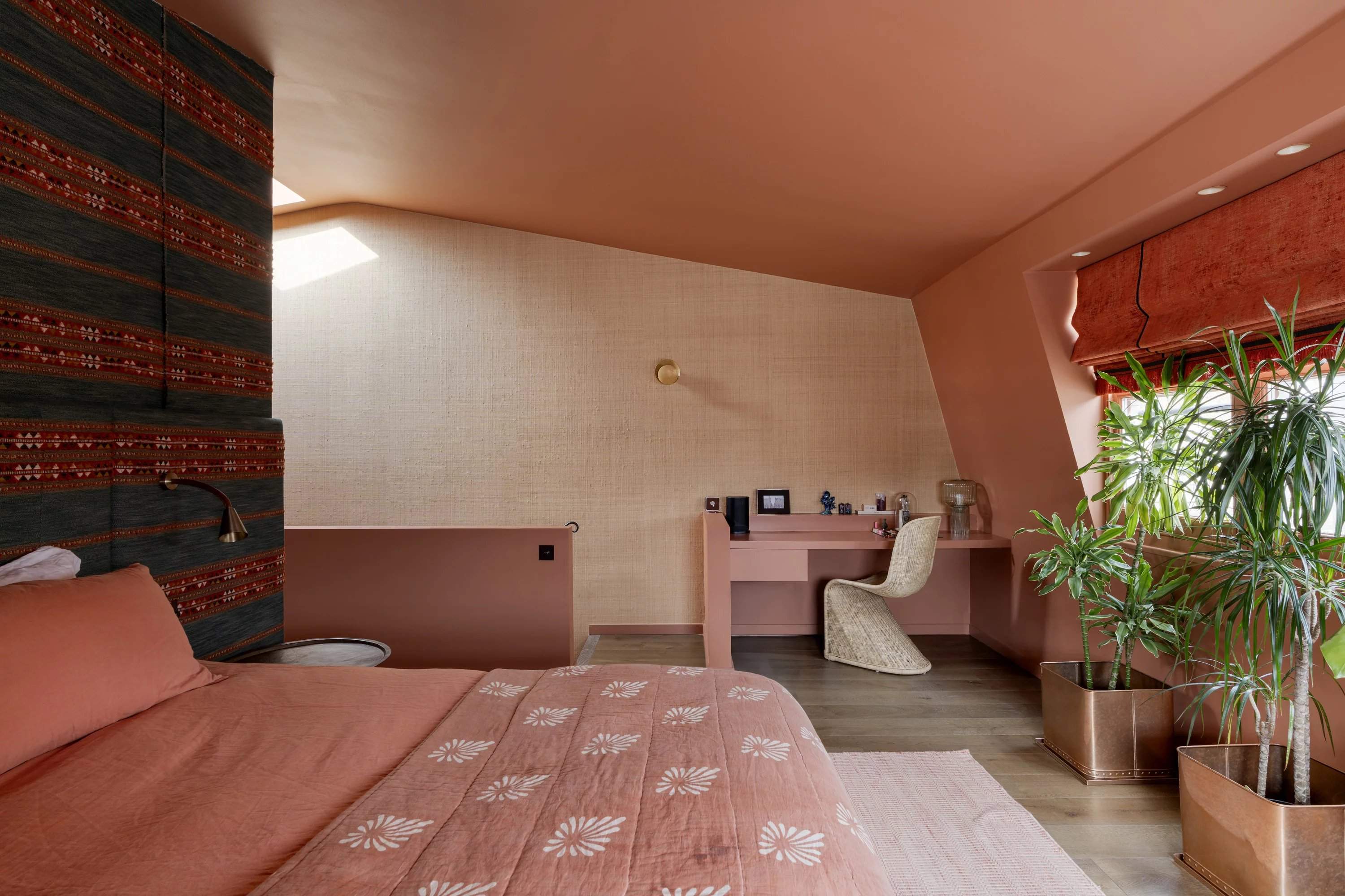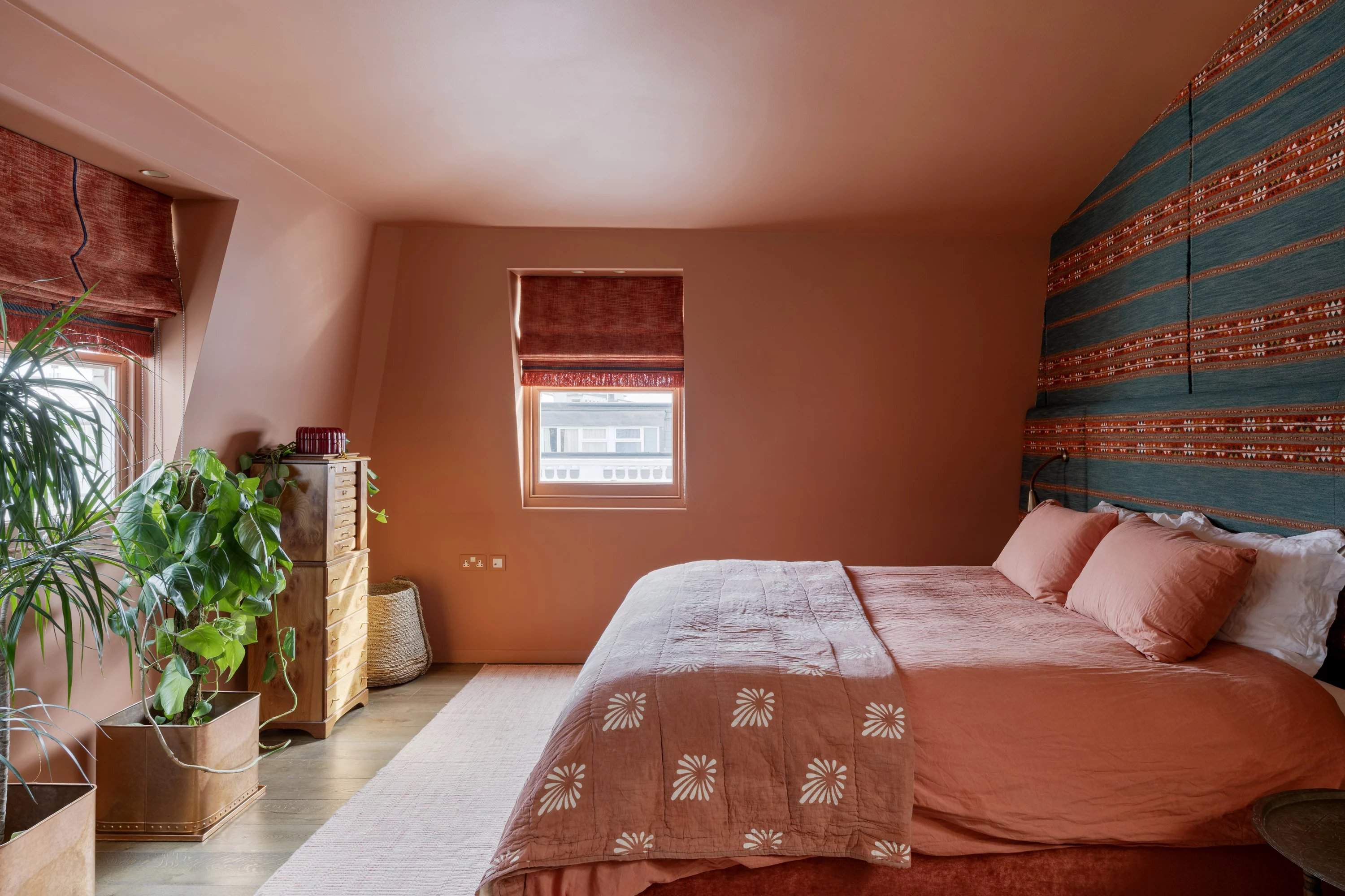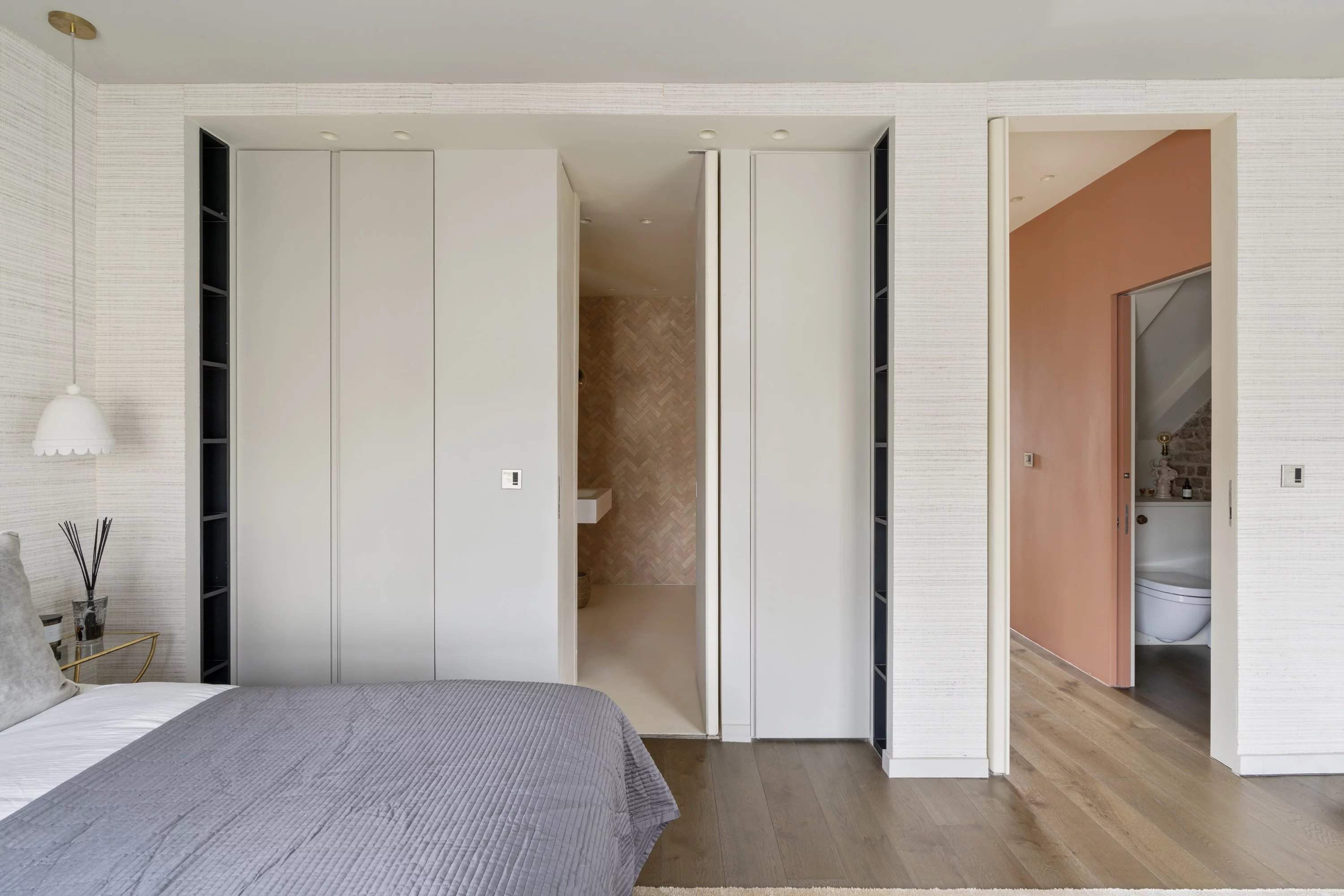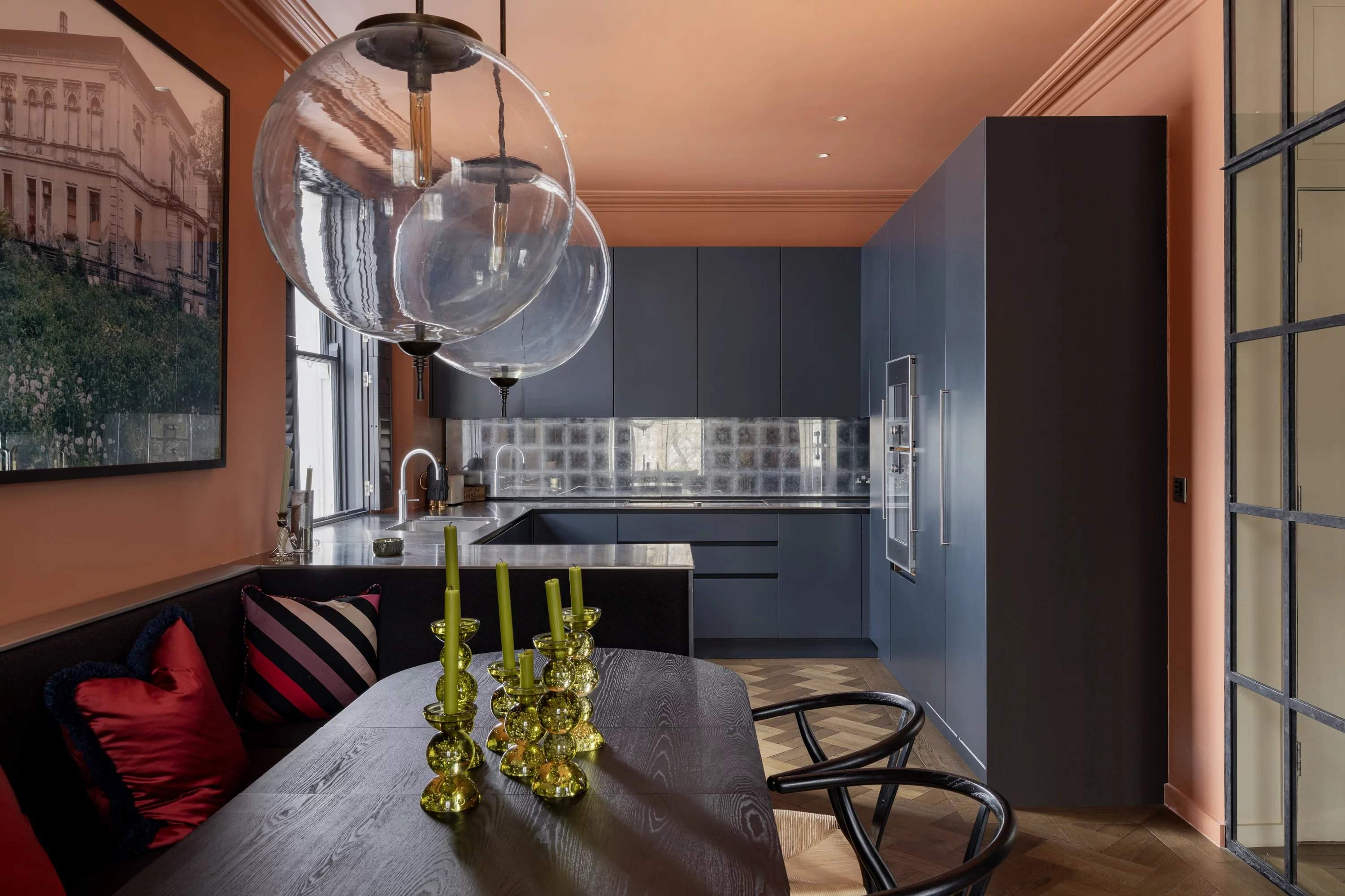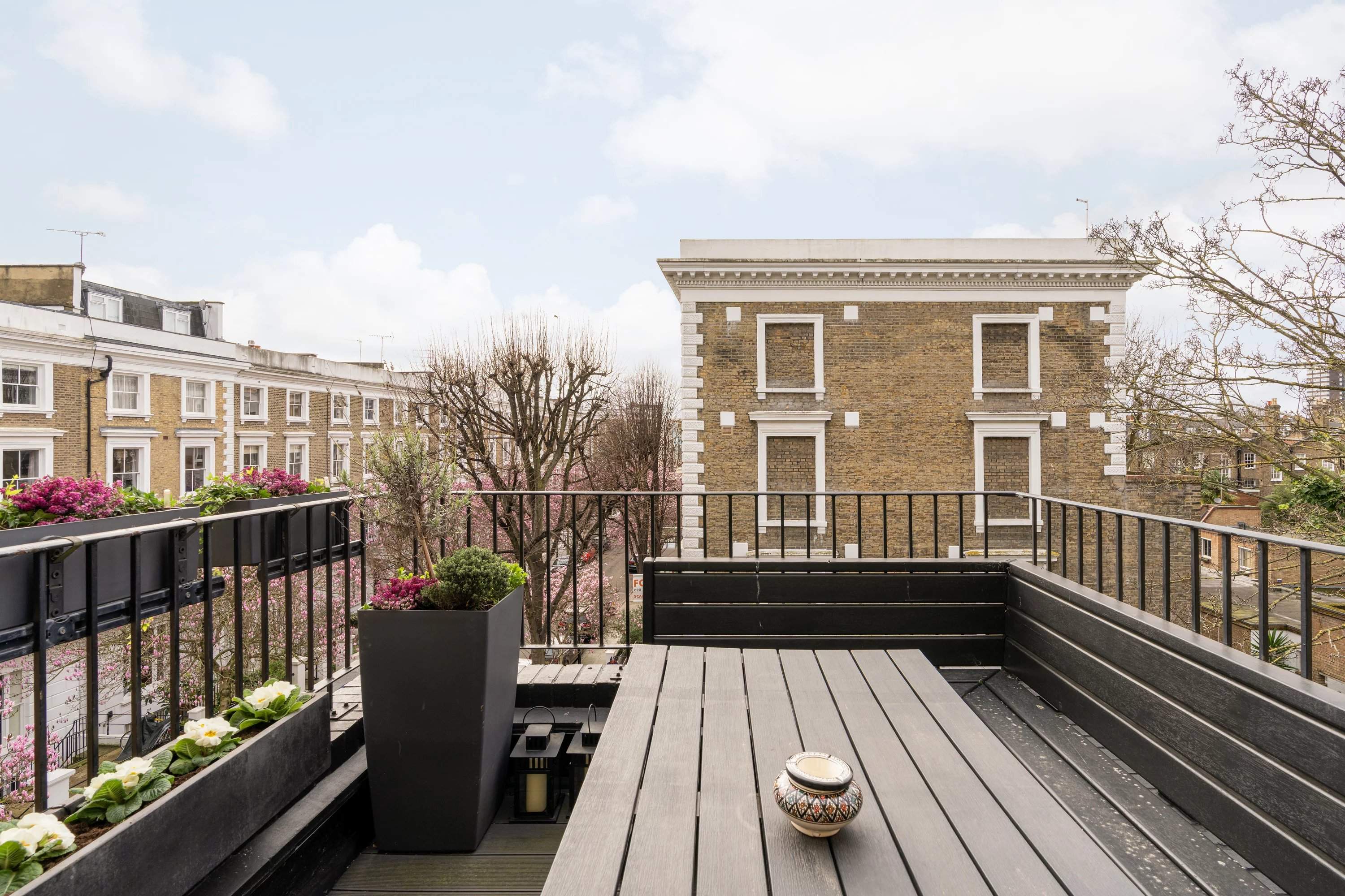 Set on a sought-after garden square, this three-bedroom triplex blends Moroccan influence with refined contemporary styling. Behind a classic façade, interiors by Bettina Pesci introduce warmth, texture and character across three levels. Accessed from the second floor, the main living space is designed for entertaining. A wall of Crittall glazing opens onto an open-plan kitchen and reception room, where rich navy cabinetry, stainless steel worktops and Gaggenau appliances create a sleek culinary setting. Banquette seating and a bespoke bookshelf with integrated lighting define a relaxed lounge area, ideal for dining or unwinding. Above, a decked terrace offers an inviting outdoor extension. Two bedrooms occupy the third floor, including a spacious en suite room and a second versatile space suited to a study or guest room. The principal suite spans the top floor, where Moroccan-inspired detailing, a FURL bed and Porta Romana lighting create a tranquil retreat. A walk-in wardrobe and skylit en suite with a freestanding bath and rainfall shower complete the space.