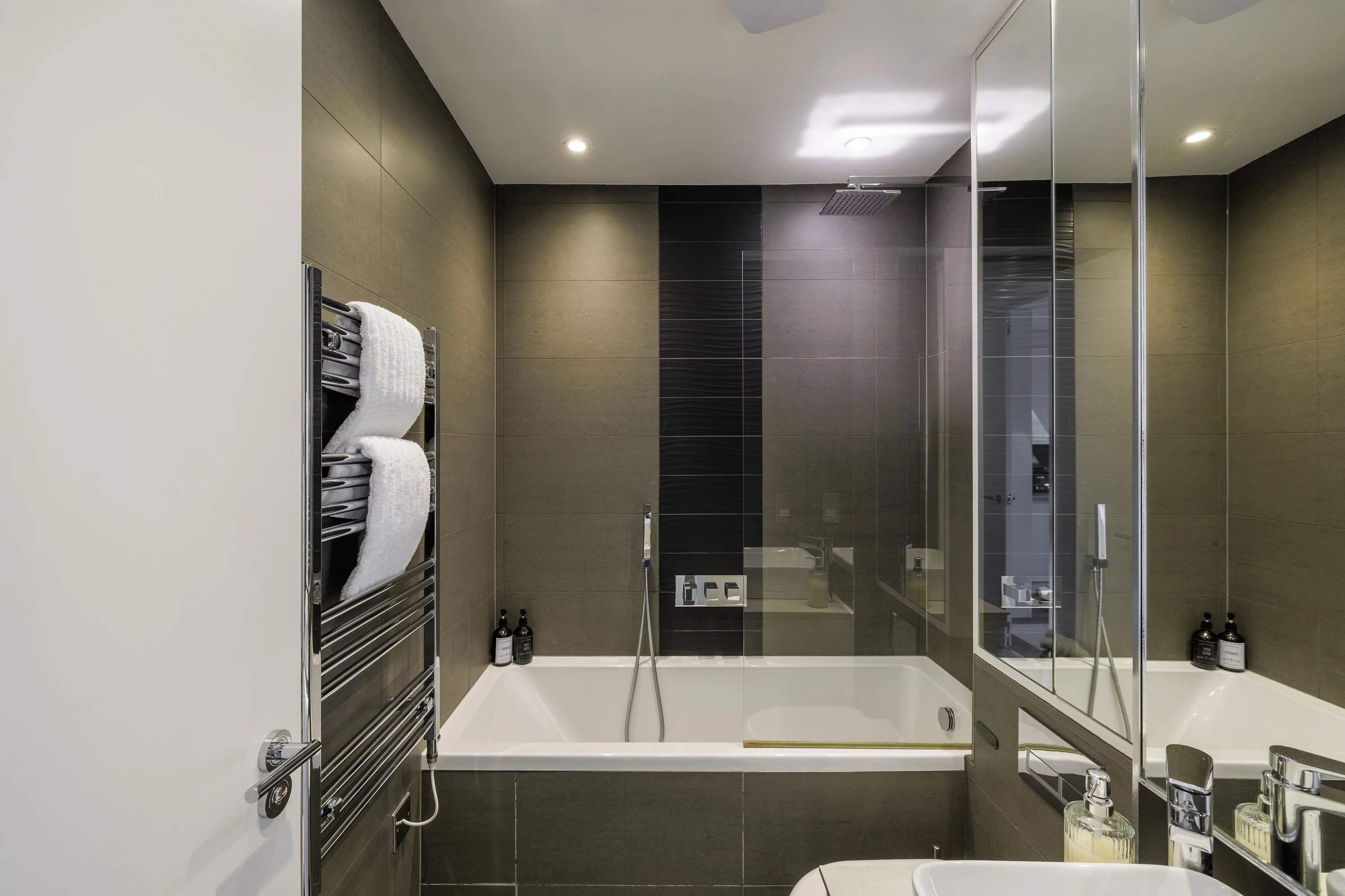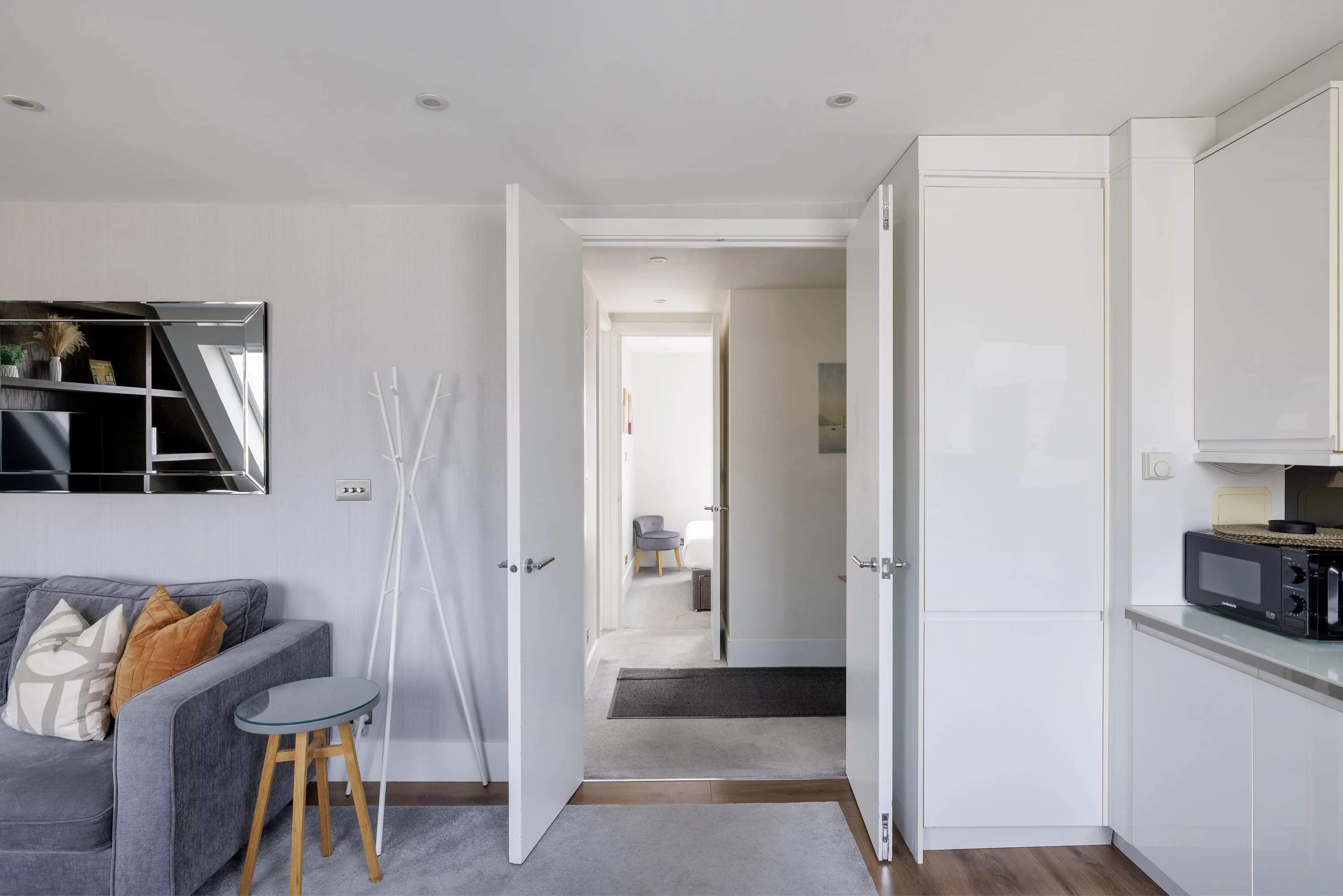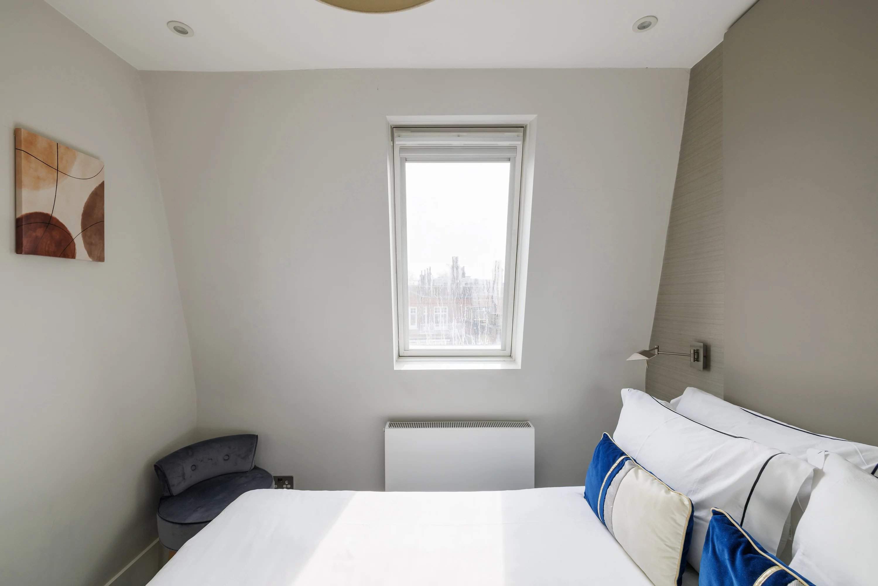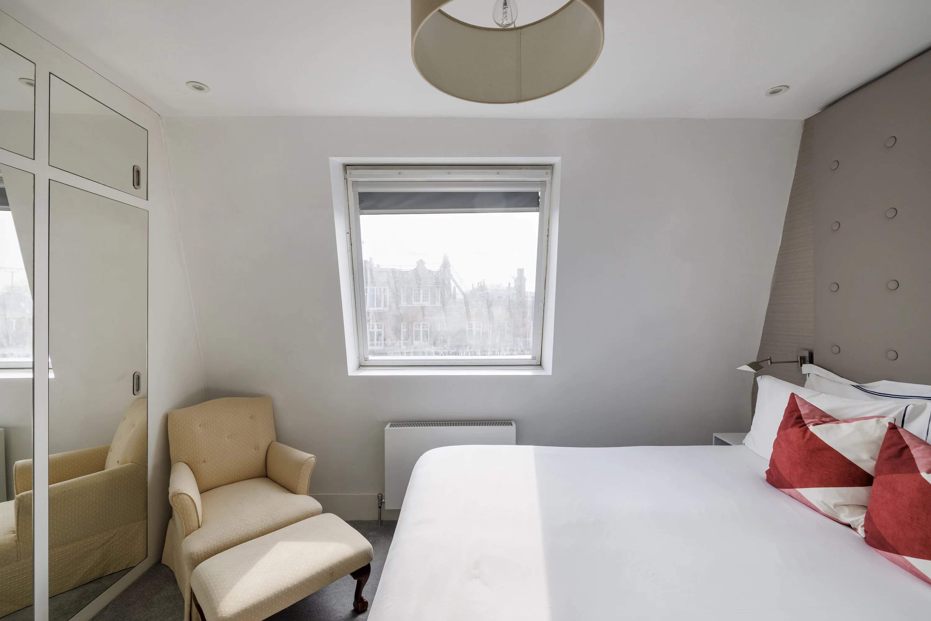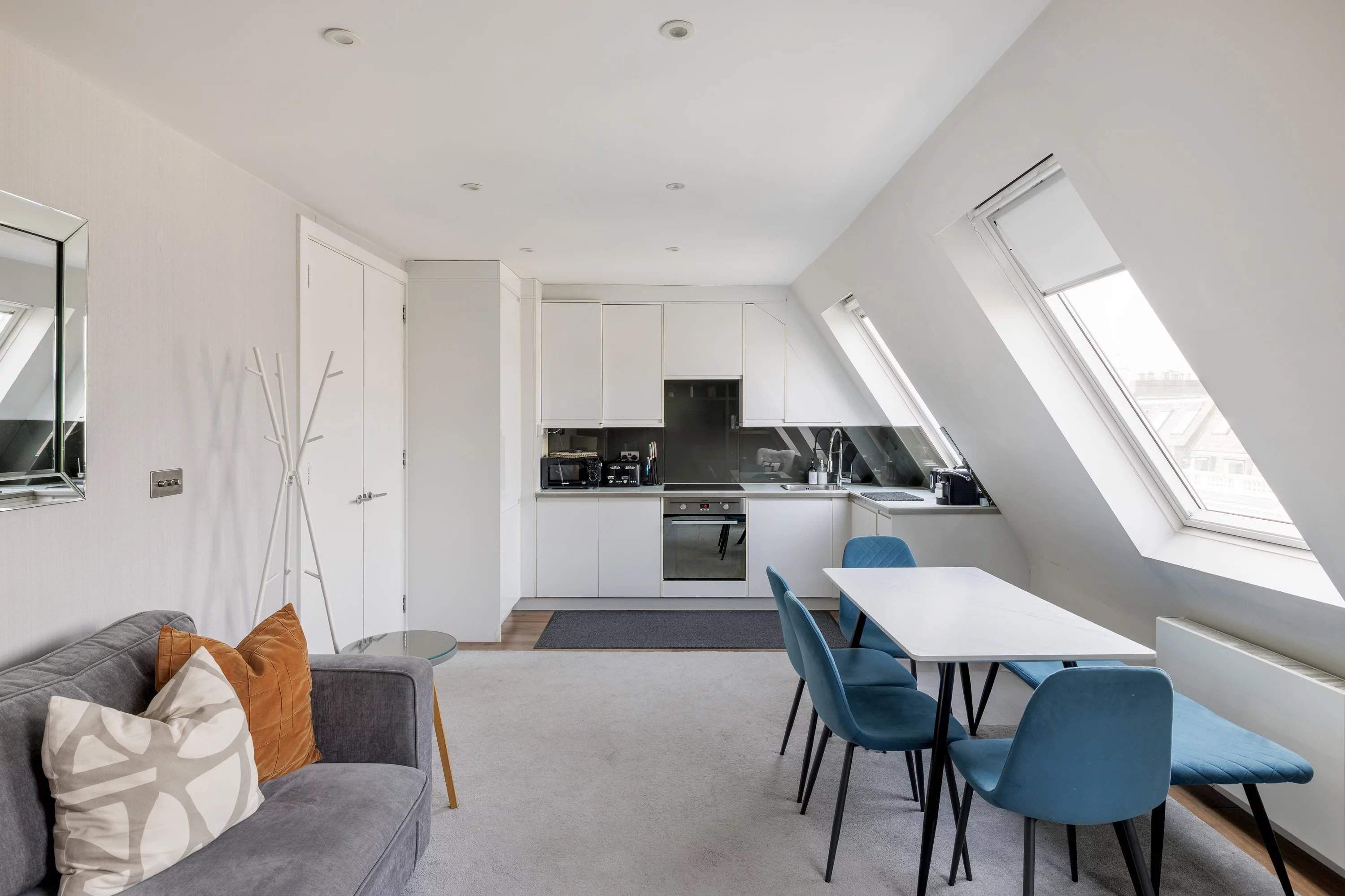 Manson Place is a handsome Victorian mansion block with a yellow-brick and stucco façade, decorative cornicing and a colonnaded entrance, set moments from the heart of South Kensington. This fifth-floor, two-bedroom apartment blends period charm with a modern interior. The open-plan reception room is filled with natural light from large skylights set into the sloped roof, highlighting a neutral palette. A full-width oak shelving unit adds warmth, while the living and dining areas sit comfortably beneath the angled ceiling. The adjoining kitchen features handleless white cabinetry, a mirrored splashback, stone worktops and fully integrated appliances for a sleek, streamlined finish. The principal bedroom continues the calm aesthetic, with mirrored built-in wardrobes, a bright window and an en suite bathroom finished in oversized tiles and a rainfall shower. A second bedroom offers views over the surrounding Victorian streets and is styled with a full-height upholstered headboard. A separate bathroom, accessed from the corridor, contrasts with a darker material palette, complete with a bathtub and chrome radiator.
