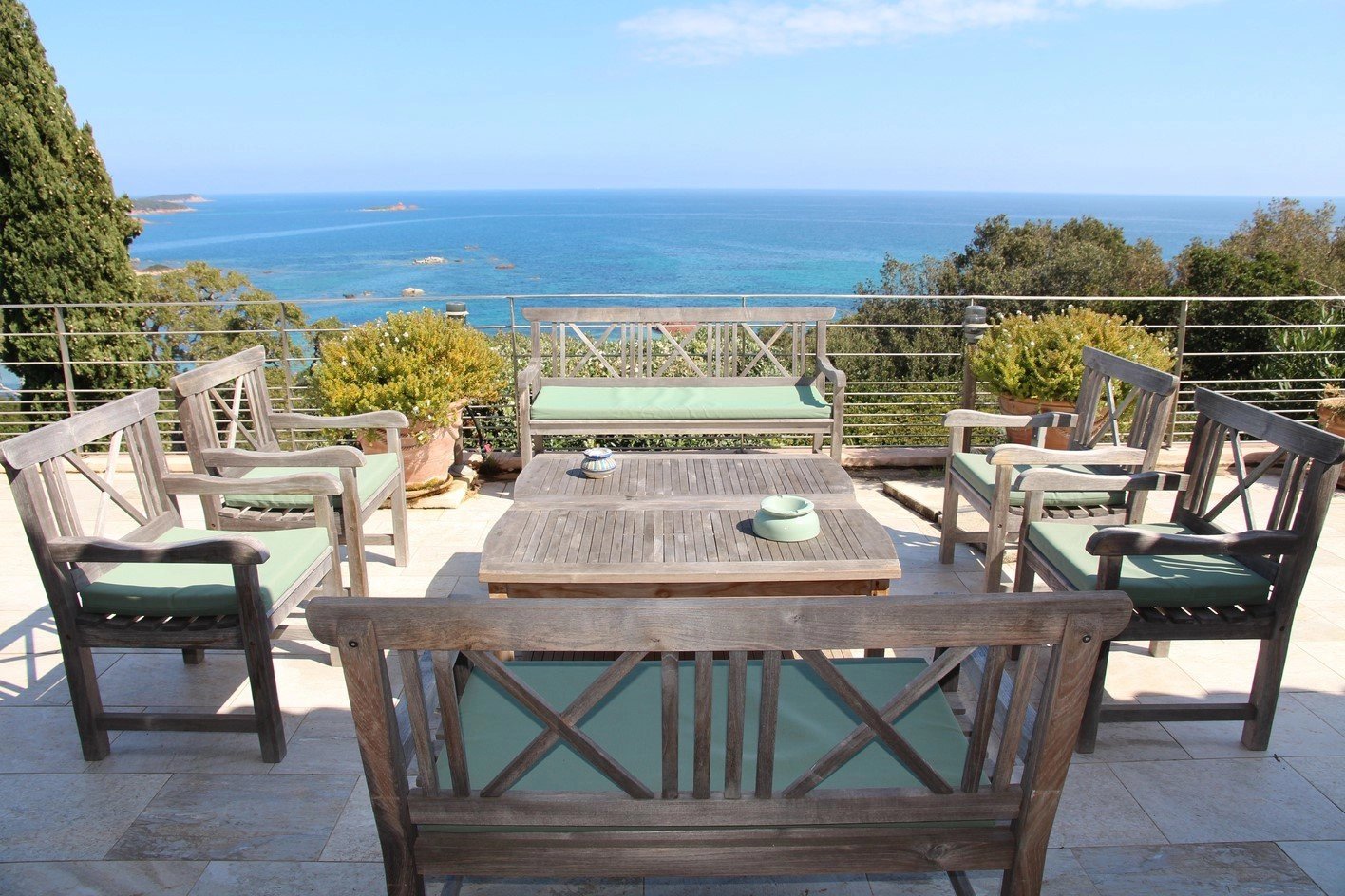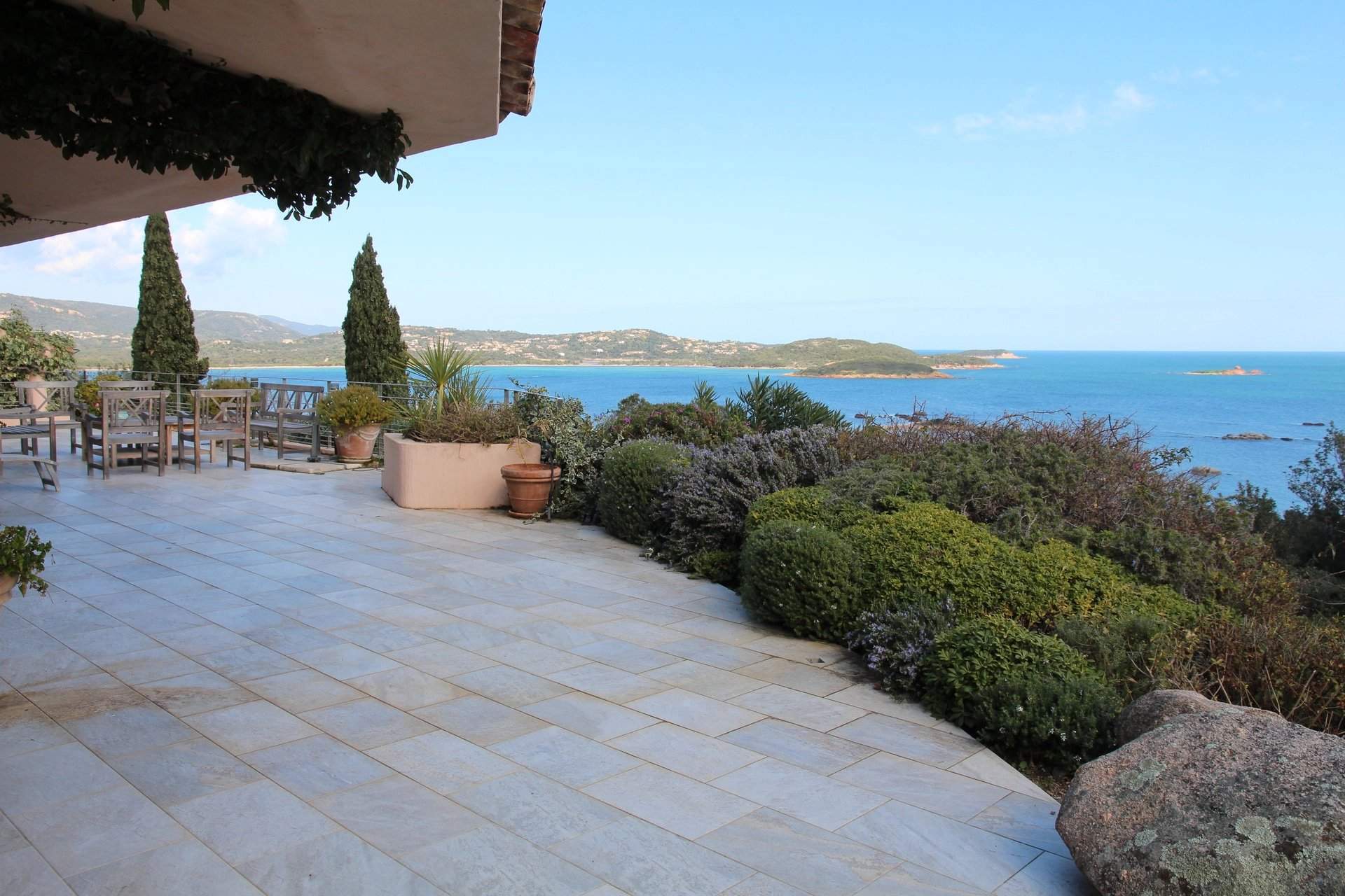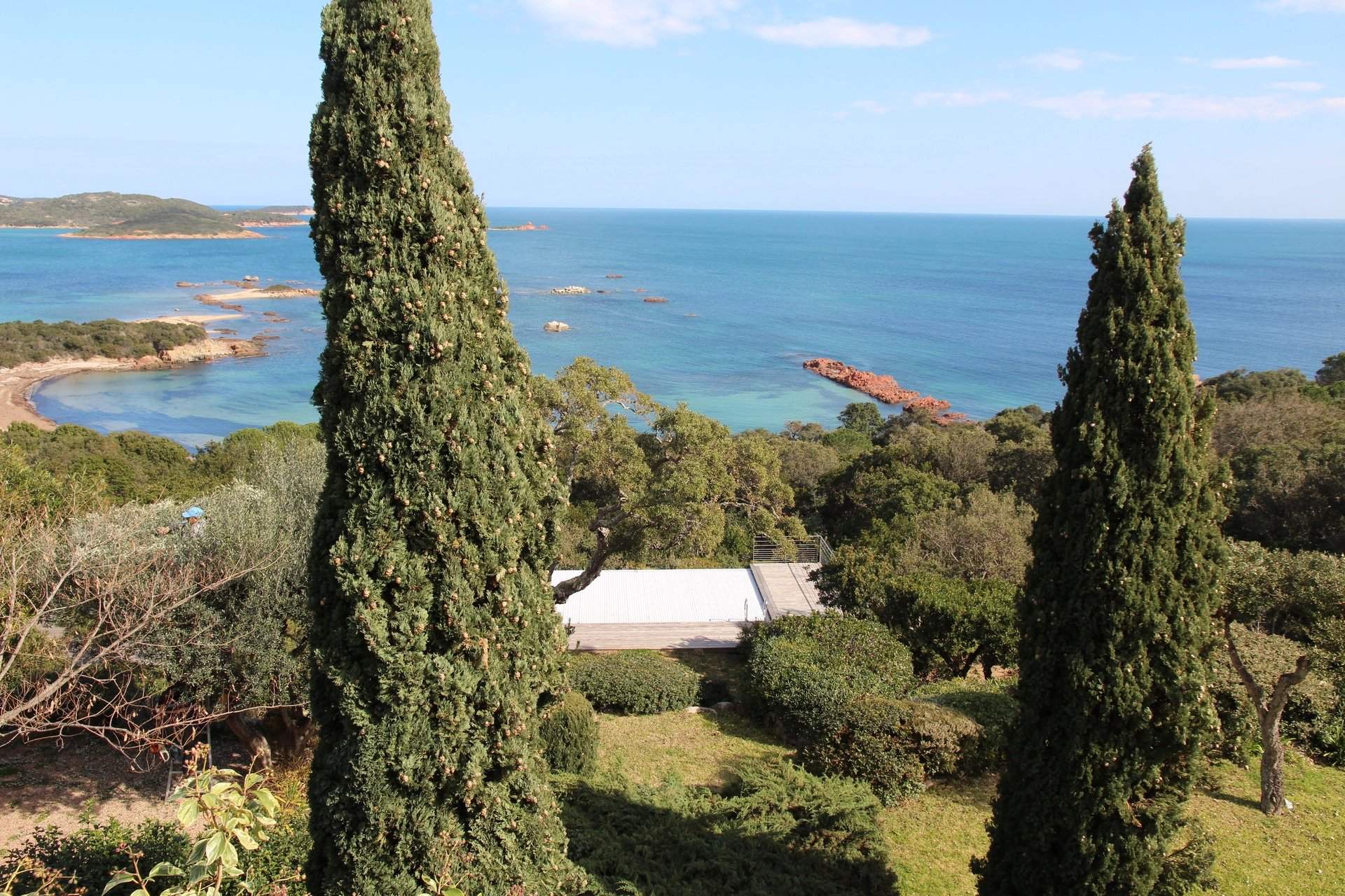 RL197 - L'Asphodèle Located in the heart of the Domaine de la Tour, between the beaches of Cala Rossa and the Benedettu Peninsula, this property offers sea views and is set within a garden planted with Mediterranean species. With approximately 3,767 sq.ft of living space, the villa is organized around an open living area, complemented by a separate space for television and reading. The fully equipped kitchen extends onto a terrace with sea views, while a second, shaded terrace provides a comfortable outdoor space throughout the day. The house includes 7 bedrooms with en-suite bathrooms, including a master suite on the upper floor with a full bathroom, as well as a staff bedroom. Outside, the garden planted with local species leads to an infinity pool measuring 56 x 17 ft, oriented towards the sea. A path also provides access to a beach reserved for Domaine residents, reachable on foot or by boat. Located close to the center of Porto-Vecchio, the property offers a quiet setting within the estate. Included services: regular housekeeping, bed and bath linen, pool linen, and personalized concierge service. Information on risks affecting this property is available on the Géorisques website: www.georisques.gouv.fr