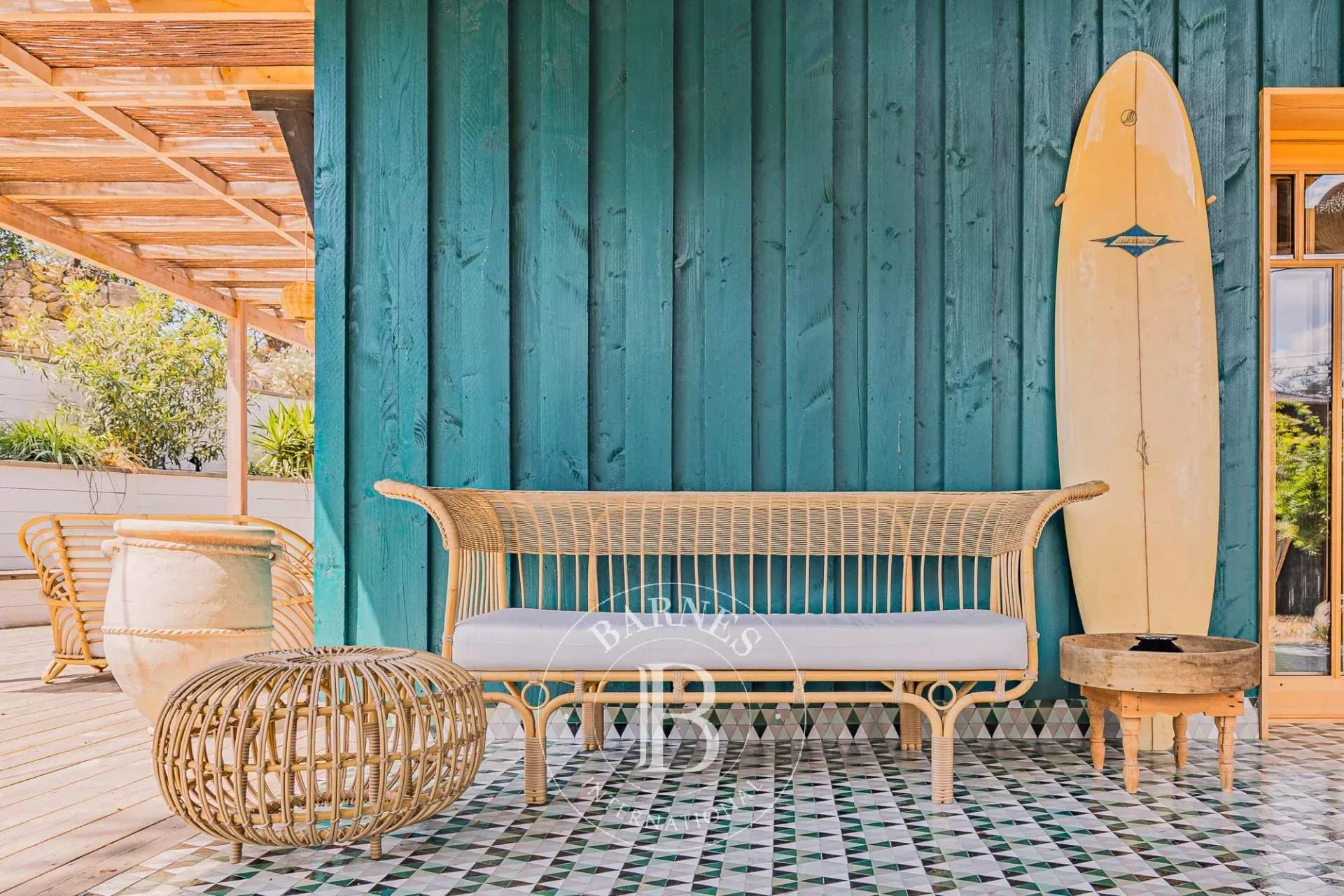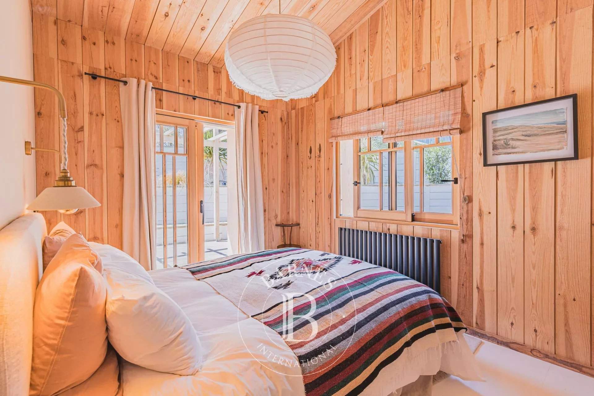 BARNES Cap Ferret presents an exceptional property nestled in the Horizon district, a stone's throw from one of Cap Ferret's finest surf spots. A truly confidential address in the heart of the Bassin d'Arcachon, Surf Lodge invites you to enjoy a unique vacation in a chic, relaxed atmosphere, just a few steps from the beach, the center of Cap Ferret, the market and the village's popular restaurants. Conceived as a refuge between pine forest and golden sand, this exceptional property comprises five independent lodges, offering privacy and conviviality in a refined, natural setting. Each lodge has been designed to offer a living space in its own right, while preserving the overall harmony of this unique setting, where you can circulate along small, undulating paths lined with vegetation. The first lodge features a living room, dining room and open kitchen, all in a warm and welcoming atmosphere. Two bedrooms share a bathroom. A vast wooden terrace facing south-east completes the ensemble, with a covered dining area, a lounge area for aperitifs and several sun loungers. The second lodge features an independent suite with private shower room and terrace, while the third offers two bedrooms, two bathrooms and a dedicated terrace. The last lodge, designed as the Master Bedroom, includes a living room with kitchenette, a comfortable suite with en-suite shower room, and a private terrace.