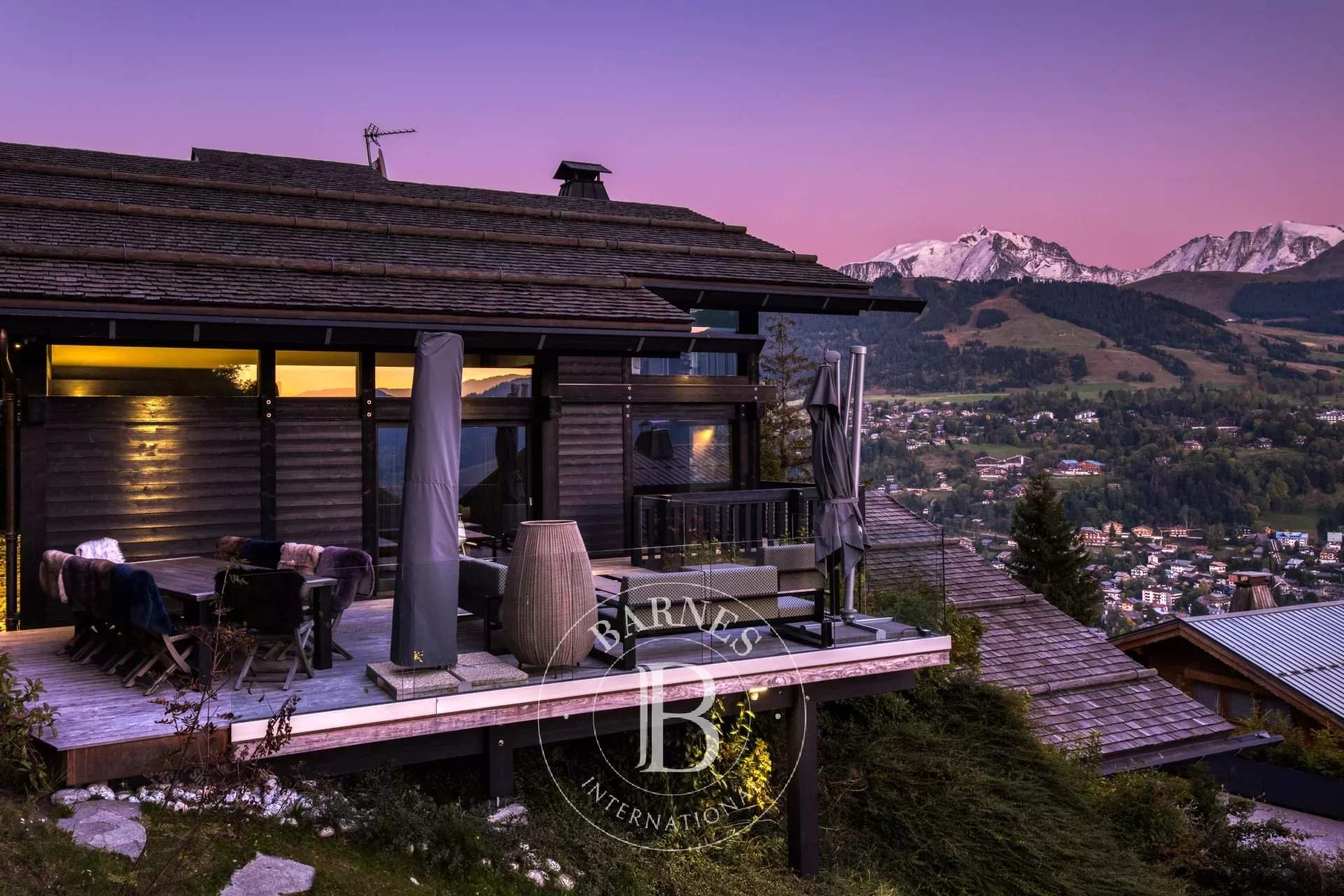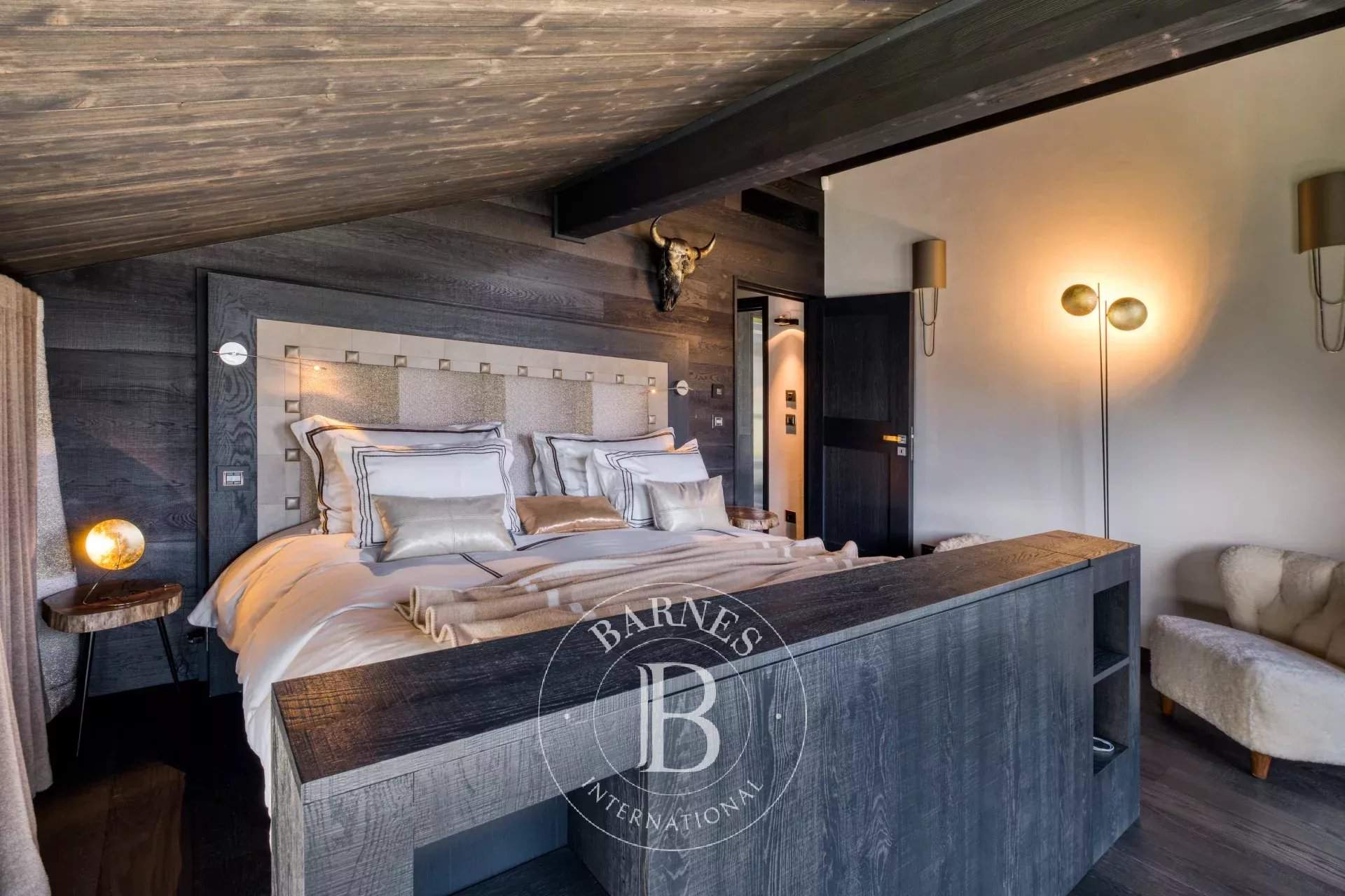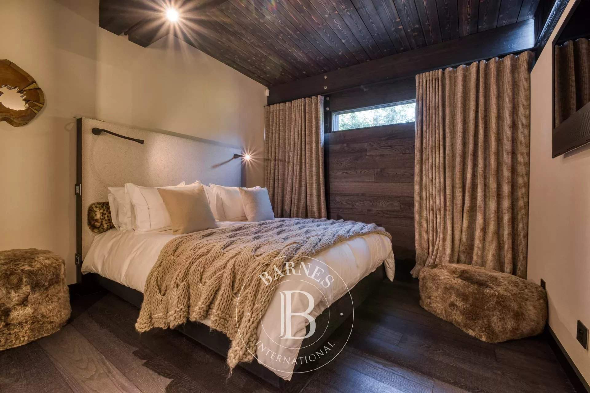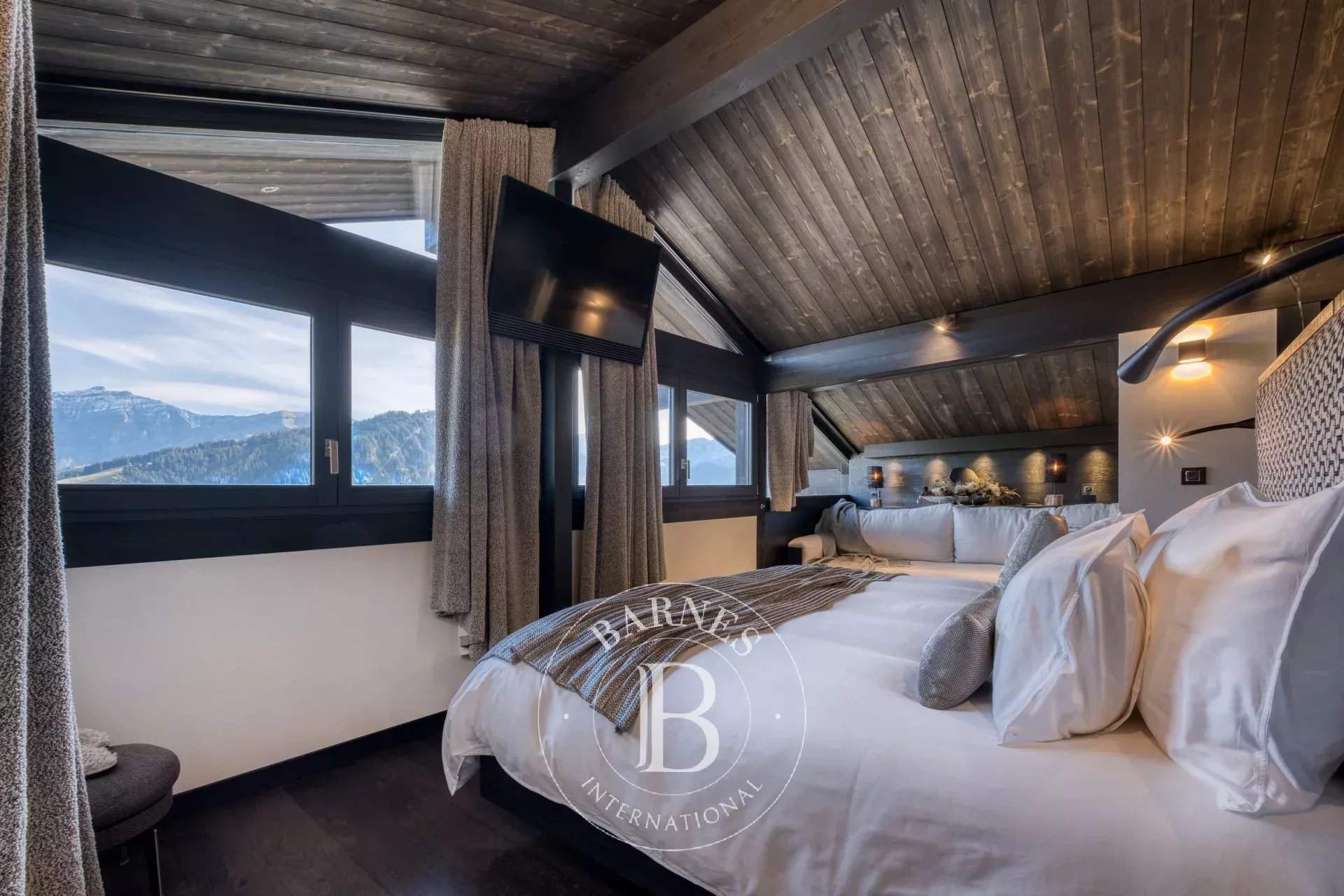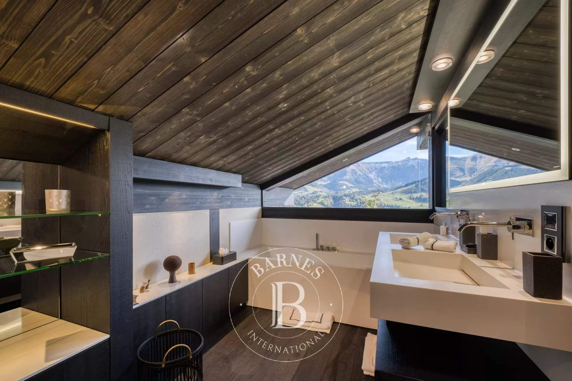 Located on the heights of Le Jaillet, in a preserved natural environment, Chalet Diamant Noir stands among the most emblematic properties in Megève. Comprising two interconnected chalets, it offers generous volumes and features 9 bedrooms, including 7 en-suite bedrooms, providing exceptional comfort for families and friends. South-facing, it enjoys optimal sunlight and breathtaking views of Mont Blanc. The amenities live up to the address, with an indoor swimming pool, a wellness area and a cinema room, completing this exceptional chalet designed for unforgettable mountain stays. Photo credits: studio-bergoend.com / Groupe Dunoyer