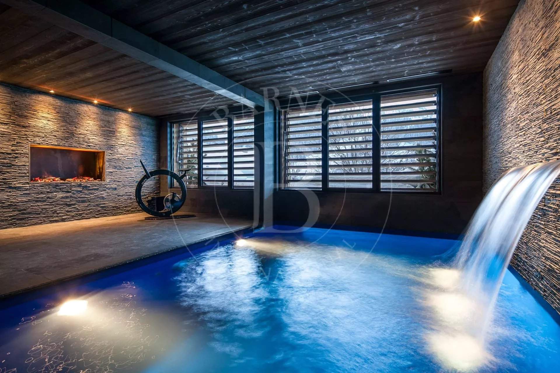 From 45 500 euros/week. Set in a prime location in Méribel - just 60 m from the slopes, this magnificent chalet built in 2012, is a fabulous choice for a luxury family ski holiday. The Lodge SHL offers a Master bedroom, 3 guest bedrooms and 2 bedrooms for children. It can sleep up to 15 people. The principal features of the Lodge SHL Garden level 2 secured heated garages Ground floor Entrance hall Ski room Fabulous wellness area with counter-current swimming pool, hamman and relaxation area Impressive wine cellar built into the mountain rock Lift Level 1 3 Double bedrooms with en suite bathroom (bath and separate shower) 2 Bedrooms for children (each with 4 beds) with en suite bathroom Laundry room Lift Level 2 Hall Large living room with fireplace, bookcase and mezzanine Dining room / kitchen for 15 people Professional kitchen and cellar 2 Small bedrooms for the staff Lift Level 3 1 Master bedroom with en suite bathroom (bath and separate shower) and dressing TV room (convertible into a double bedroom with shower room and toilet) Wifi Services included: upon request