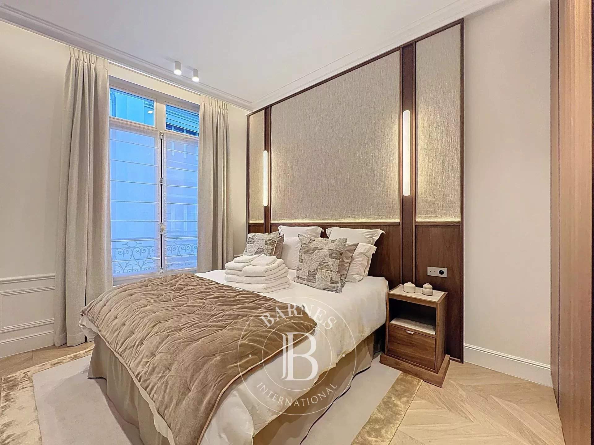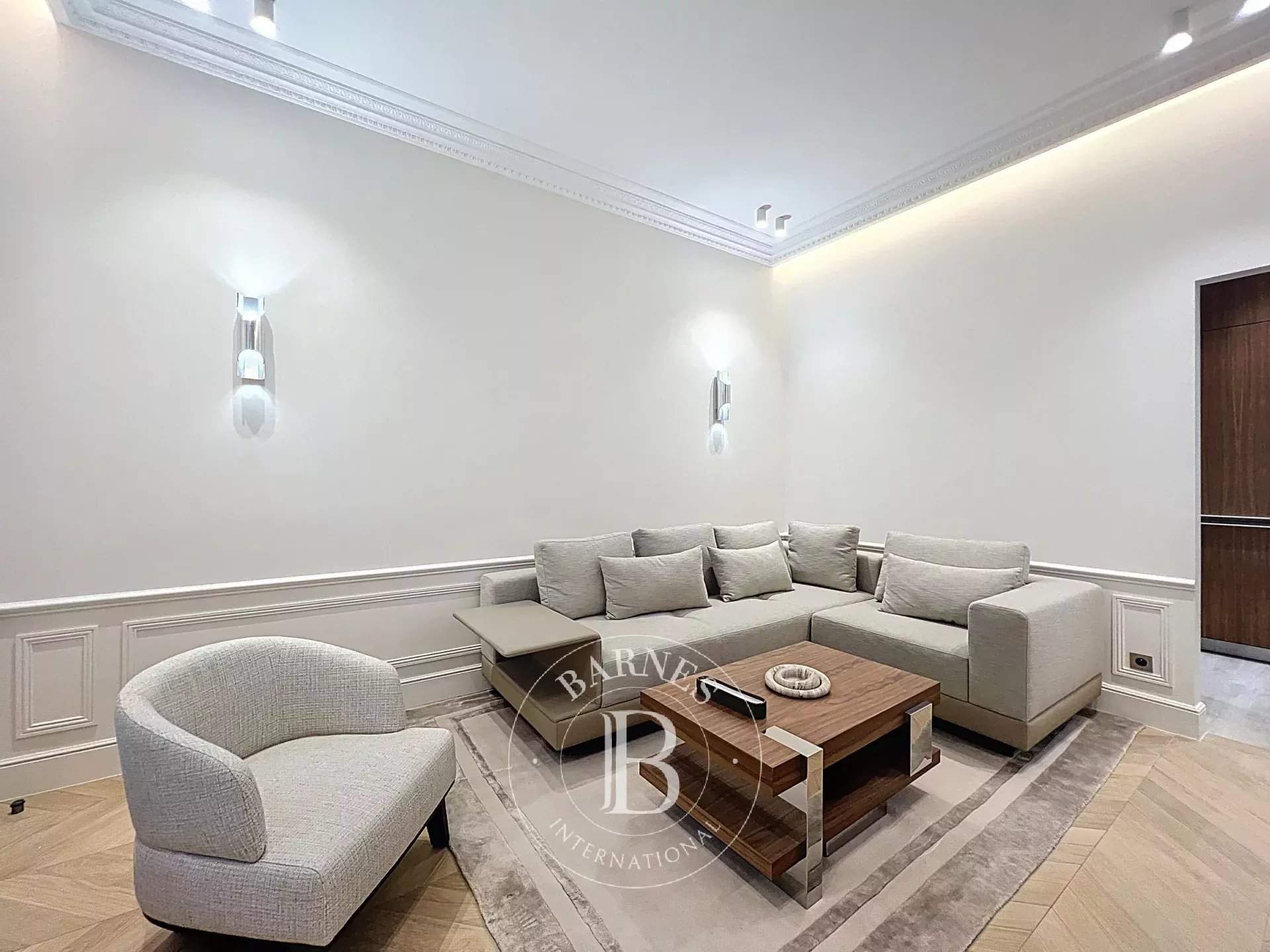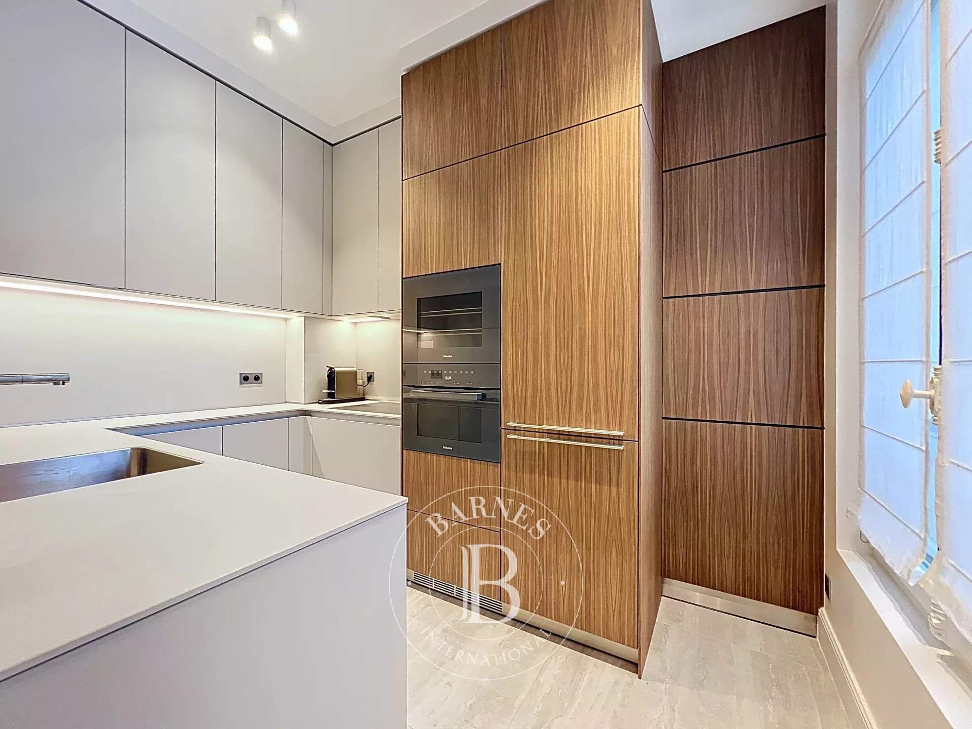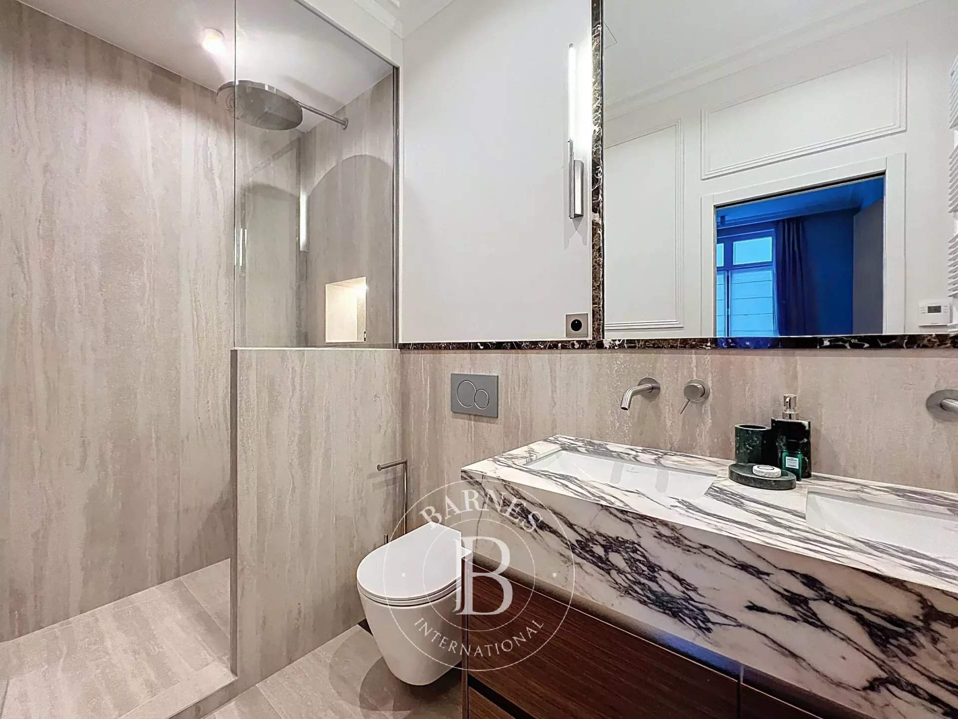 Rue Lamennais - On the third floor with elevator of a magnificent 19th-century building, beautiful apartment with a surface area of 70m², rented furnished. It comprises an entrance hall, a reception room (living room and dining room), a separate fully equipped kitchen, two bedrooms with storage space, each with its own shower room with toilet, a laundry room, and a guest toilet. Concierge service, 24/7 fitness room, air conditioning, bicycle parking, reception area, secure access. Minimum stay of six months. Security deposit: 3 months' rent. Fees payable by the Lessee: 12% of the total rent excluding charges + VAT (20%) Inventory of fixtures carried out by a bailiff, payable by the Lessee