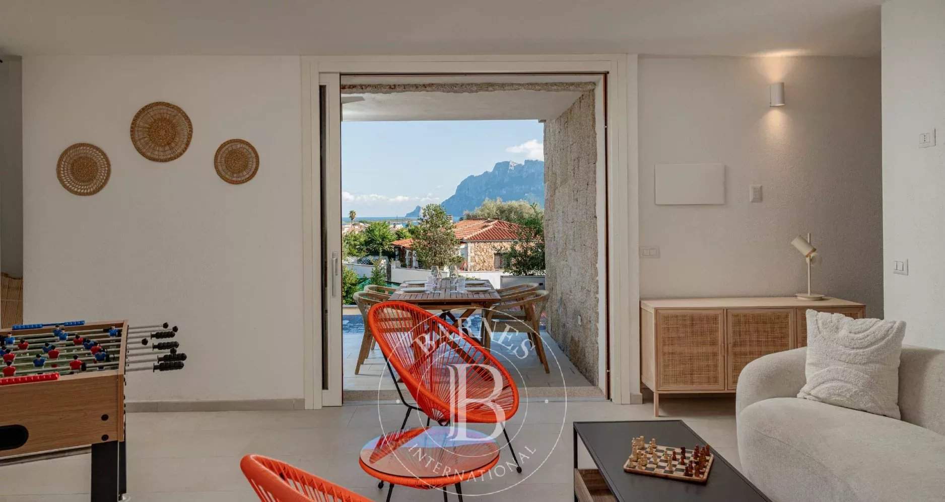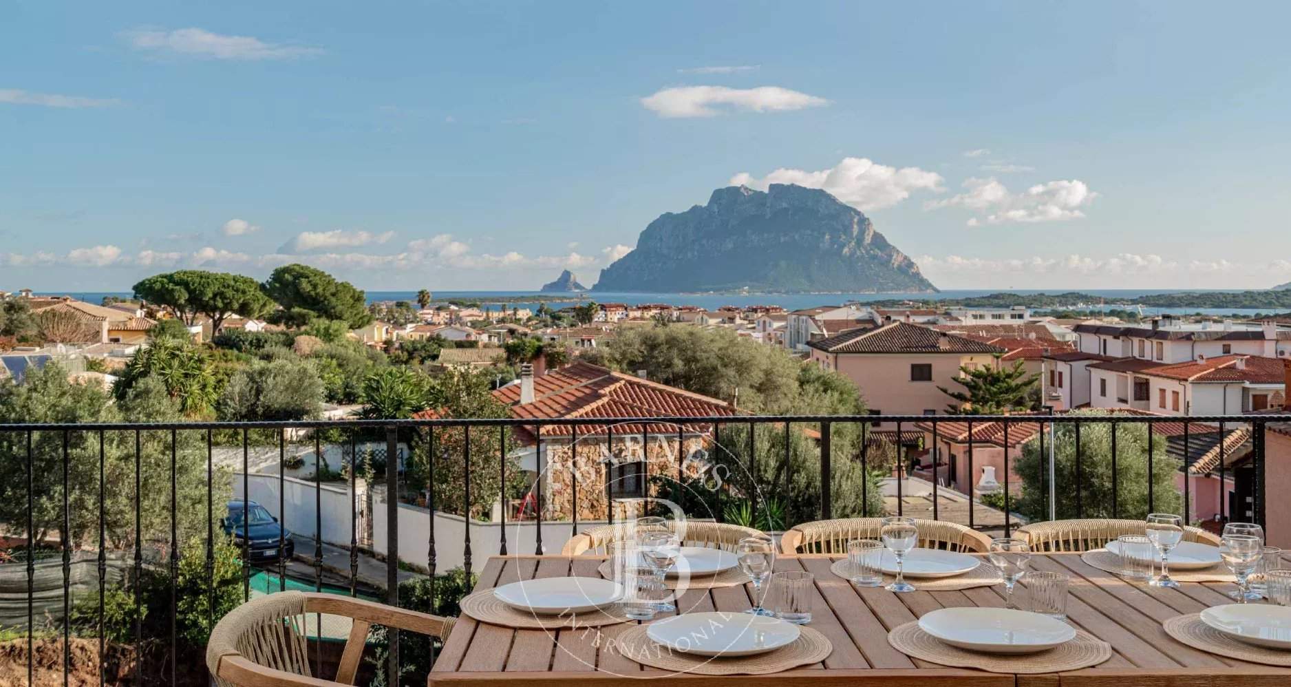 Villa Cielo di Tavolara | Seasonal Rental Nestled in the heart of Porto San Paolo, this exquisite villa offers breathtaking panoramic views of the iconic Island of Tavolara. Perfectly positioned, with energy Class A+, the property provides both privacy and convenience, with easy access to local beaches, shops, and restaurants. This luxurious two-level home combines timeless elegance and modern comfort, featuring an exclusive swimming pool, a private courtyard with ample parking, and a blend of covered and uncovered outdoor spaces. The upper floor boasts a spacious open-plan living area with a kitchenette and dining room, two bedrooms with terrace access, and two bathrooms. The ground floor includes three additional bedrooms, a tavern, a cellar, and two bathrooms, making it ideal for families or entertaining guests. Outside, the property is surrounded by a private garden and terraces. With thoughtful amenities like climate predisposition, solar panel preparation, and an electric gate, this newly built villa combines functionality with style. For further information on this extraordinary villa, do not hesitate to contact us. We will be happy to provide you with more details, photos, and any other informative material you may need to make the best decision for your holiday in Sardinia.