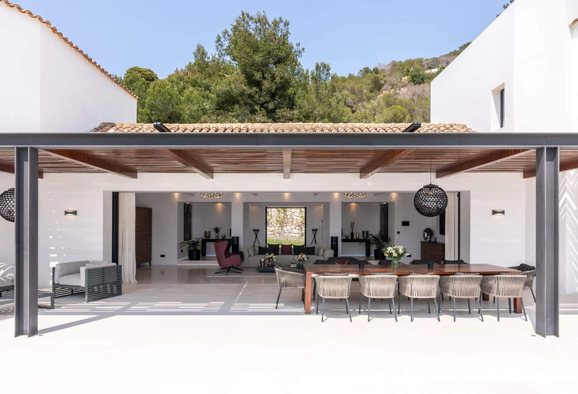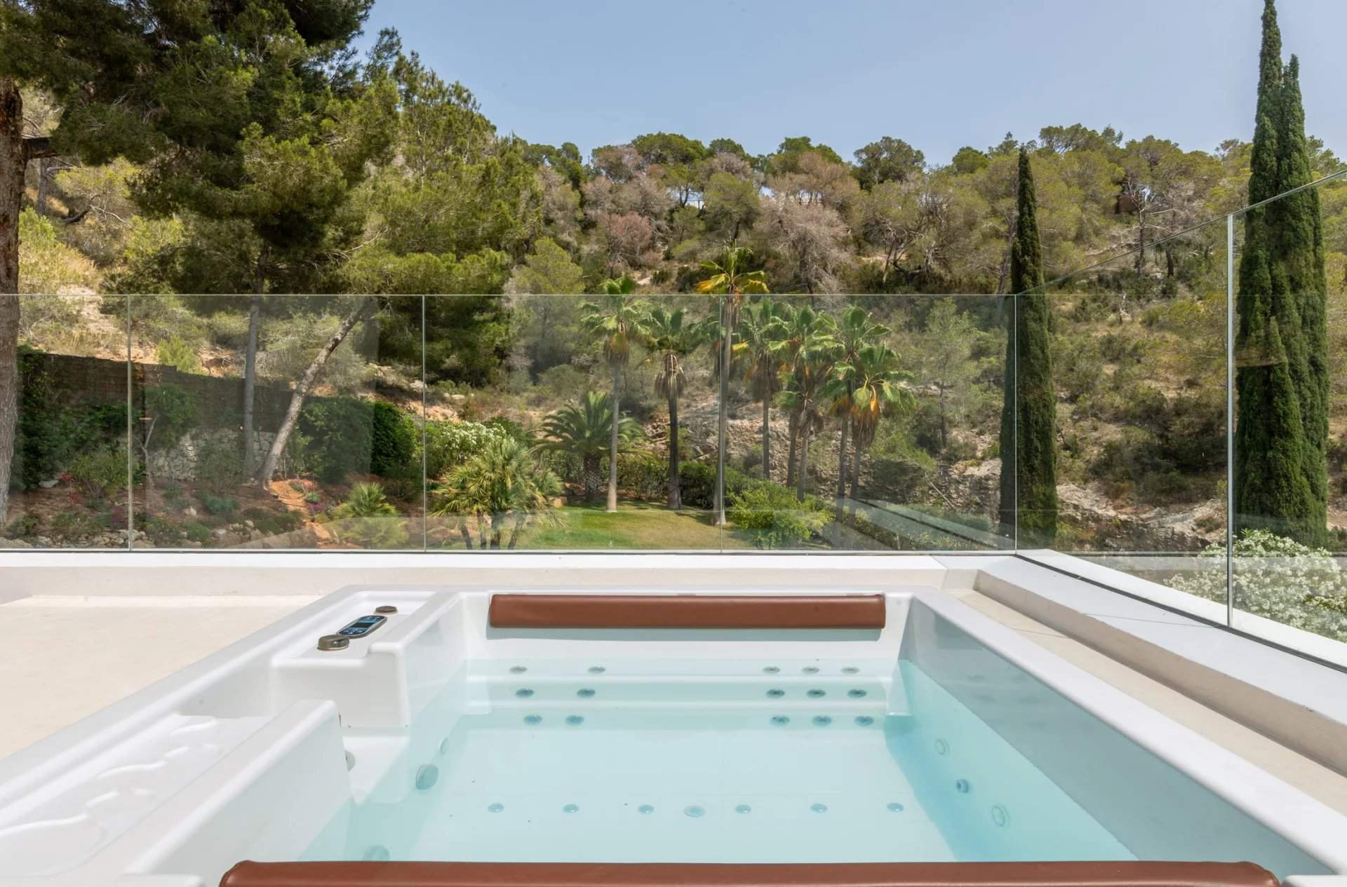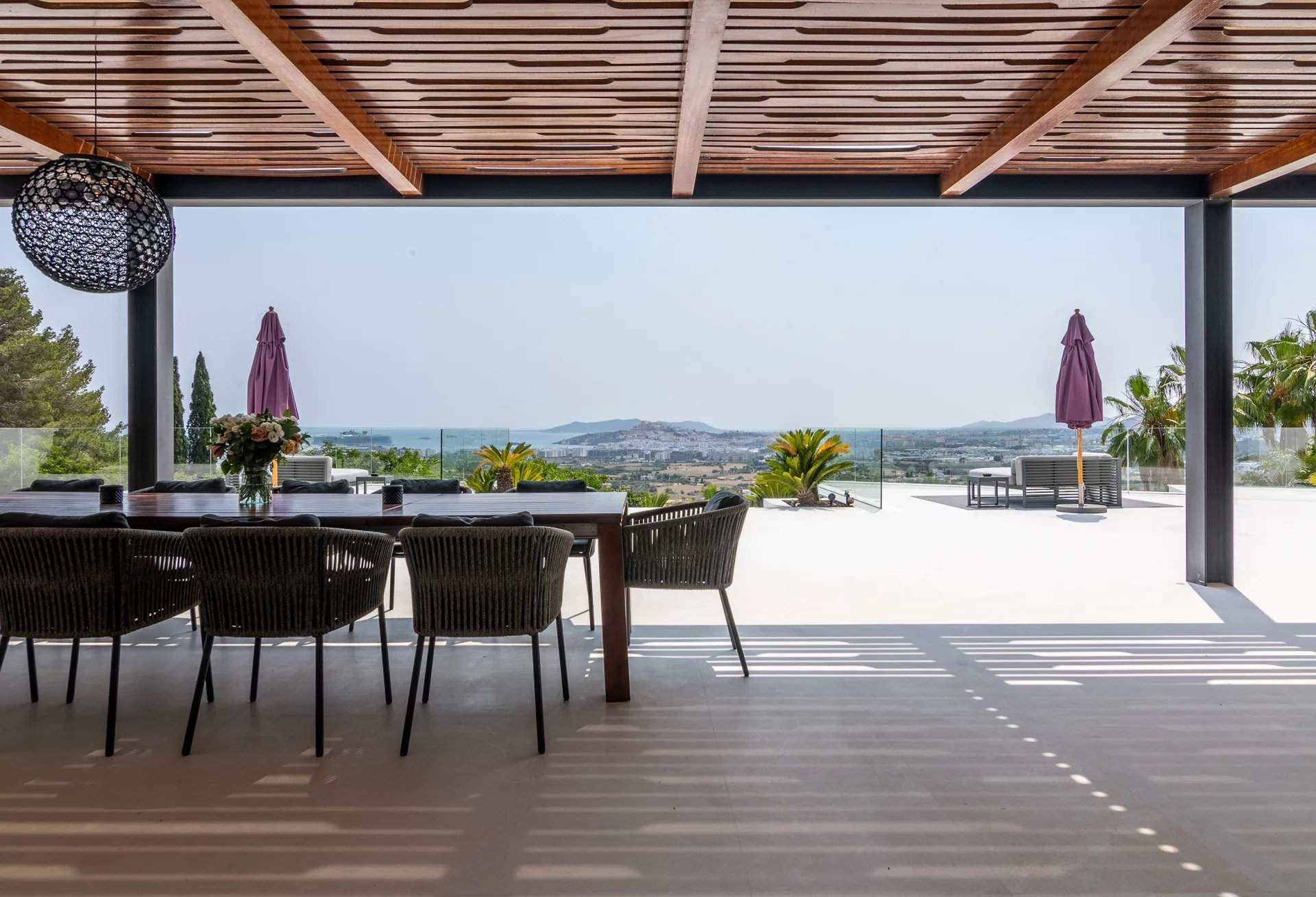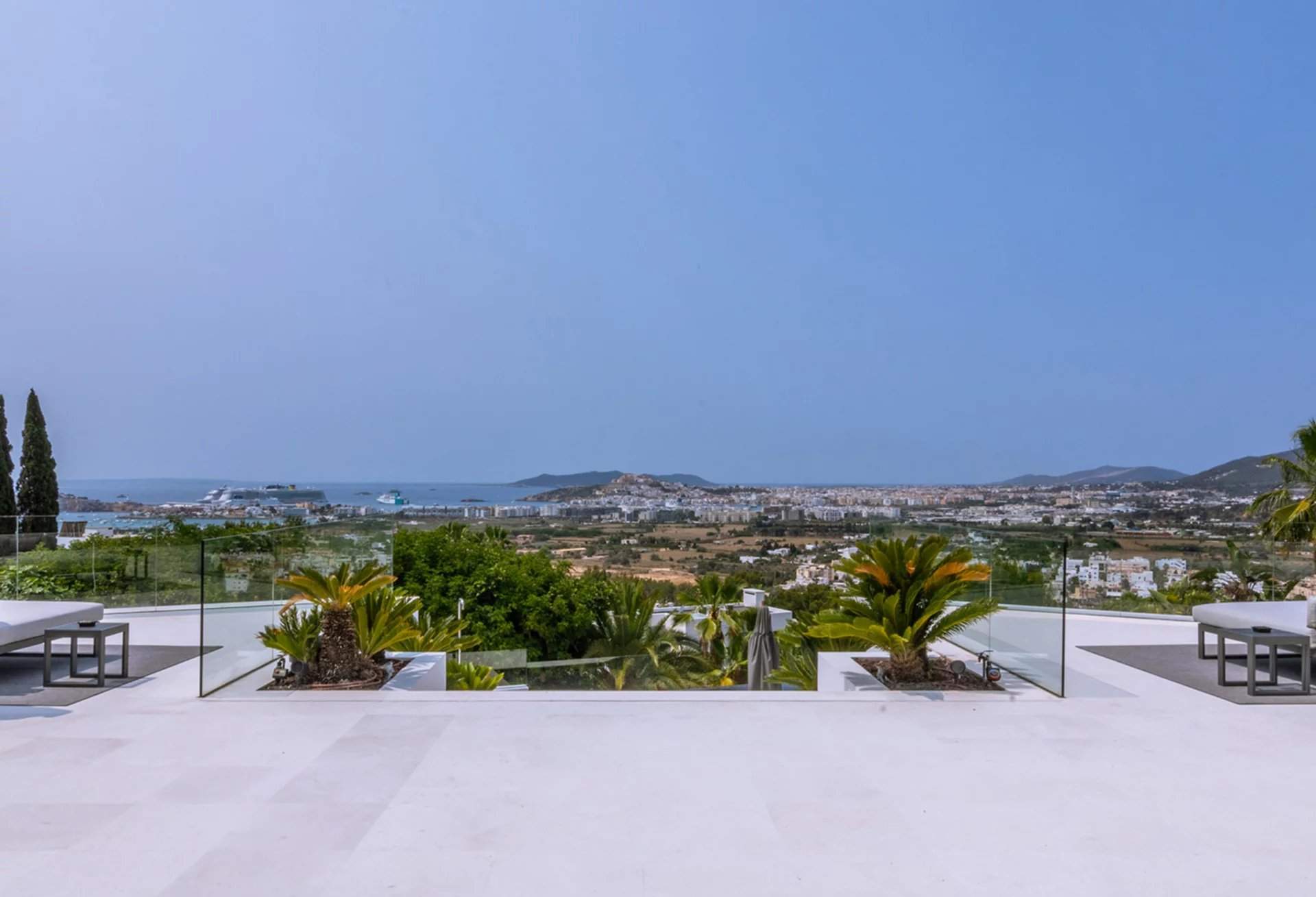 Elevated above Ibiza's coastline, this four-bedroom villa pairs contemporary architecture with sweeping views from Ibiza Town to Formentera. Set within the gated Can Rimbau community, Villa Laguna unfolds with calm, refined interiors. A manicured entrance leads into a light-filled living space framed by full-width glazing. White walls and muted furnishings set a serene tone, while sliding glass doors create a seamless transition to a shaded dining terrace designed for long, al fresco evenings. The kitchen embraces a moodier palette with dark cabinetry, high-spec appliances and an intimate dining area. Integrated LED lighting and a glass-fronted wine wall add a playful contemporary edge. Outside, twin terraces sweep down toward an infinity pool that mirrors the curve of the surrounding hillsides. Palm trees and native planting create a natural sense of privacy, forming a setting made for days spent between sun, shade and water. Four minimalist bedrooms continue the calming aesthetic with stone floors and expansive views. The principal suite features a striking en suite with a freestanding tub positioned to face the horizon. A cinema room and fully equipped gym offer indoor retreat, while a glass-bordered hot tub provides an elevated viewpoint for unforgettable sunsets. Tourist licence: ETV1911-E Jesus - 5 mins Talamanca - 5 mins Ibiza Town - 10 mins Ibiza Airport - 15 mins