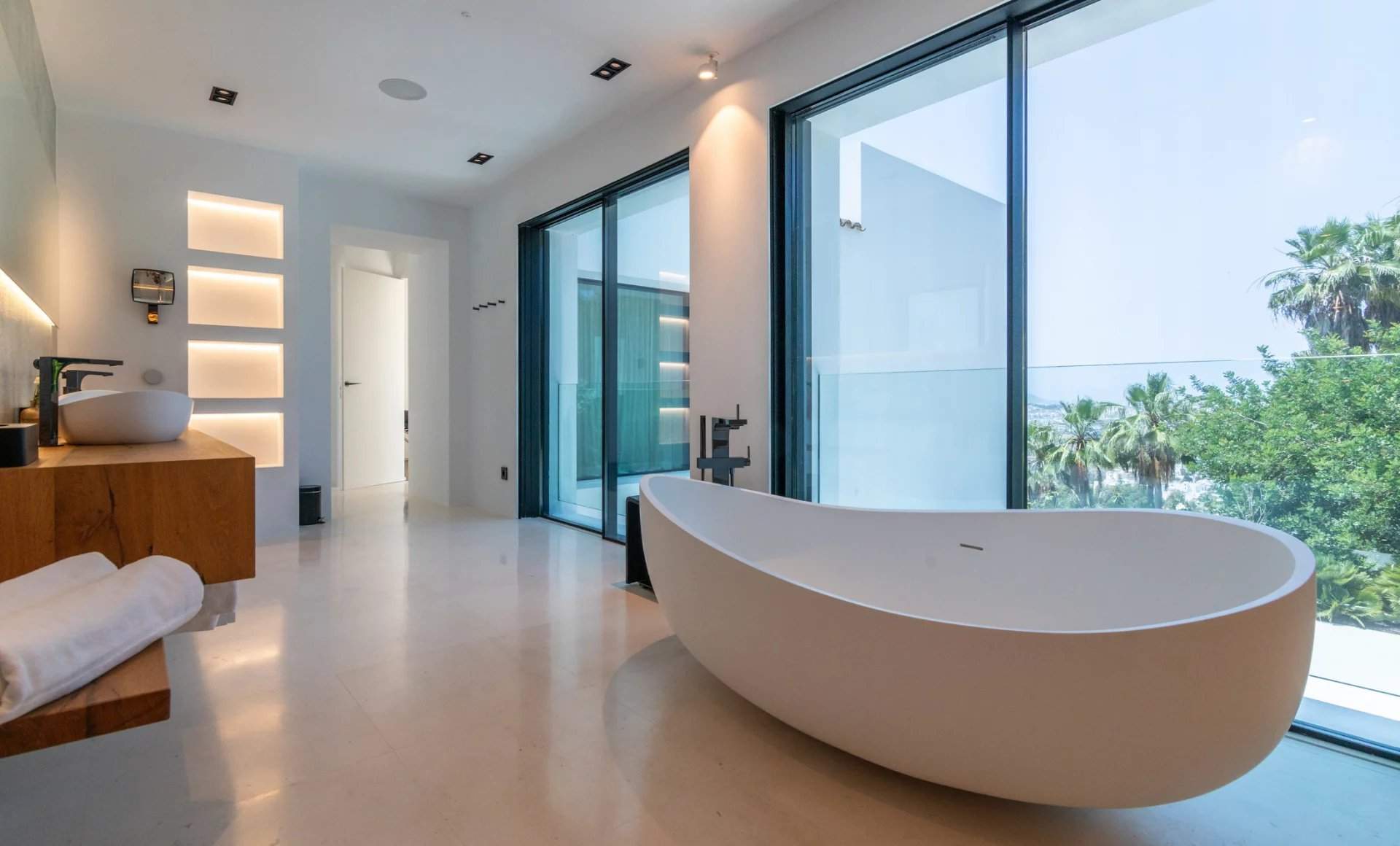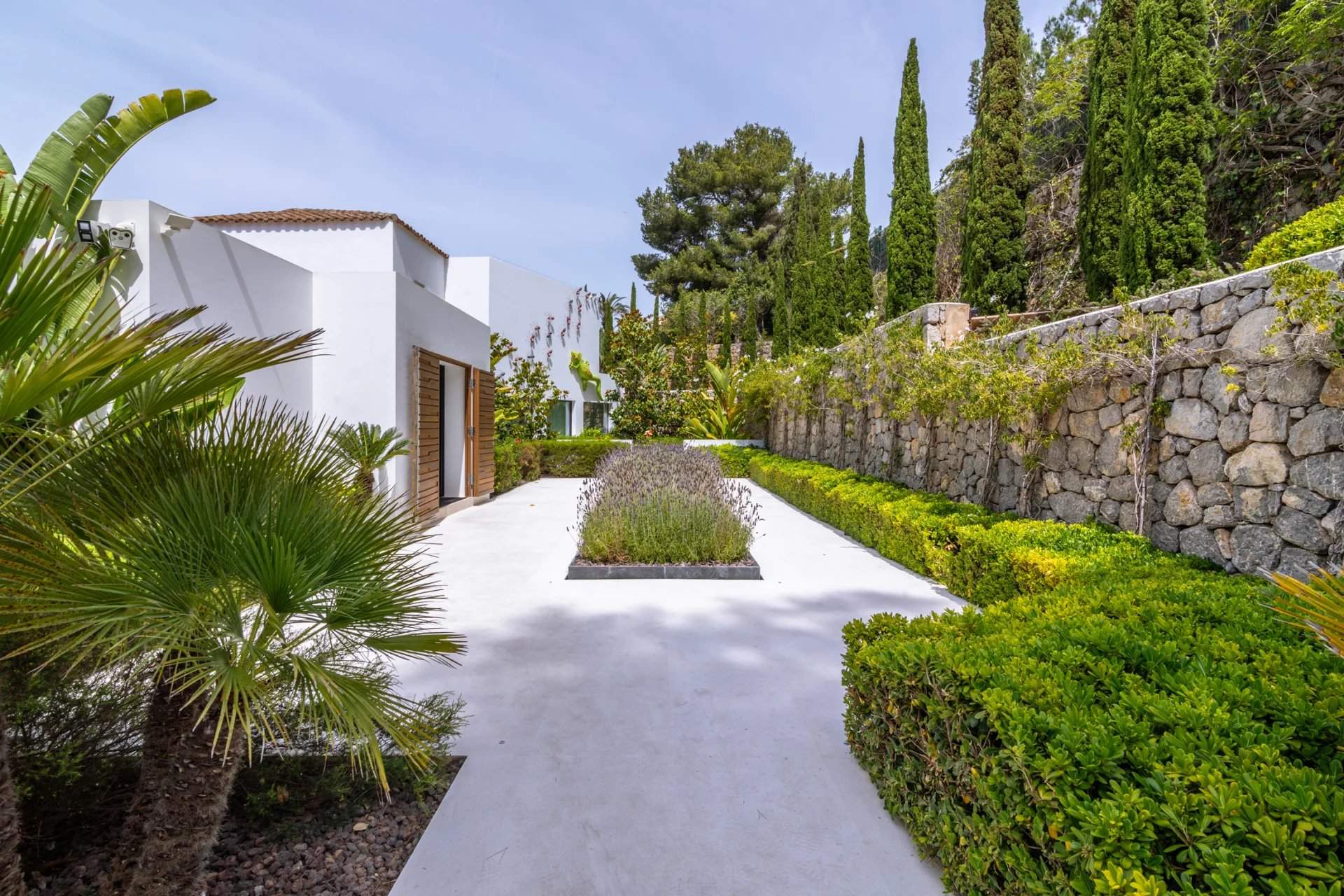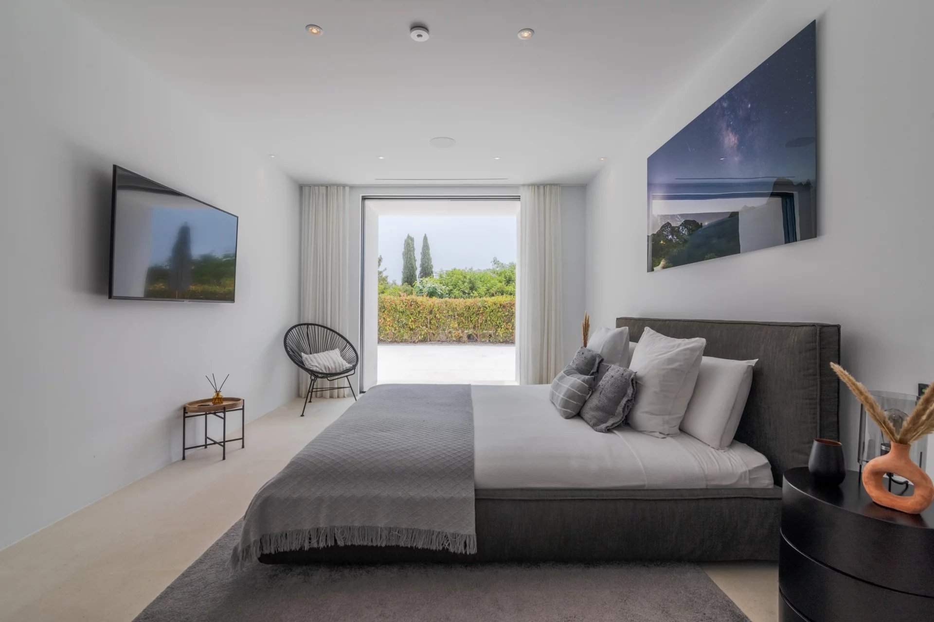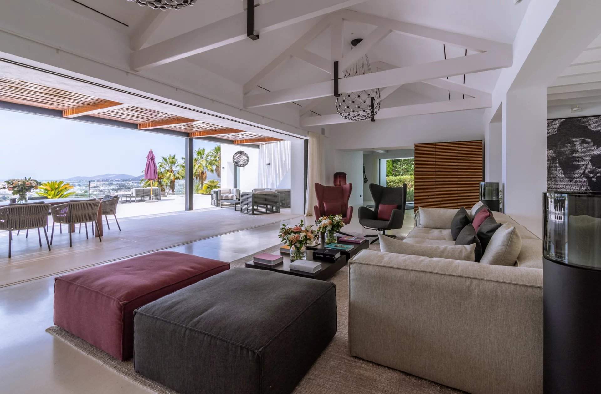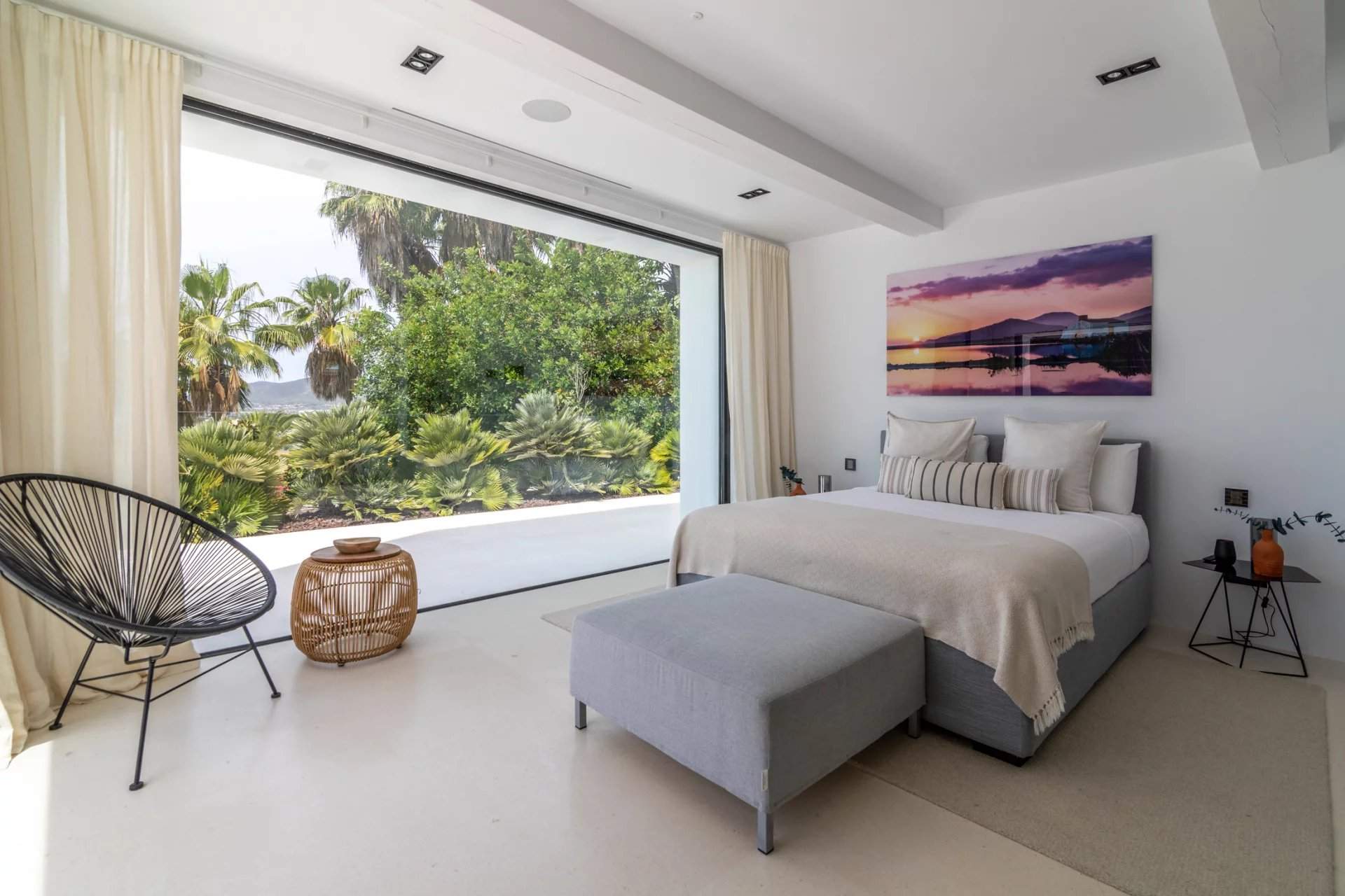 Elevated above Ibiza's coastline, this four-bedroom villa pairs contemporary architecture with sweeping views from Ibiza Town to Formentera. Set within the gated Can Rimbau community, Villa Laguna unfolds with calm, refined interiors. A manicured entrance leads into a light-filled living space framed by full-width glazing. White walls and muted furnishings set a serene tone, while sliding glass doors create a seamless transition to a shaded dining terrace designed for long, al fresco evenings. The kitchen embraces a moodier palette with dark cabinetry, high-spec appliances and an intimate dining area. Integrated LED lighting and a glass-fronted wine wall add a playful contemporary edge. Outside, twin terraces sweep down toward an infinity pool that mirrors the curve of the surrounding hillsides. Palm trees and native planting create a natural sense of privacy, forming a setting made for days spent between sun, shade and water. Four minimalist bedrooms continue the calming aesthetic with stone floors and expansive views. The principal suite features a striking en suite with a freestanding tub positioned to face the horizon. A cinema room and fully equipped gym offer indoor retreat, while a glass-bordered hot tub provides an elevated viewpoint for unforgettable sunsets. Tourist licence: ETV1911-E Jesus - 5 mins Talamanca - 5 mins Ibiza Town - 10 mins Ibiza Airport - 15 mins