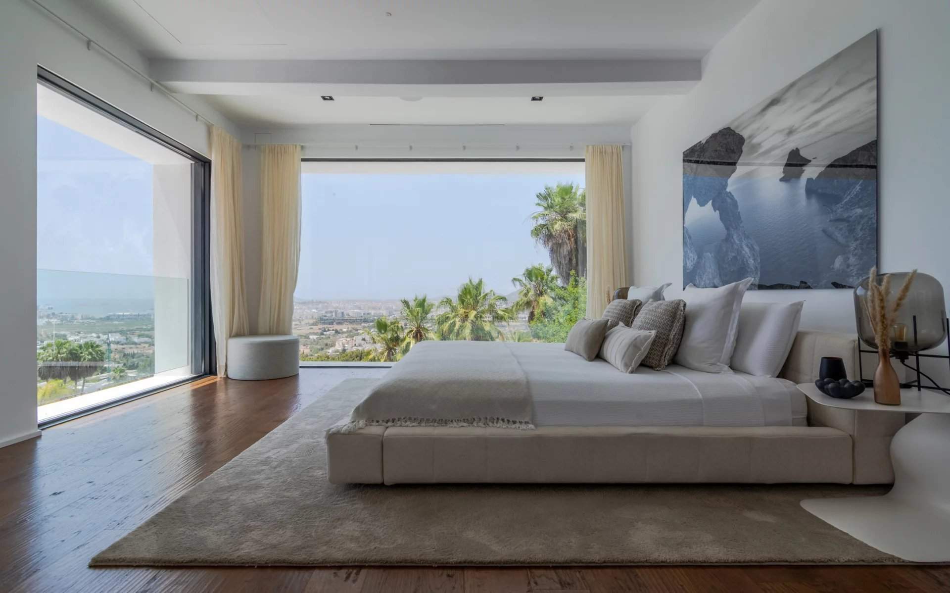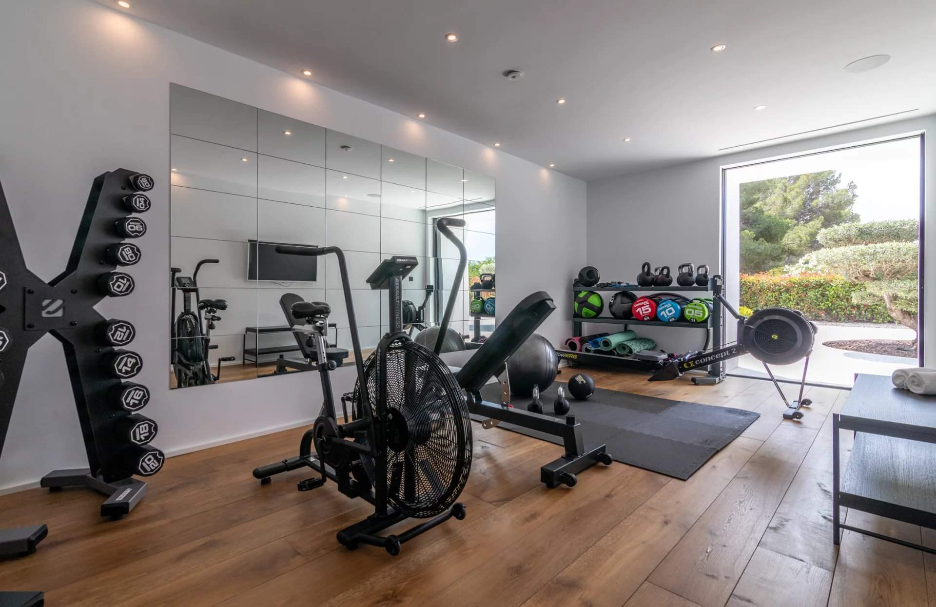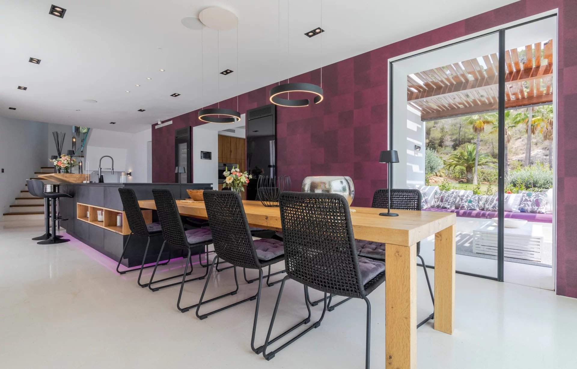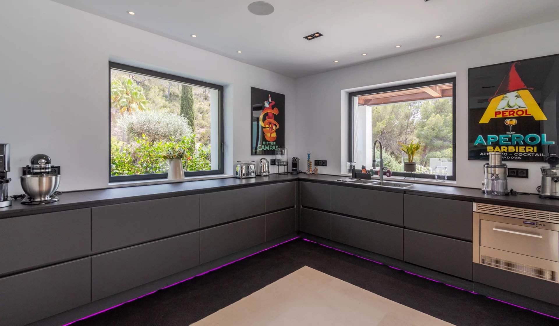 Elevated above Ibiza's coastline, this four-bedroom villa pairs contemporary architecture with sweeping views from Ibiza Town to Formentera. Set within the gated Can Rimbau community, Villa Laguna unfolds with calm, refined interiors. A manicured entrance leads into a light-filled living space framed by full-width glazing. White walls and muted furnishings set a serene tone, while sliding glass doors create a seamless transition to a shaded dining terrace designed for long, al fresco evenings. The kitchen embraces a moodier palette with dark cabinetry, high-spec appliances and an intimate dining area. Integrated LED lighting and a glass-fronted wine wall add a playful contemporary edge. Outside, twin terraces sweep down toward an infinity pool that mirrors the curve of the surrounding hillsides. Palm trees and native planting create a natural sense of privacy, forming a setting made for days spent between sun, shade and water. Four minimalist bedrooms continue the calming aesthetic with stone floors and expansive views. The principal suite features a striking en suite with a freestanding tub positioned to face the horizon. A cinema room and fully equipped gym offer indoor retreat, while a glass-bordered hot tub provides an elevated viewpoint for unforgettable sunsets. Tourist licence: ETV1911-E Jesus - 5 mins Talamanca - 5 mins Ibiza Town - 10 mins Ibiza Airport - 15 mins
