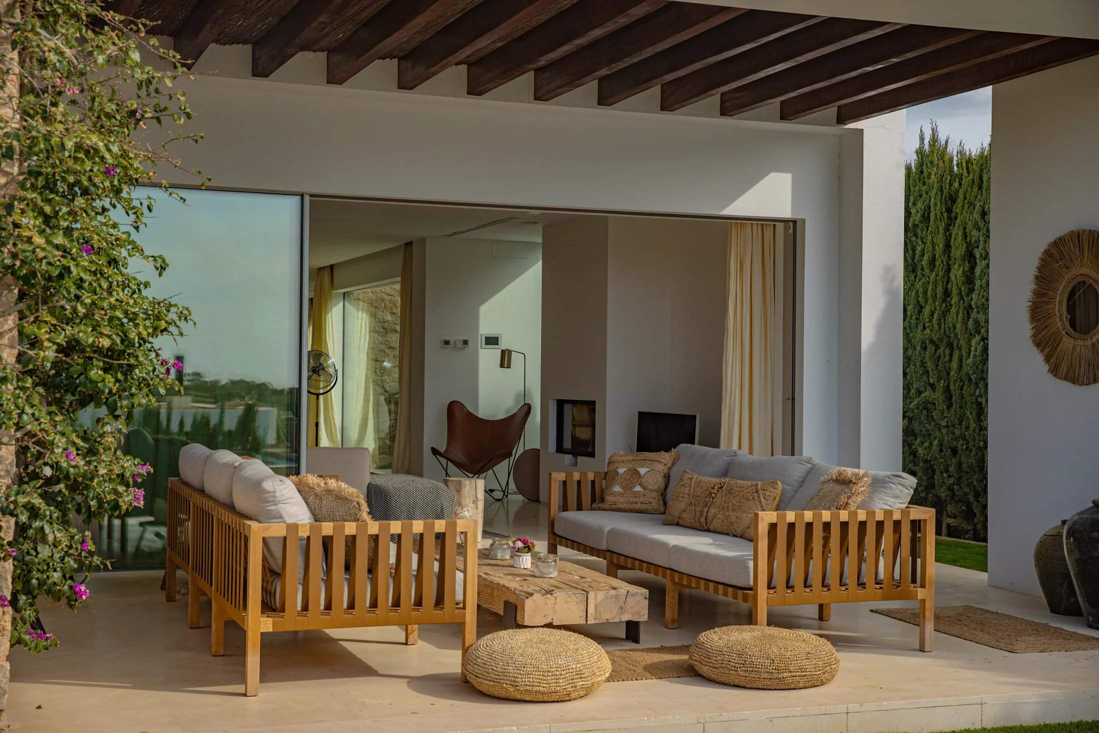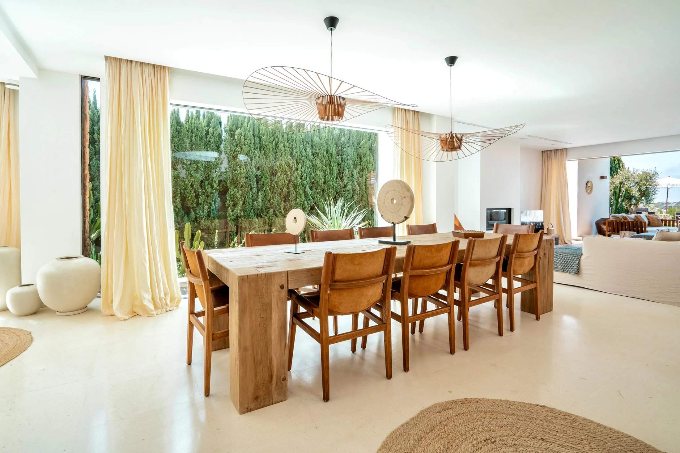 Sea views and sunset light define this four-bedroom villa for rent on Ibiza's southwest coast, set within a gated community near Cala Conta. Rooted in Ibicencan style, the home pairs stone walls and native planting with calm, contemporary interiors by architects Monica Fullana and Jordi Carreno. An open-plan living and dining space is designed around natural materials and panoramic outlooks, with plush seating, a Bang & Olufsen sound system and a sleek kitchen with white cabinetry, wood worktops and a sociable breakfast bar. Sliding glass doors open onto a generous terrace made for outdoor living. Under a woven canopy, an al fresco dining area sits alongside shaded lounge spaces, sunbathing decks and an L-shaped infinity pool with uninterrupted Mediterranean views. All four bedrooms continue the relaxed palette of neutral tones, exposed stonework and abundant light. The principal suite opens onto a private sea-facing terrace and features a spa-like en suite with a freestanding bath and rainfall shower. Three further bedrooms each have their own bathrooms, while a lower ground floor houses a discreet laundry room. Tourist License: ETV-2439-E (for 8 guests) Cala Comte: 6 mins San José: 13 mins Ibiza Airport: 26 mins Ibiza Town: 33 mins