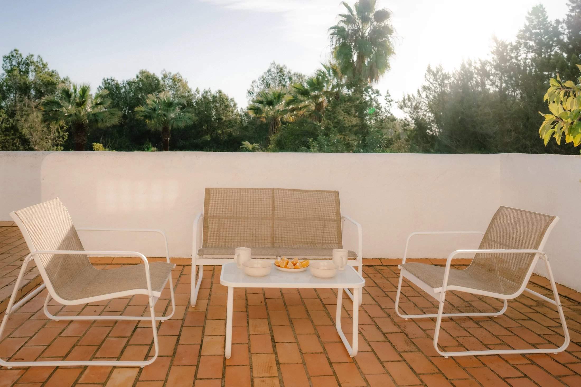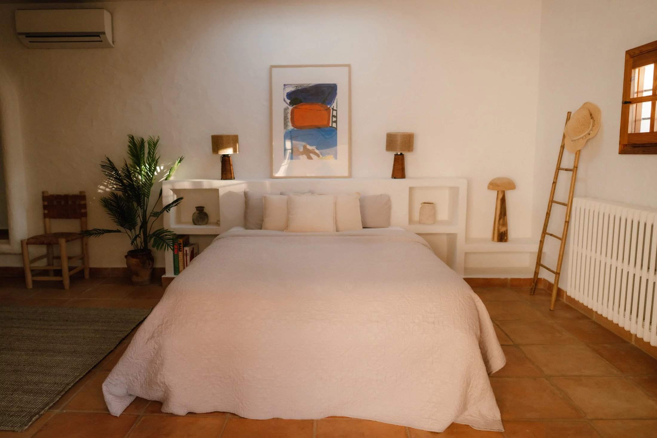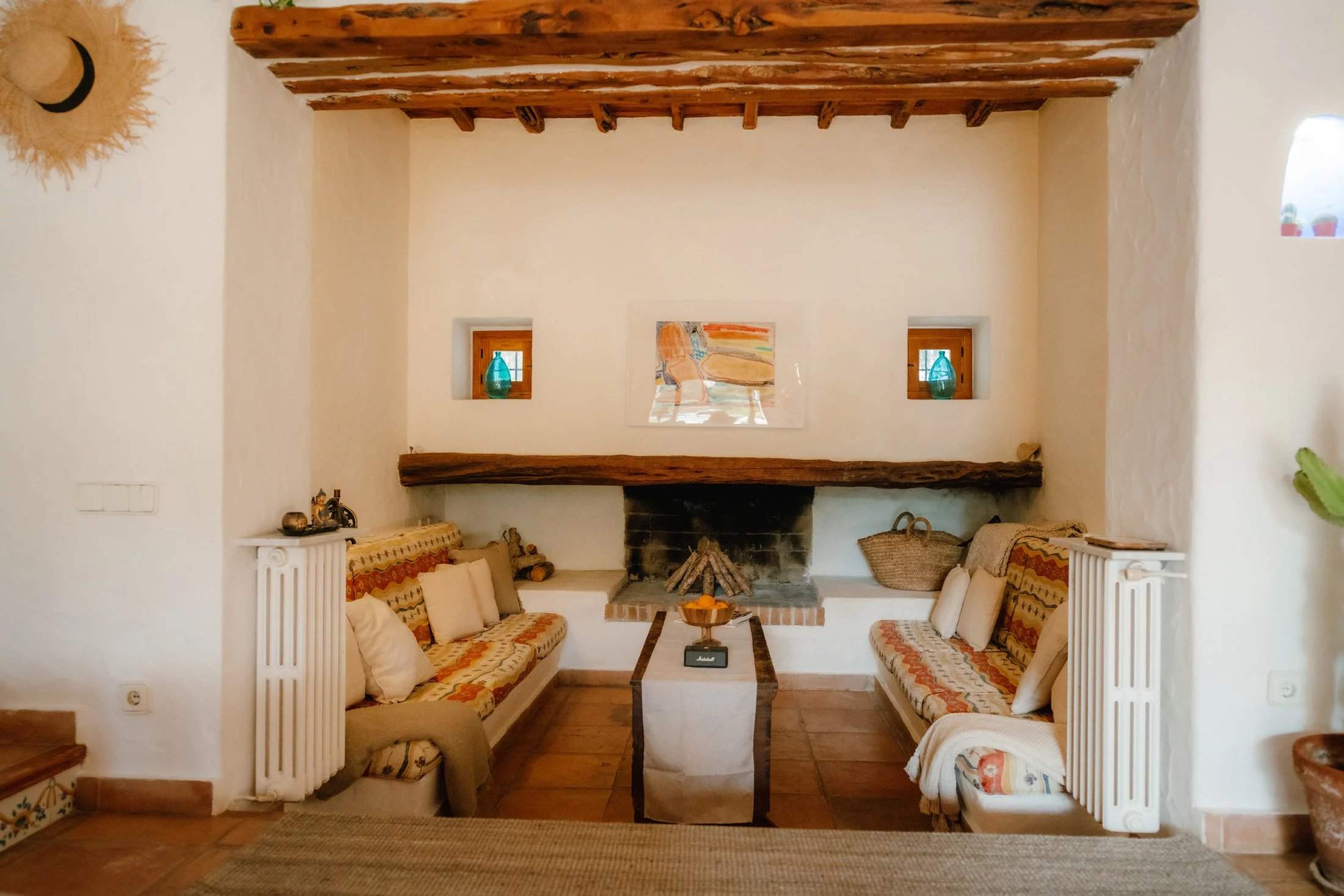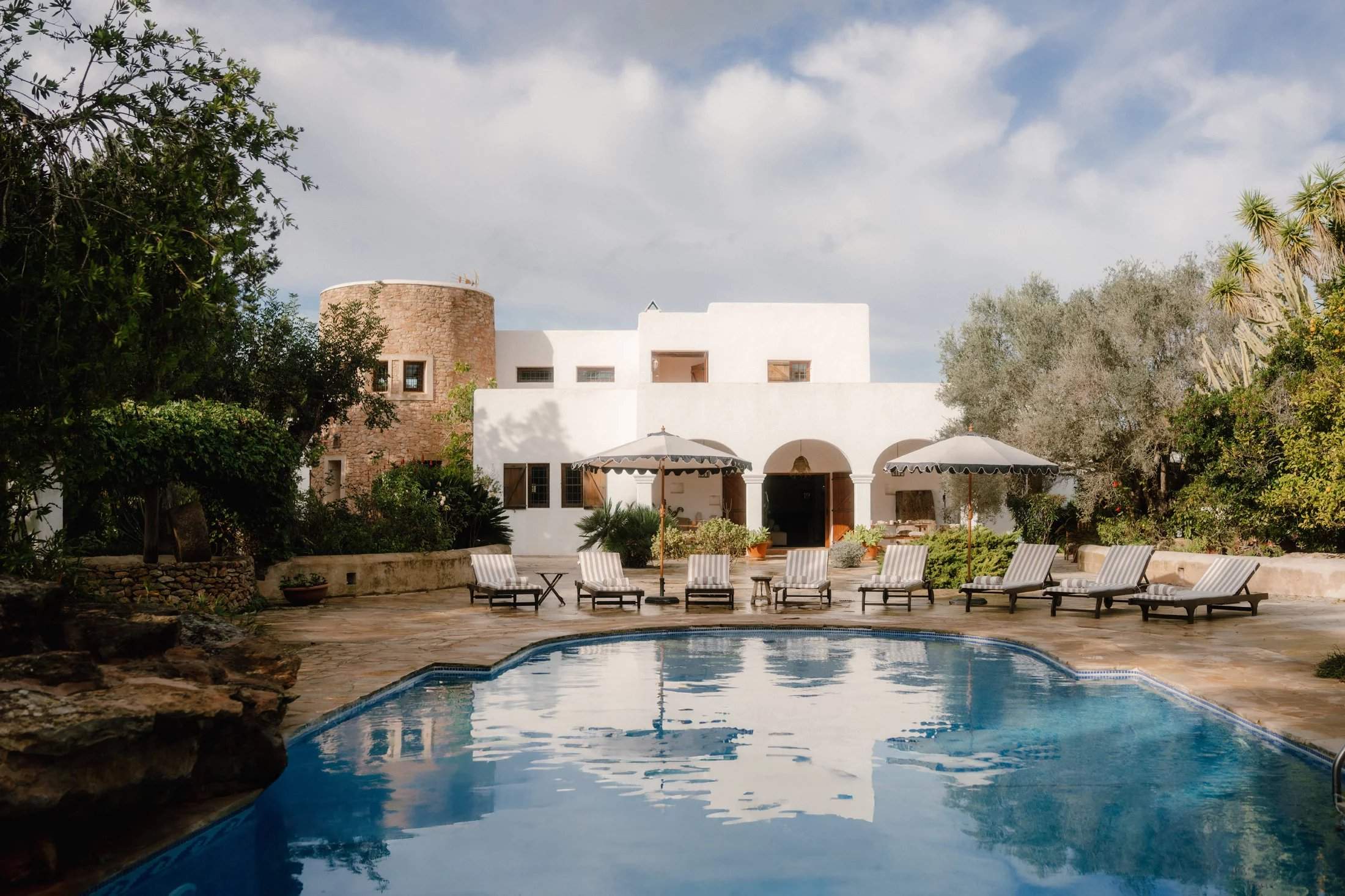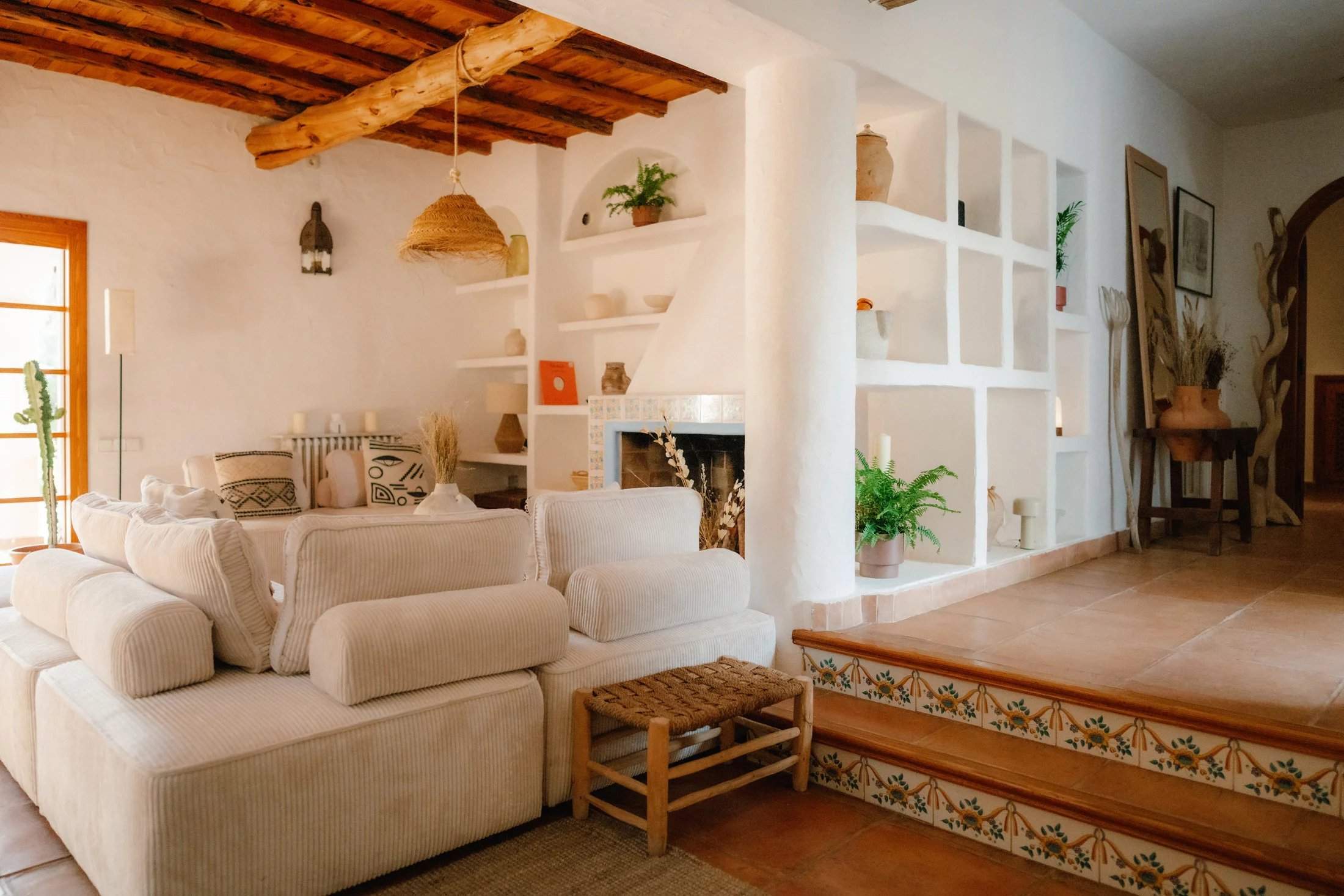 A traditional Ibicencan home with design-led interiors, this four-bedroom villa is set among palms and pines with outdoor living at its core. A stone turret and whitewashed walls set the tone on arrival, leading into spaces defined by Sabina beams, arched doorways, wall niches and decorative tiles that honour the home's heritage. Sun-drenched terraces and manicured gardens unfold around a central swimming pool, accompanied by two barbecues and an outdoor gym. Shaded seating and a roof terrace create inviting spots for long afternoons and sunset views across the greenery. Inside, a covered dining area flows into the open-plan living space, where terracotta floors and exposed beams frame a modular sofa and a traditional fireplace with blue-tiled detailing. The adjoining kitchen is well-equipped for entertaining, while rattan pendants soften the dining area's glow. All four bedroom suites continue the natural palette, with whitewashed walls, earthy tiles and abundant light. The principal suite opens through wooden doors onto a private terrace. Tourist License: ETV 1047/E (for 9 guests) Ibiza Town - 25 mins Ibiza Airport - 25 mins Santa Gertrudis - 10 mins Cala Benirrás - 20 mins