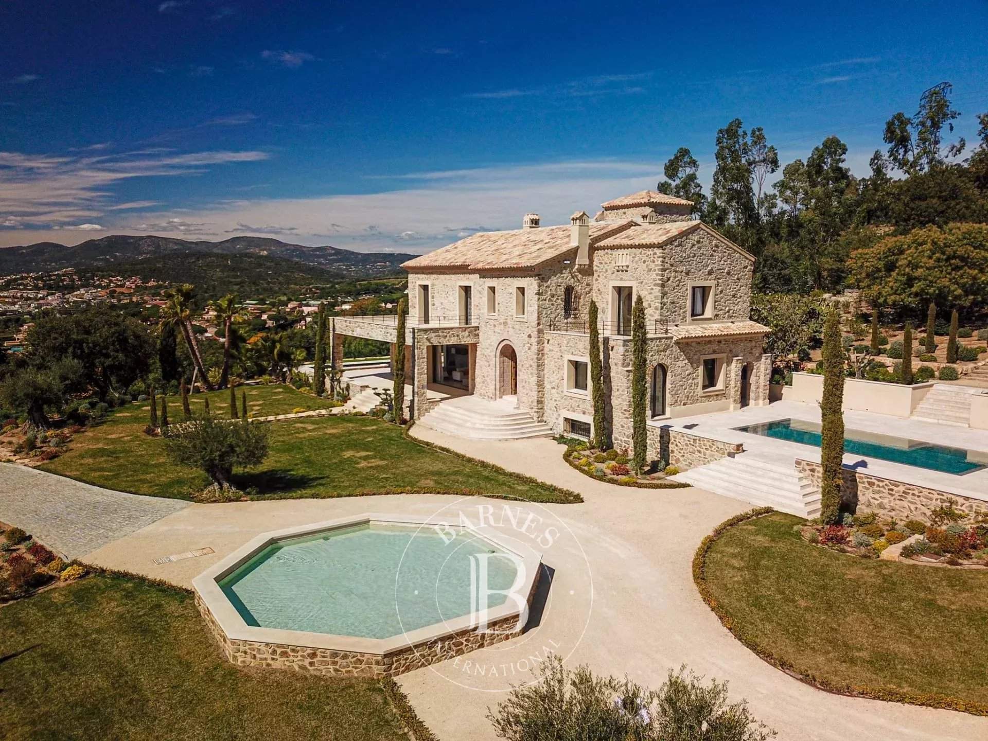 * Château Du Soleil * Situada en un entorno tranquilo cerca del centro de la ciudad, esta prestigiosa propiedad está construida en una posición dominante con vistas al mar y al golfo de Saint-Tropez. Esta mansión privada de aproximadamente 545 m² de espacio habitable consta de dos edificios totalmente renovados situados en un terreno de 5,5 hectáreas. La propiedad consta de una gran sala de recepción con un salón doble y comedor, una cocina totalmente equipada y ocho dormitorios en suite, cada uno con su propio cuarto de ducha. También hay una bodega, gimnasio, spa y hammam. En el exterior, hay un jardín muy grande fuera de la vista, una cocina de verano, dos piscinas, una casa de la piscina, acceso directo a un helipuerto y un amplio garaje con espacio para varios coches. Instalaciones : Aire acondicionado en toda la propiedad, sistema de alarma, portón eléctrico, plazas de aparcamiento. Servicios incluidos: Limpieza, ropa de cama y servicio de conserjería BARNES personalizado. Número de registro 83115004244HT