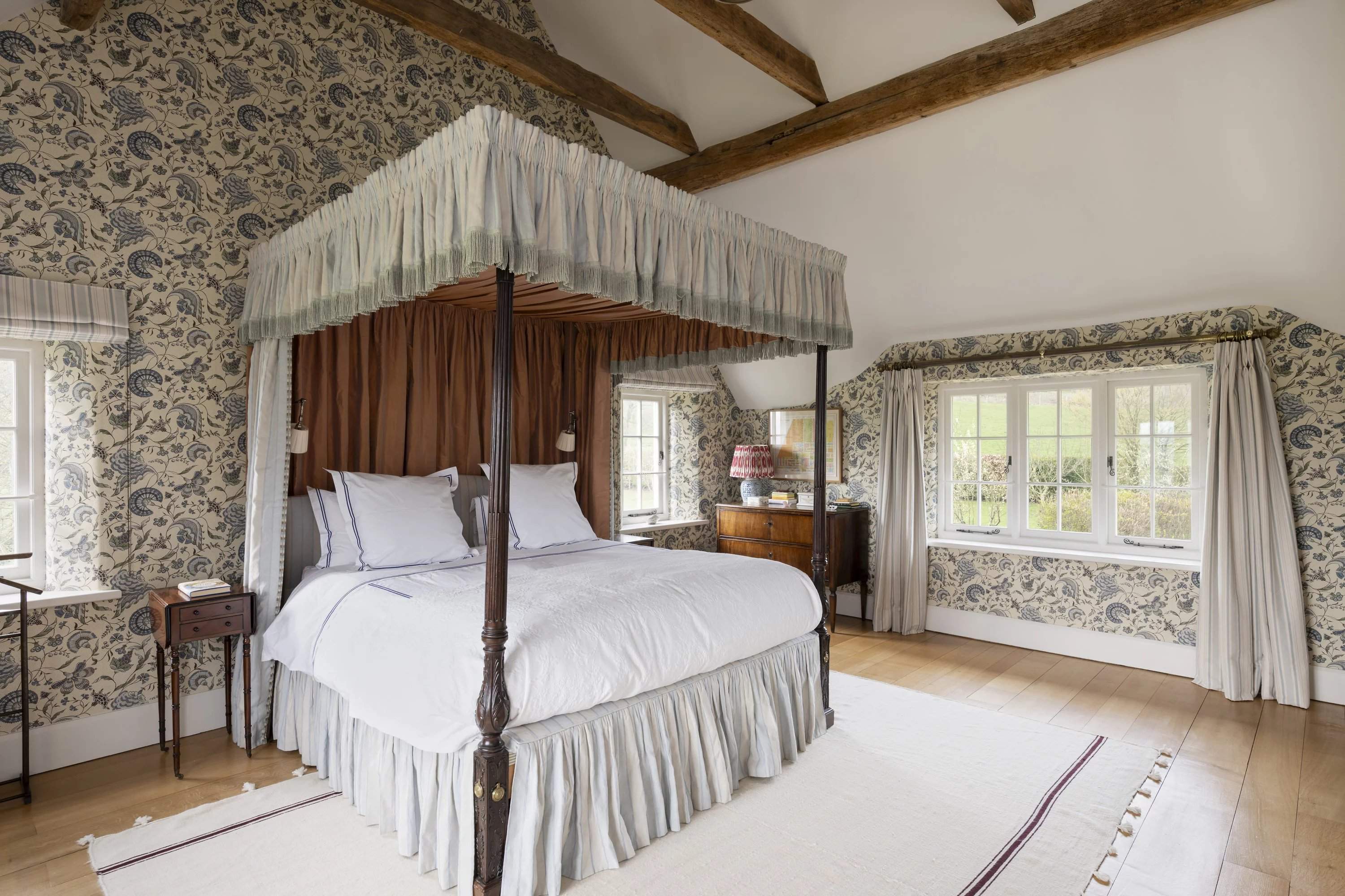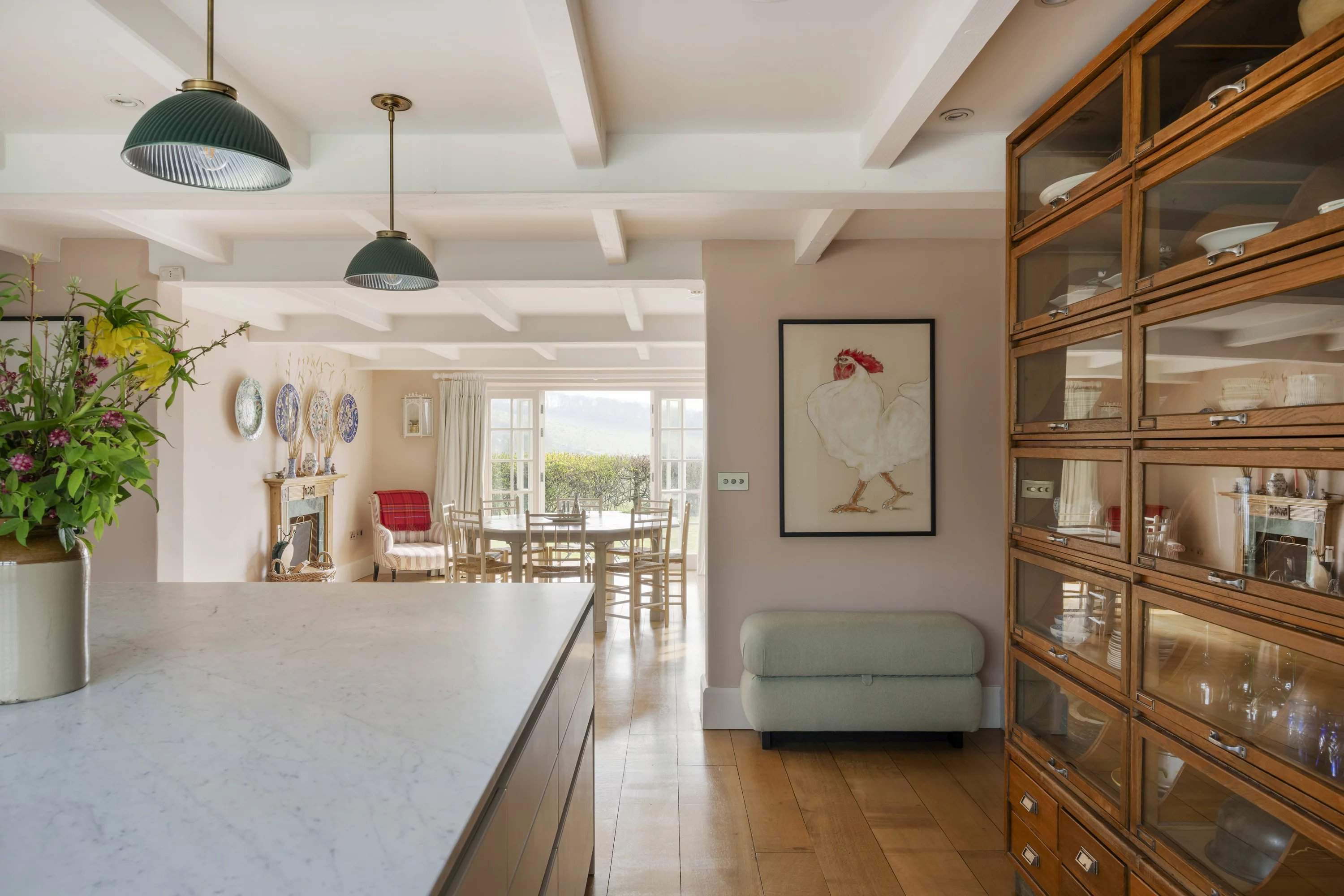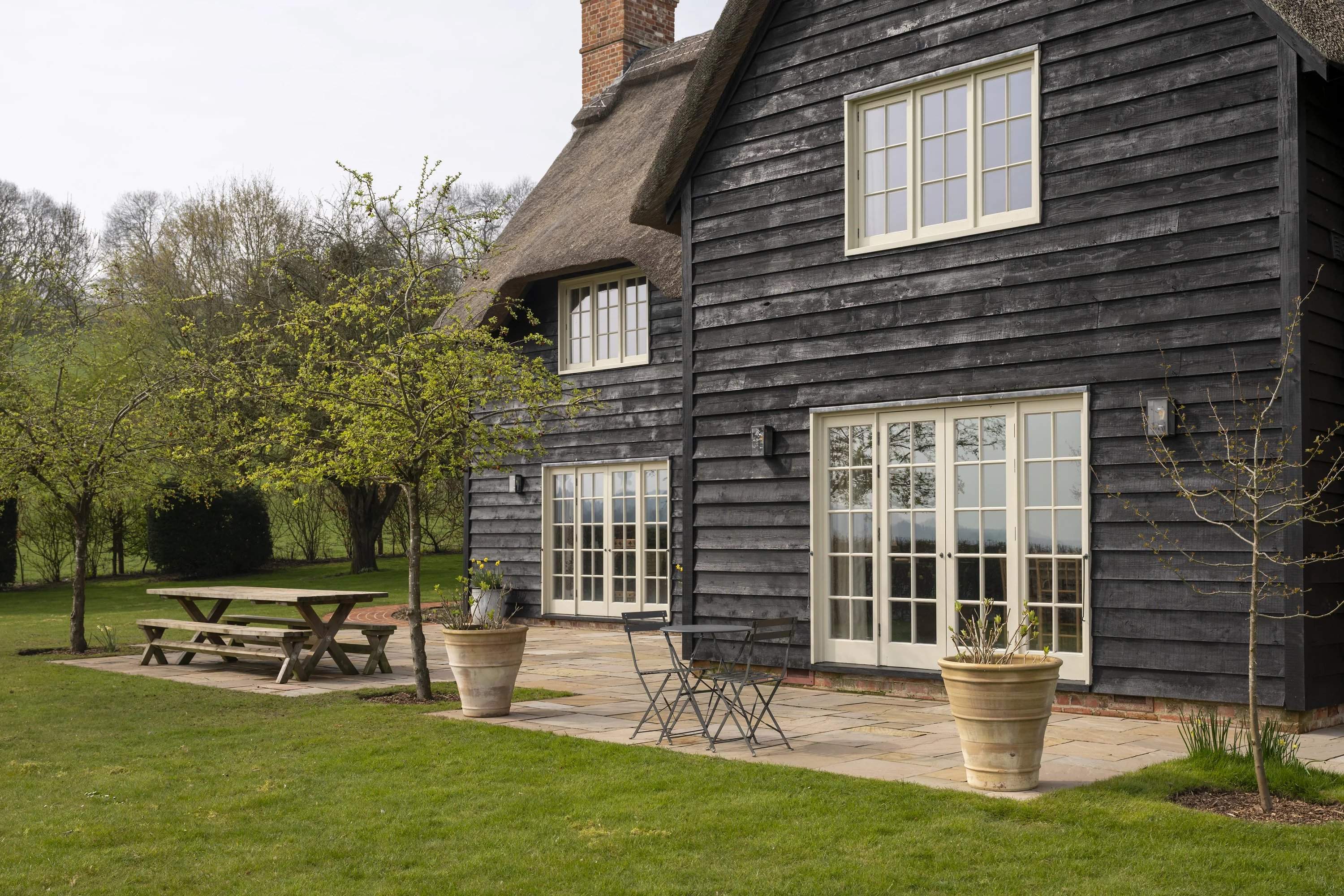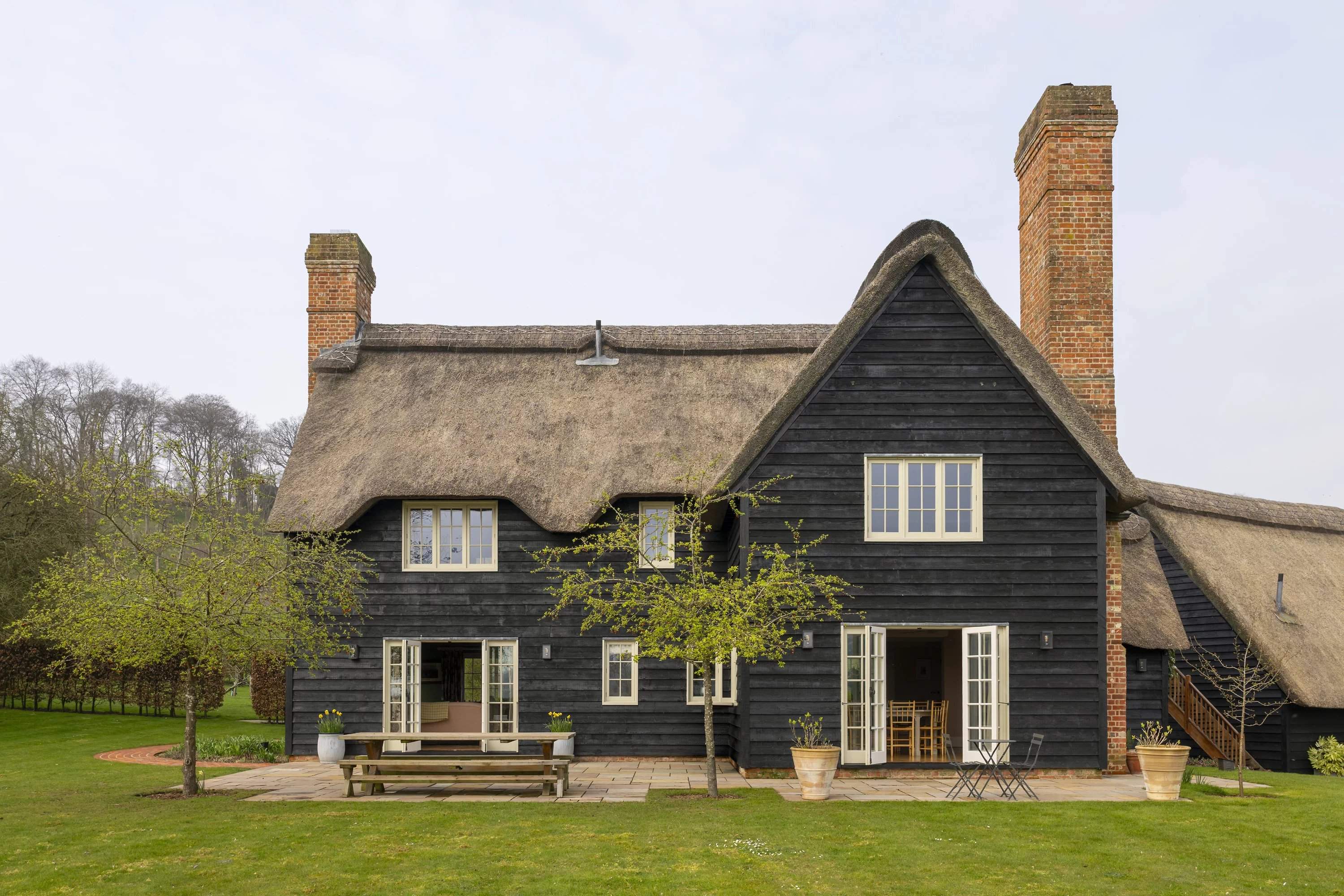 Une maison en chaume de quatre chambres située dans un jardin paysager avec vue sur la campagne ouverte. À l'intérieur, des poutres apparentes et des intérieurs aux tons doux équilibrent le caractère avec une ambiance plus détendue et contemporaine. La salle principale s'ouvre sur la terrasse, tandis qu'une deuxième salle de séjour offre un refuge plus calme. Une cuisine spacieuse et une salle à manger attenante constituent le coeur social, avec des portes françaises prolongeant la fluidité vers l'extérieur. À l'étage, trois chambres sont individuellement décorées, dominées par une suite principale généreuse offrant une vue étendue. Par ailleurs, un studio indépendant complète l'ensemble. Extérieurs, des pelouses et des espaces de terrasse sont encadrés par une plantation établie, avec une vue rurale ininterrompue au-delà.