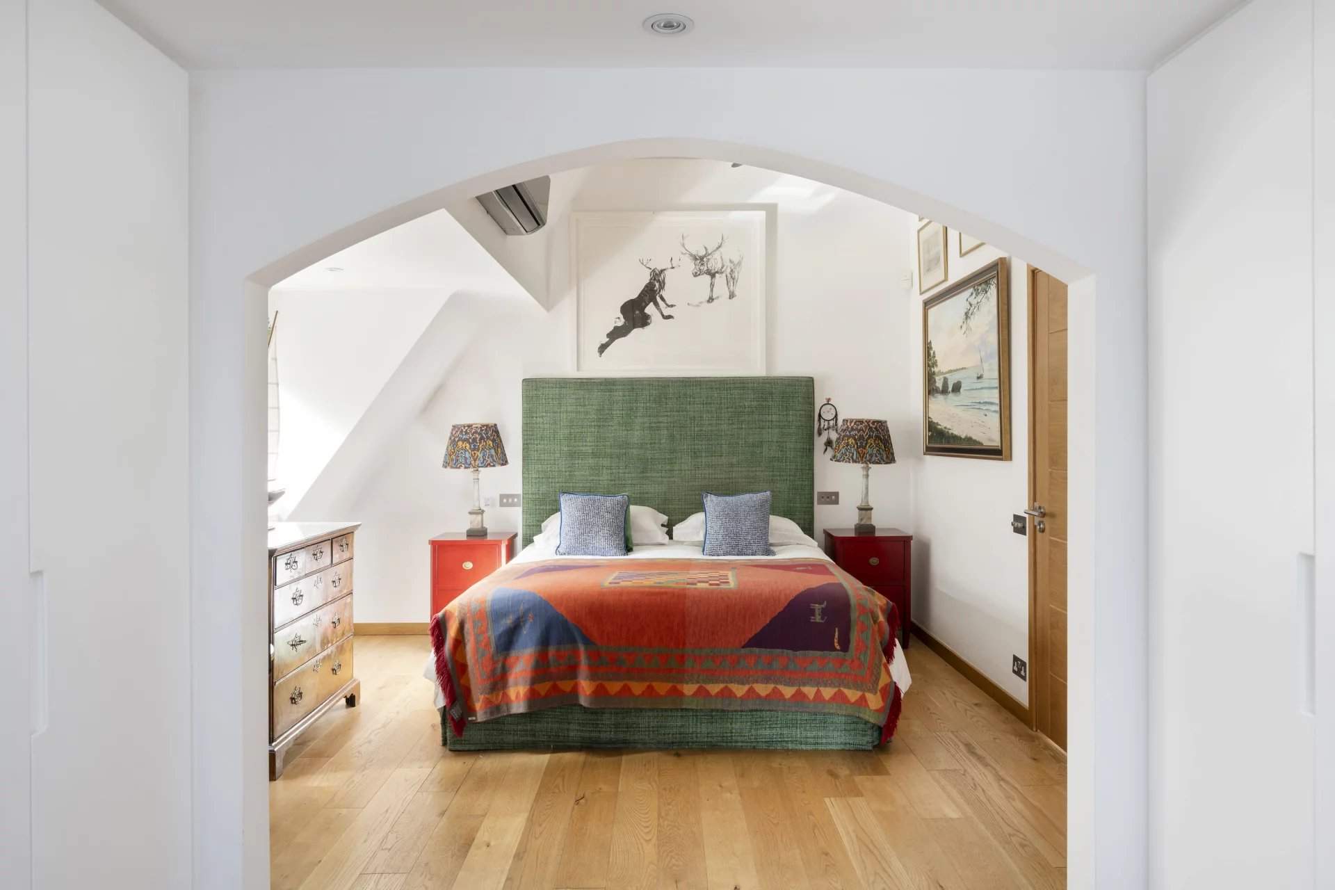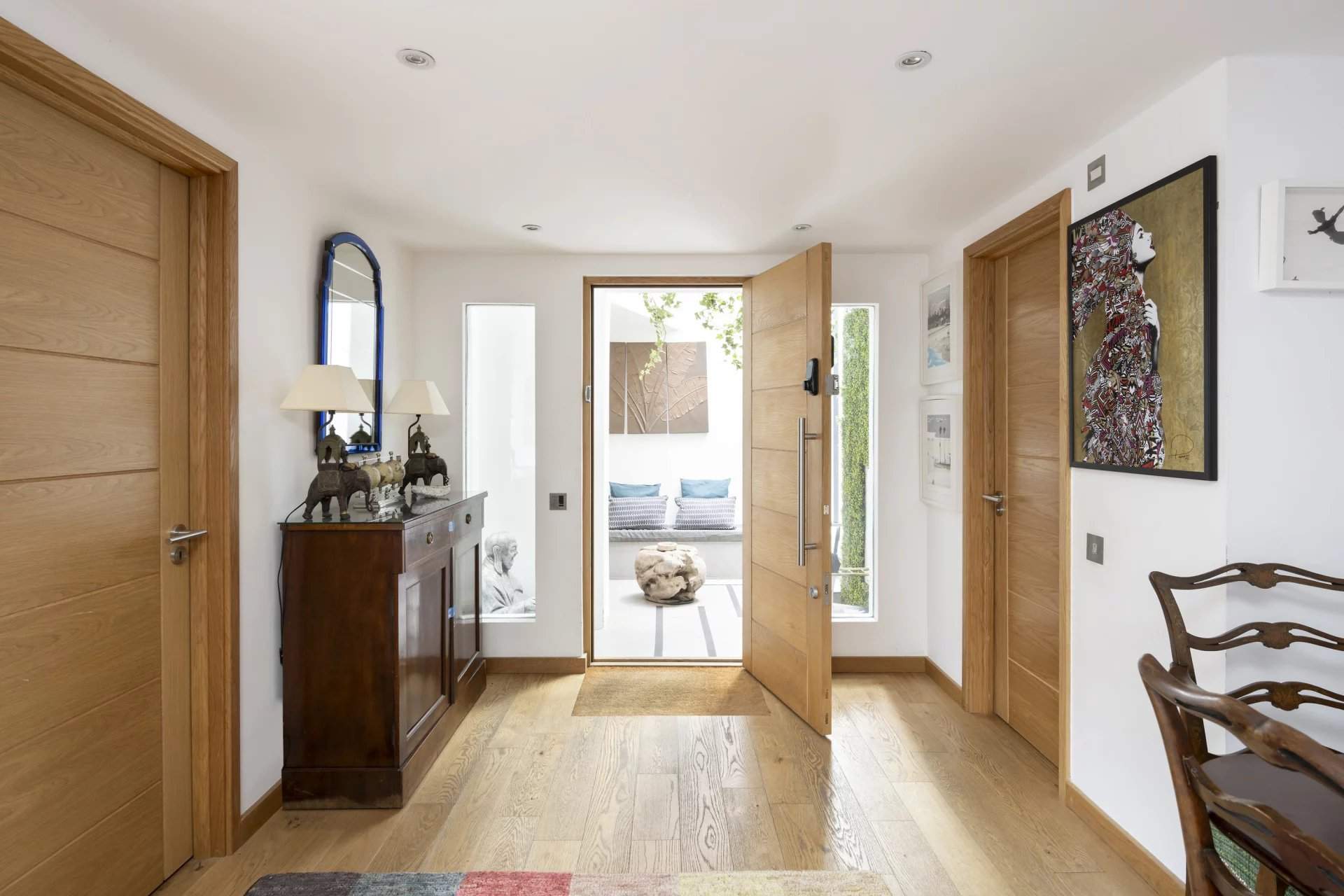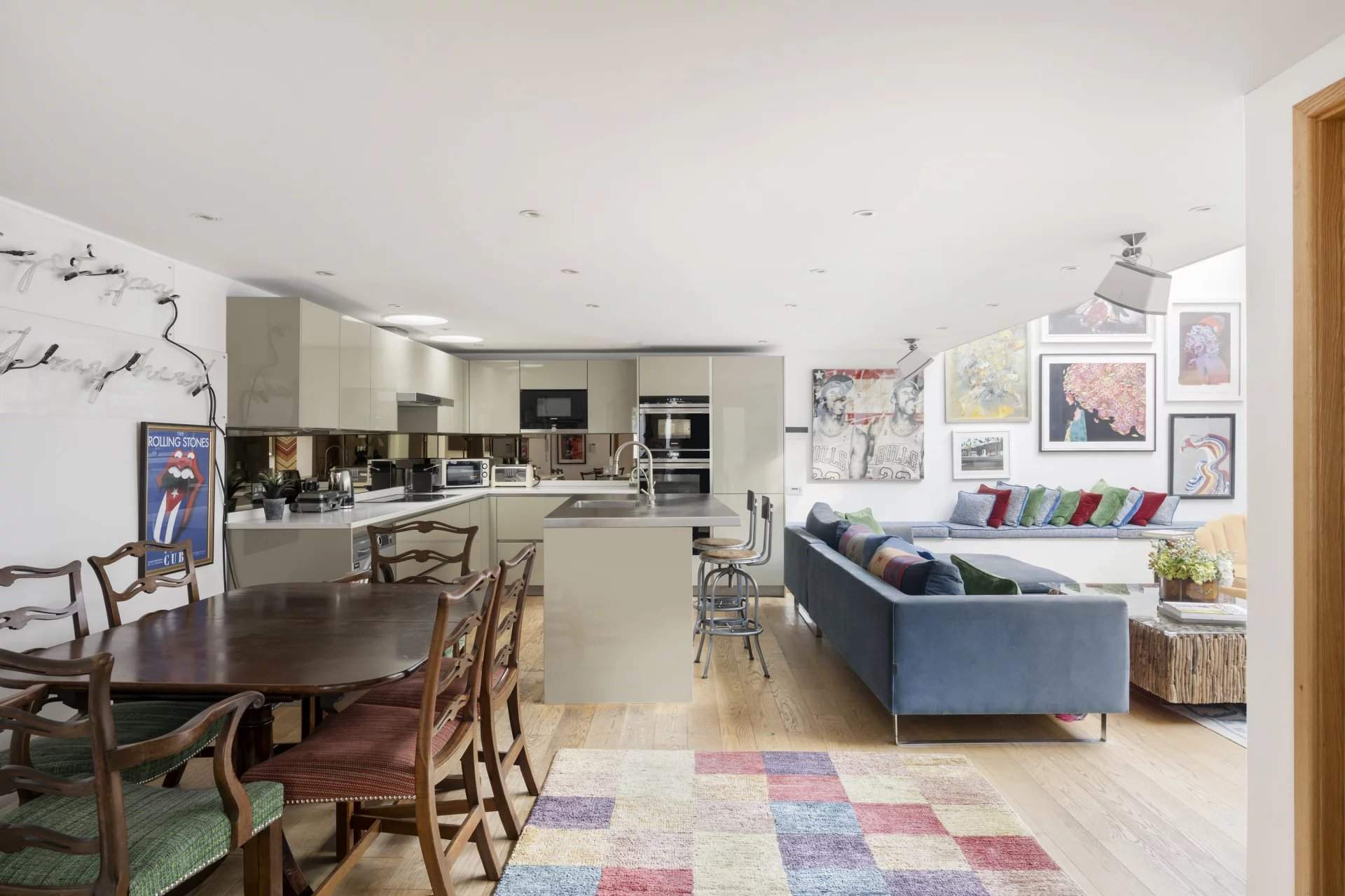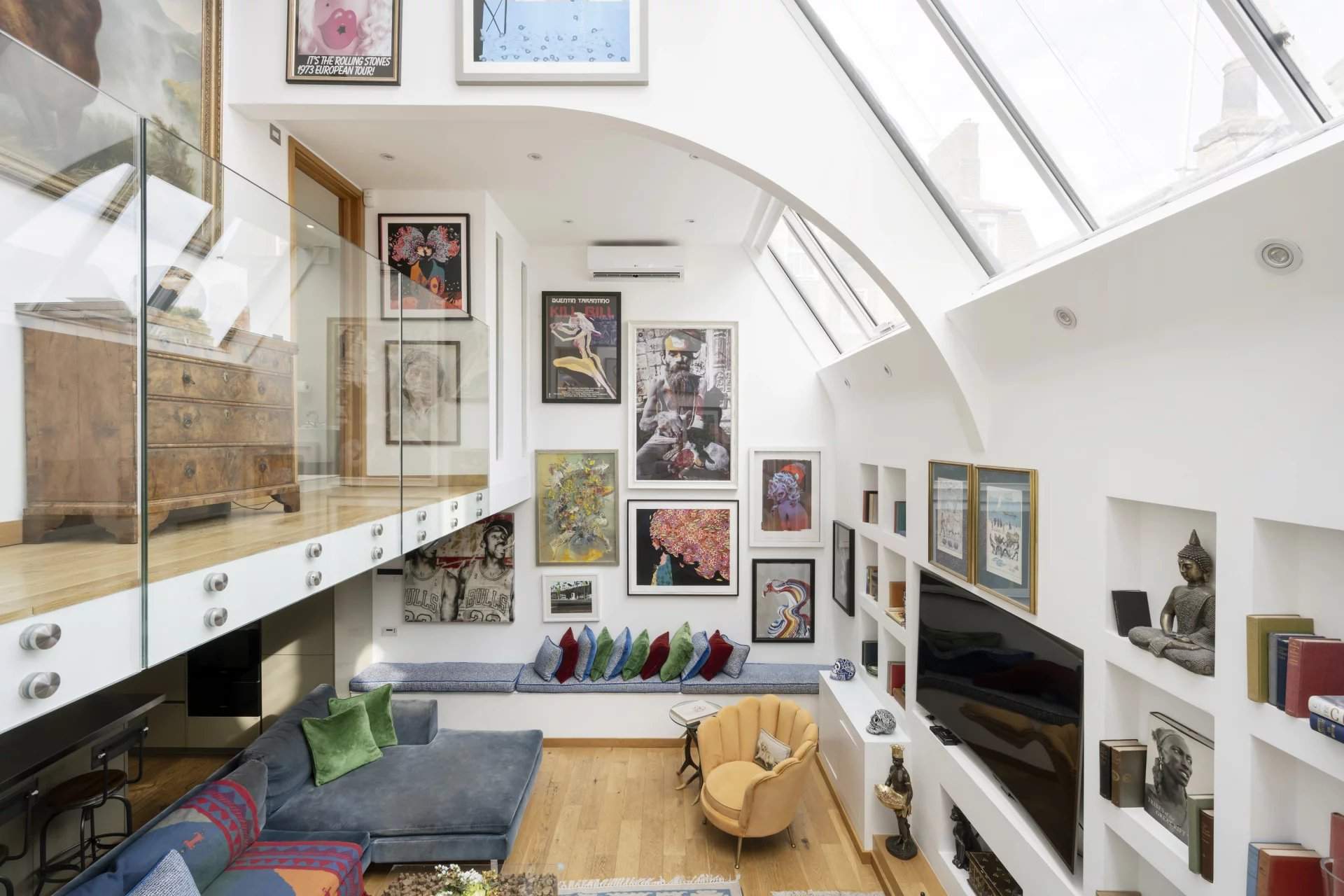Cette maison créative de trois chambres, située à quelques pas de Fulham Road, offre paix et intimité. Derrière une discrète porte vitrée, une cour intérieure avec des sièges extérieurs renforce l'atmosphère sereine. À l'intérieur, une salle de réception à double hauteur avec des puits de lumière crée une ambiance accueillante semblable à celle d'une galerie, la hauteur du plafond élevant l'atmosphère. Les proportions oscillent entre le volumineux et l'intime. Nichée sur un côté de l'espace, la cuisine s'articule autour d'un îlot et d'un bar de petit-déjeuner en acier inoxydable, complétés par des surfaces épurées et des crédences en miroir. Une table à manger de six places avec un éclairage au néon sur mesure plante le décor pour les dîners. Lorsqu'il est temps de se reposer, un escalier vitré mène aux chambres du premier étage, dont la suite principale, dotée d'un dressing et d'un balcon. Une deuxième chambre est lumineuse et réfléchie, tandis qu'une troisième chambre au rez-de-chaussée avec salle de douche attenante est idéale pour les invités.