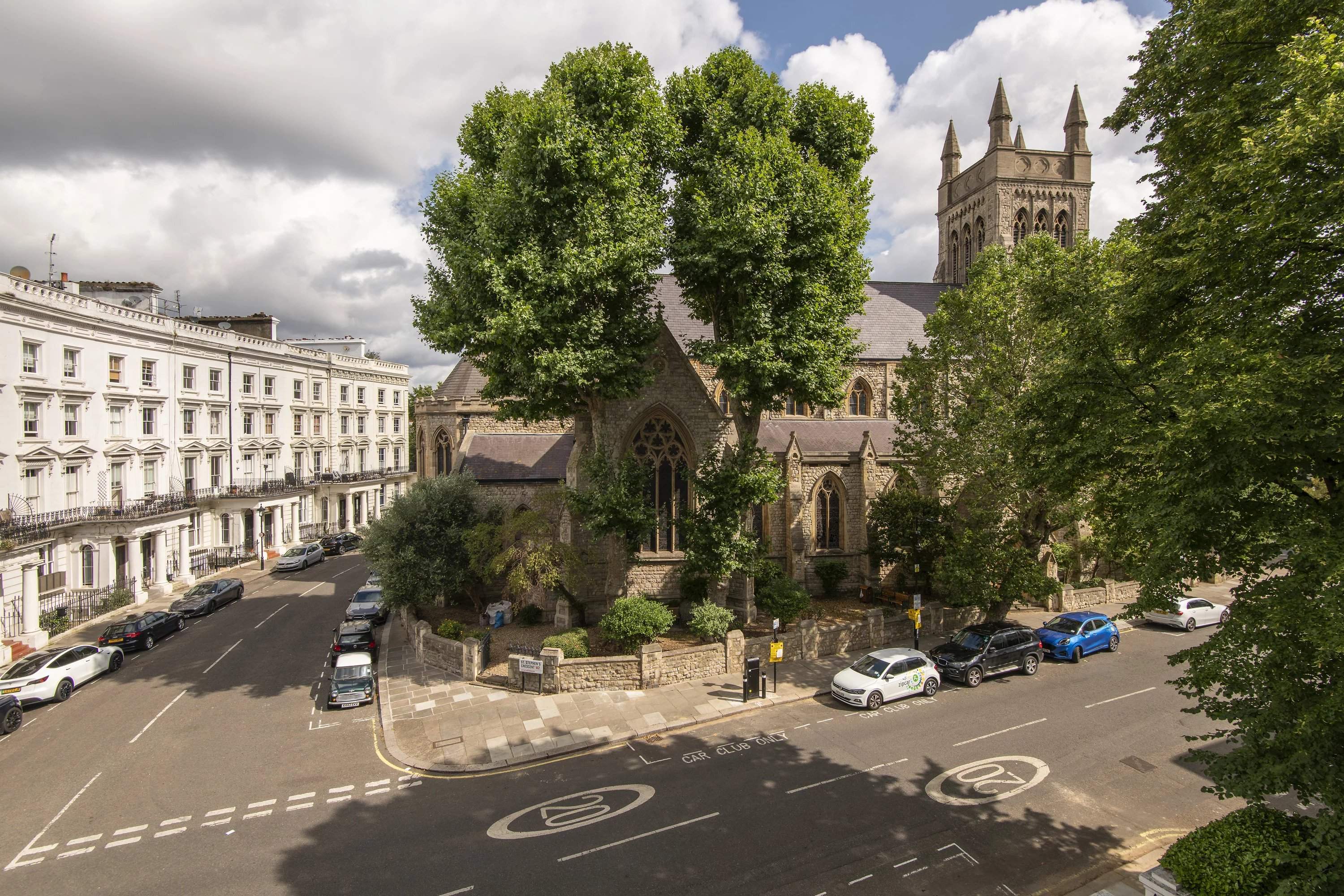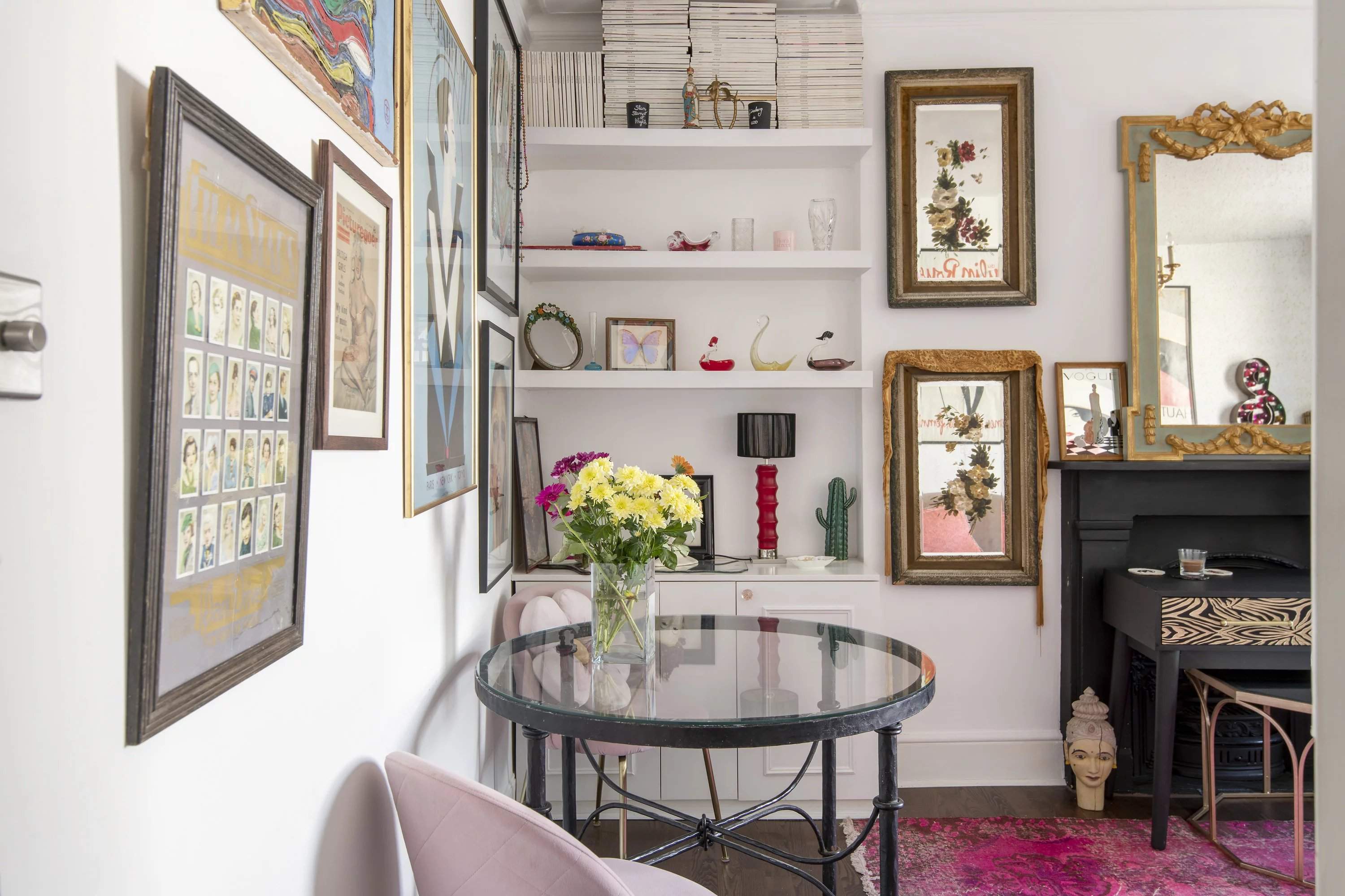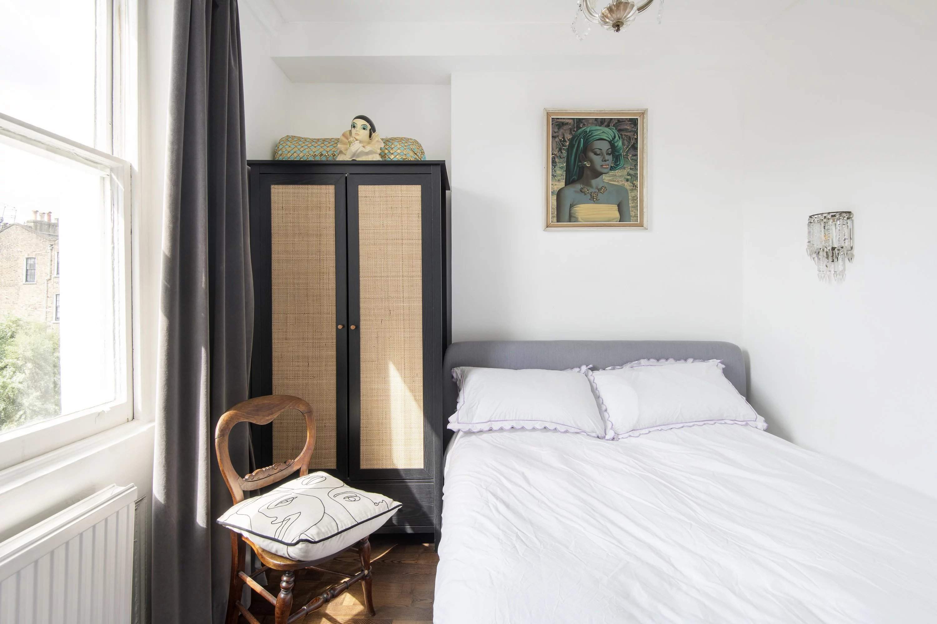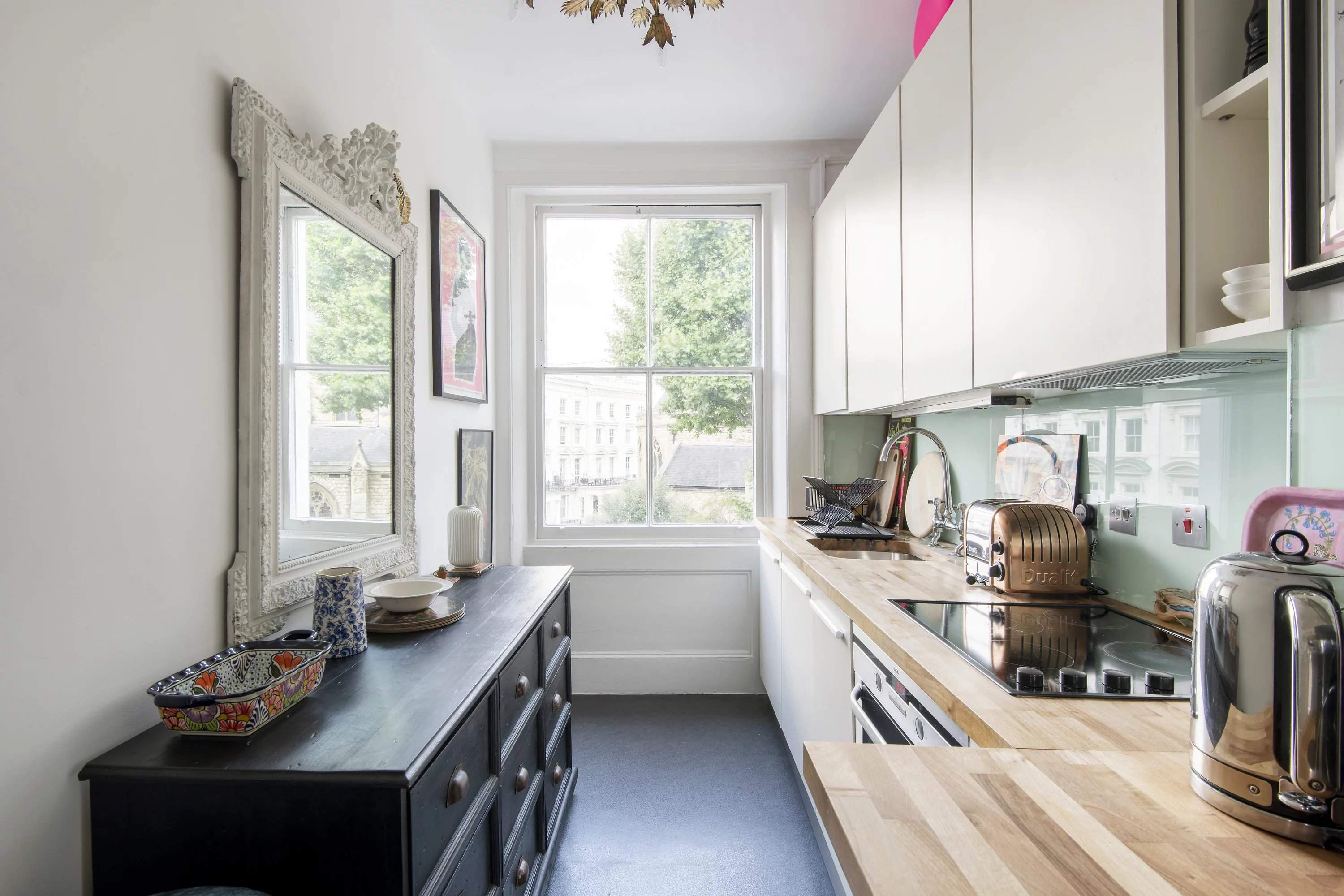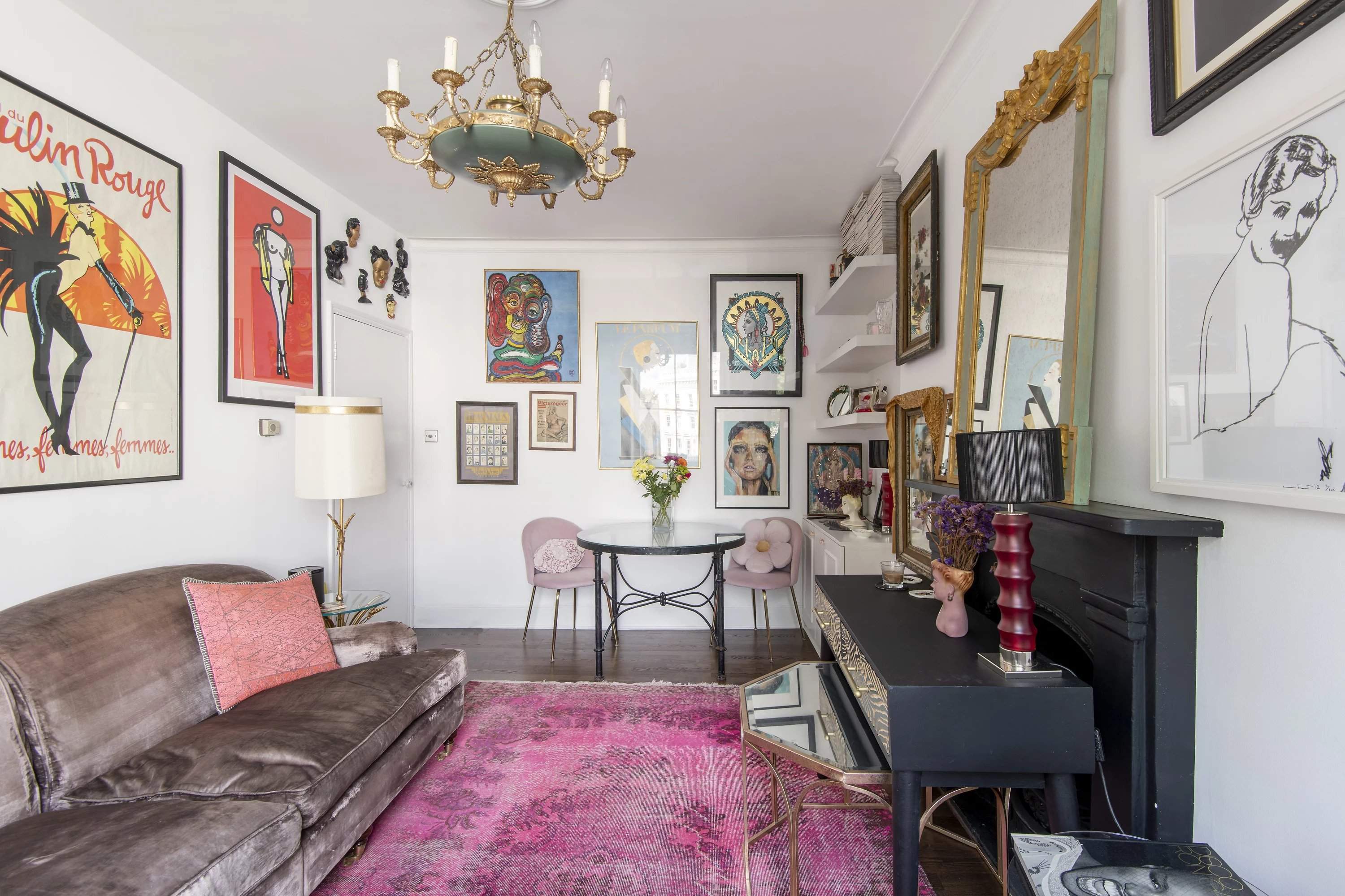 Dissimulé derrière une maison de ville traditionnelle aux façades en stuc, cet appartement de Bayswater est baigné de lumière naturelle et présente un caractère éclectique. La salle de réception dynamique fait une impression immédiate, mêlant design contemporain et traditionnel. La lumière se déverse par une fenêtre généreuse, illuminant un tapis vintage magenta, tandis que des oeuvres d'art sélectionnées et un lustre Empire en bronze renforcent l'impression de hauteur et de drame. Un canapé brun moelleux, une chaise longue à imprimé animalier et des fauteuils d'appoint roses créent un espace à la fois ludique et accueillant pour la vie moderne. La cuisine est lumineuse et raffinée, avec une grande fenêtre à guillotine, des armoires blanches, un dosseret vert brillant, des plans de travail en bois et des appareils électroménagers intégrés. Des touches décoratives bien pensées ajoutent un intérêt visuel sans nuire à la finition épurée. La chambre principale offre une retraite calme, associant des textures naturelles à une palette épurée. Les touches de vert dans les oeuvres d'art apportent de la cohésion, tandis qu'une grande commode et une armoire en rotin peinte en noir offrent de nombreux rangements. Adjacente, la salle de bains familiale présente des carreaux de métro blancs et lisses et une baignoire généreuse, doucement éclairée par des spots chauds.