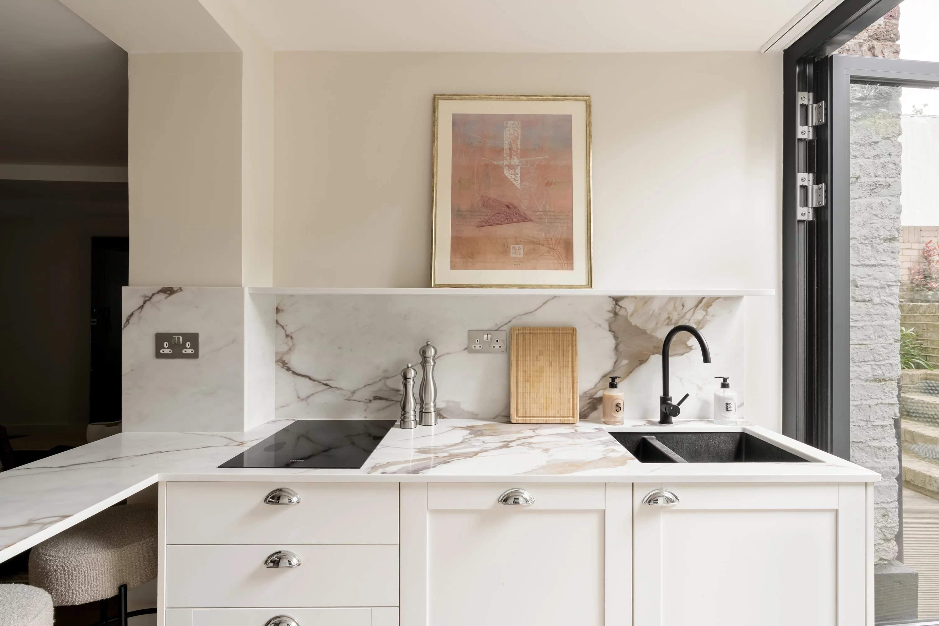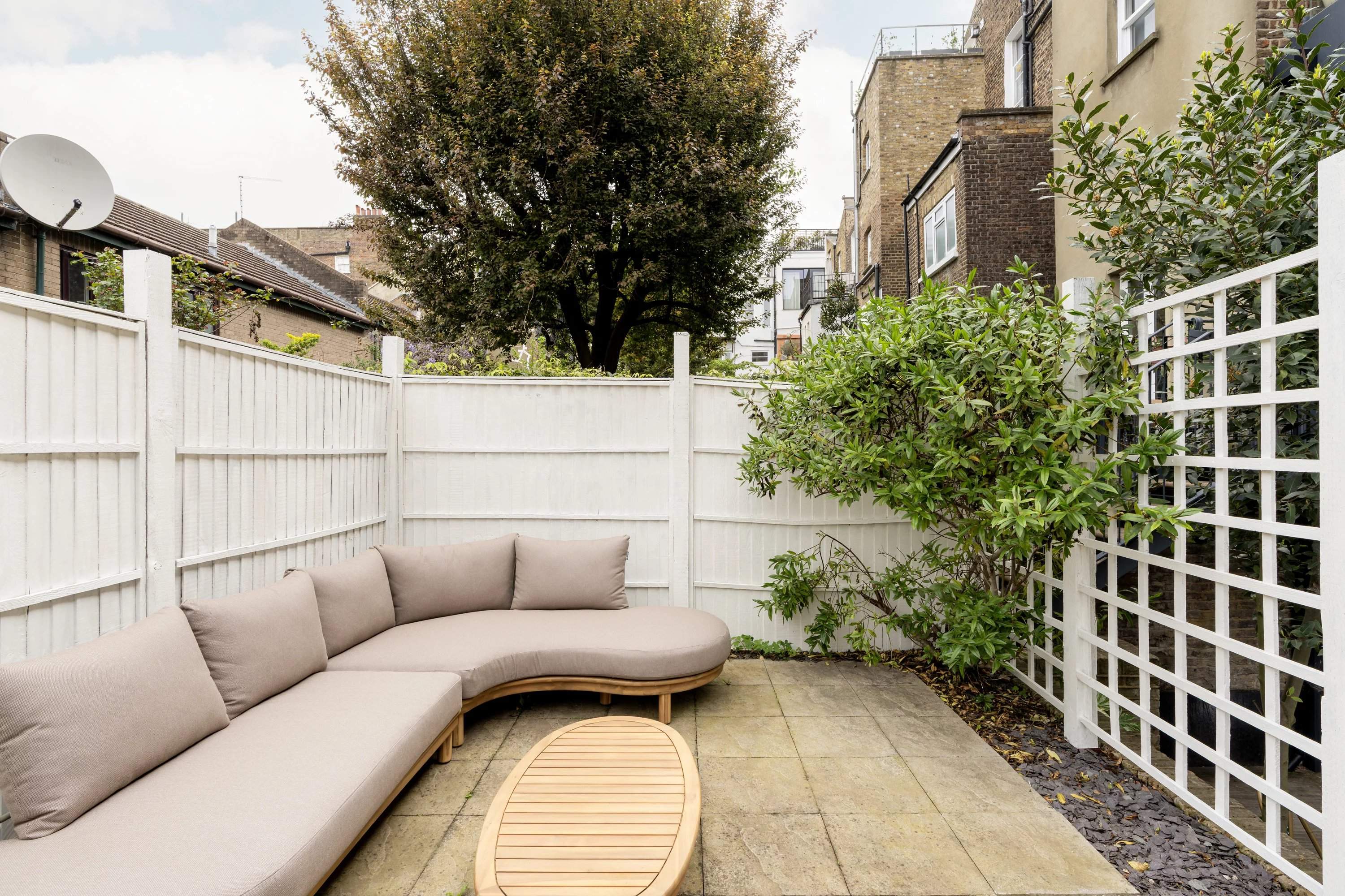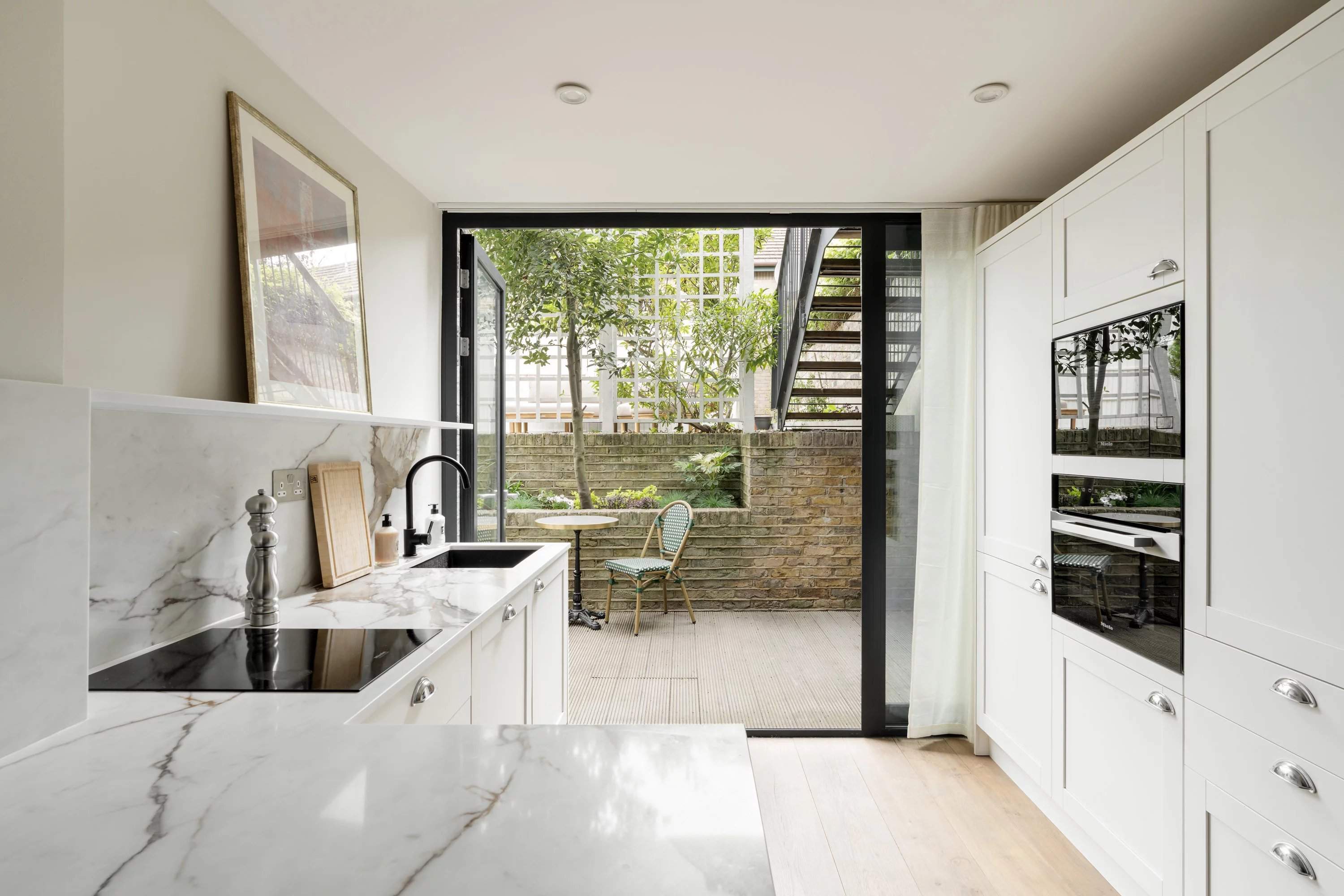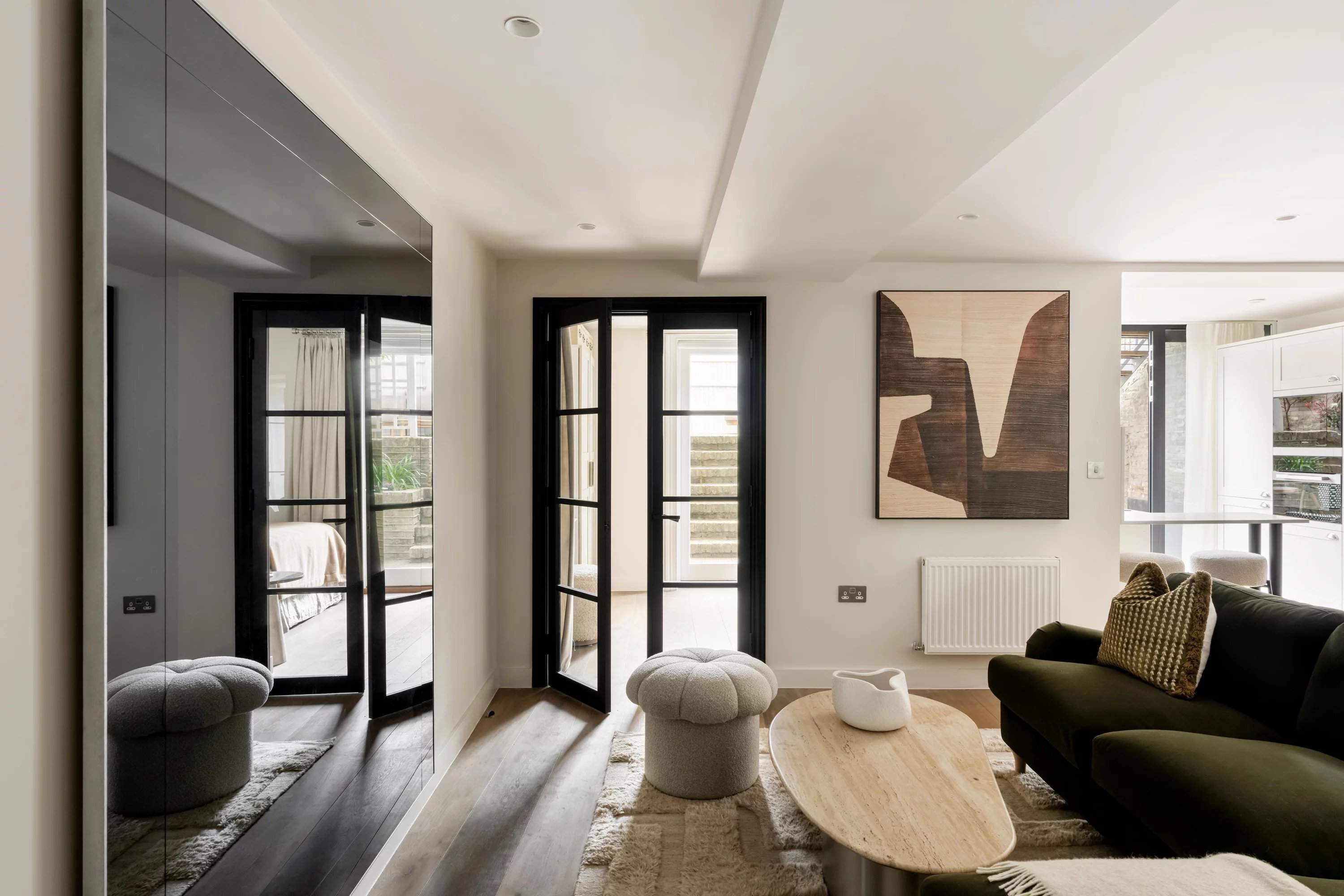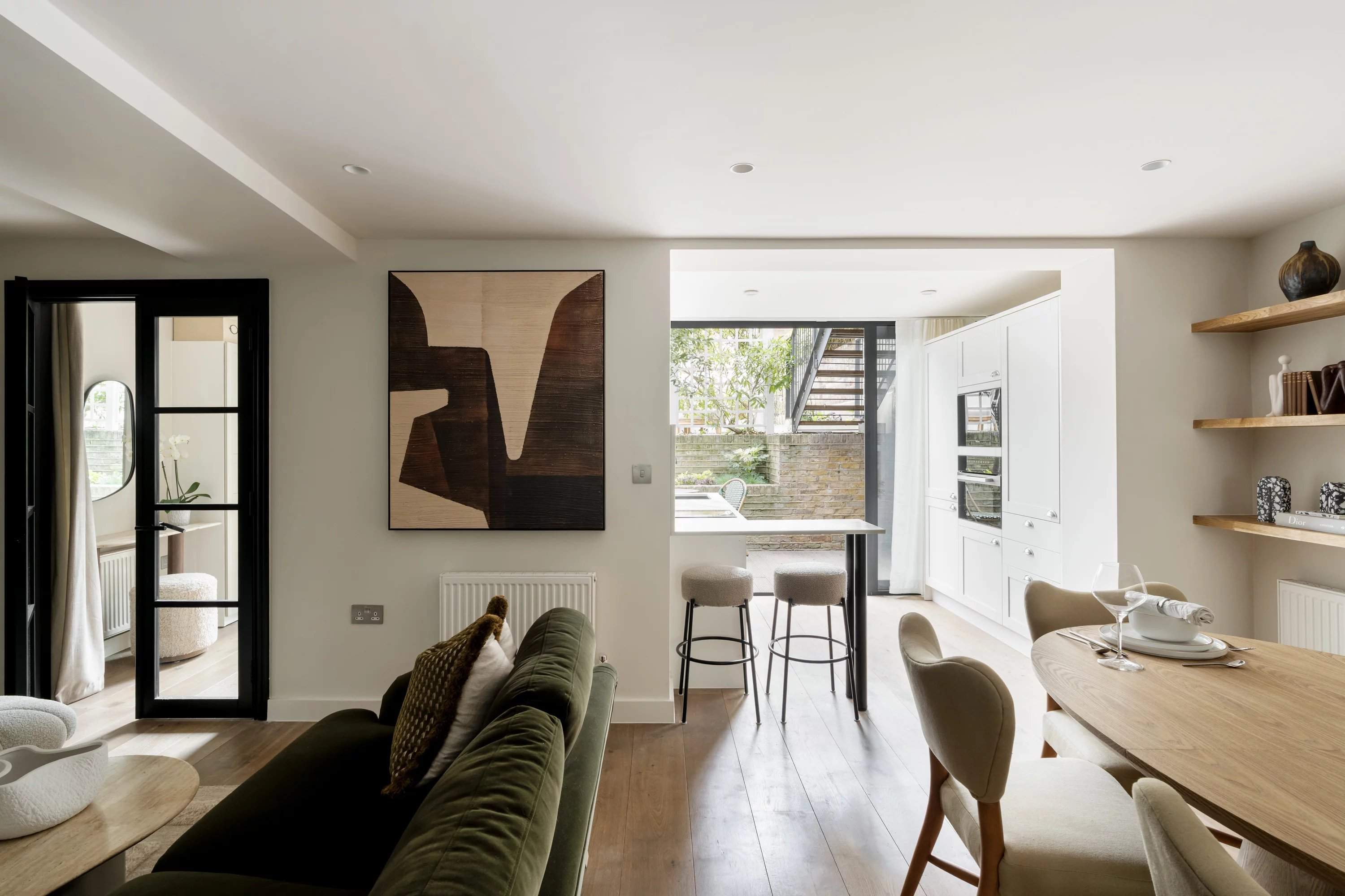 Logé au niveau du jardin d'une maison de ville à Notting Hill, cet appartement de deux chambres allie un design réfléchi à une sensation de lumière inattendue. Au coeur de l'appartement, une réception en open space se déploie autour d'un canapé en velours vert profond, avec une cheminée et une salle à manger créant un espace polyvalent et convivial. La cuisine est à la fois raffinée et pratique, définie par des armoires shaker, des plans de travail en marbre Calacatta et des appareils Miele intégrés. Des portes s'ouvrent sur un jardin privé en terrasse à plusieurs niveaux, équipé d'espaces pour manger et se détendre. La chambre principale semble calme et réfléchie, avec une salle de bains attenante, tandis qu'une deuxième chambre donne directement sur la terrasse et est desservie par une salle de bain familiale.