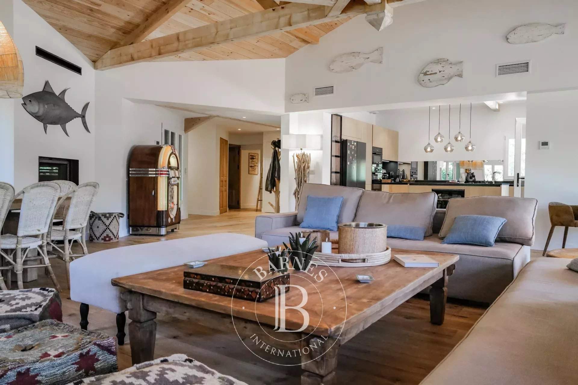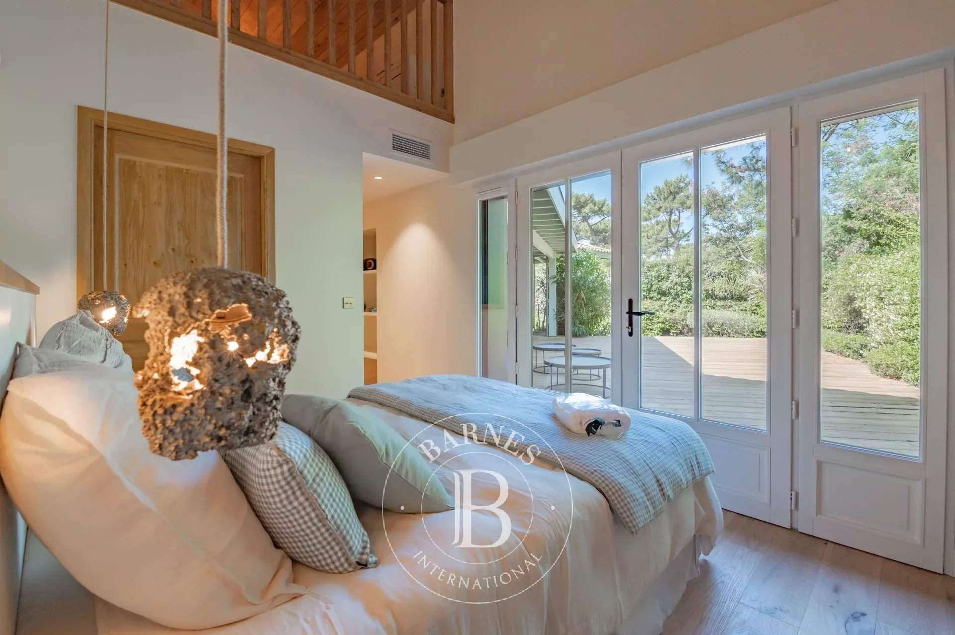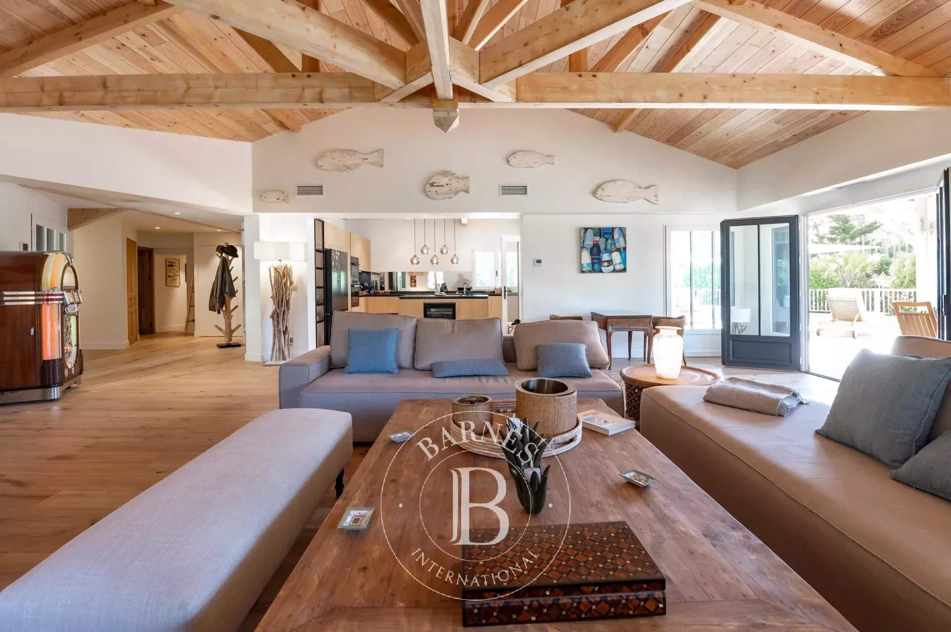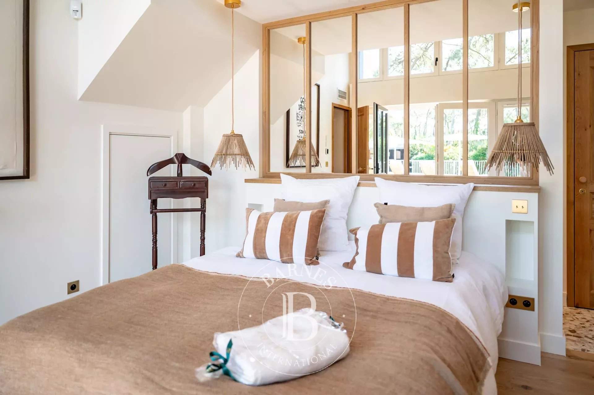 L'agence BARNES Cap Ferret vous présente, au Cap Ferret, cette villa d'exception proposée en location saisonnière, idéalement située à quelques minutes du Bassin d'Arcachon et des 44 hectares, des plages océanes et des commerces. Implantée dans un environnement calme, cette propriété d'environ 260 m² est une adresse privilégiée pour profiter pleinement du Cap Ferret en famille ou entre amis. La pièce de vie, spacieuse et lumineuse, réunit un salon et une cuisine ouverte entièrement équipée, pensée pour partager les moments du quotidien après la plage. Les larges ouvertures donnent accès aux terrasses et à la piscine, permettant de vivre dedans et dehors. La villa dispose de cinq chambres confortables, dont plusieurs bénéficient d'un accès direct à la terrasse et d'une vue sur la piscine, ainsi que de cinq salles d'eau. Cette configuration permet d'accueillir confortablement 8 à 10 personnes, chacun disposant de son propre espace. Un salon TV, un espace dédié aux enfants et une buanderie complètent l'agencement de la maison. À l'extérieur, le jardin paysager d'environ 1 800 m² accueille une piscine chauffée et sécurisée de 13 x 5 mètres, idéalement exposée. La propriété dispose également d'une cuisine d'été et d'un terrain de pétanque.