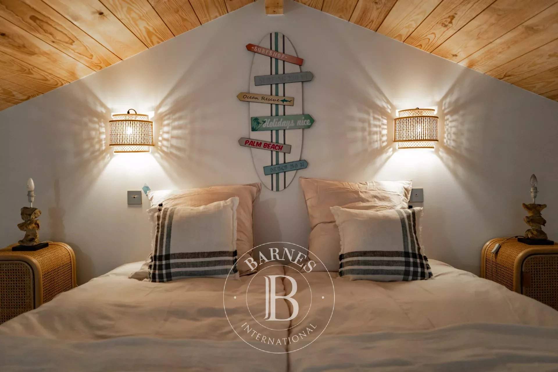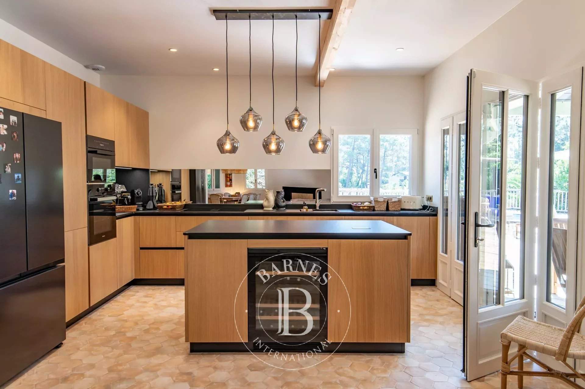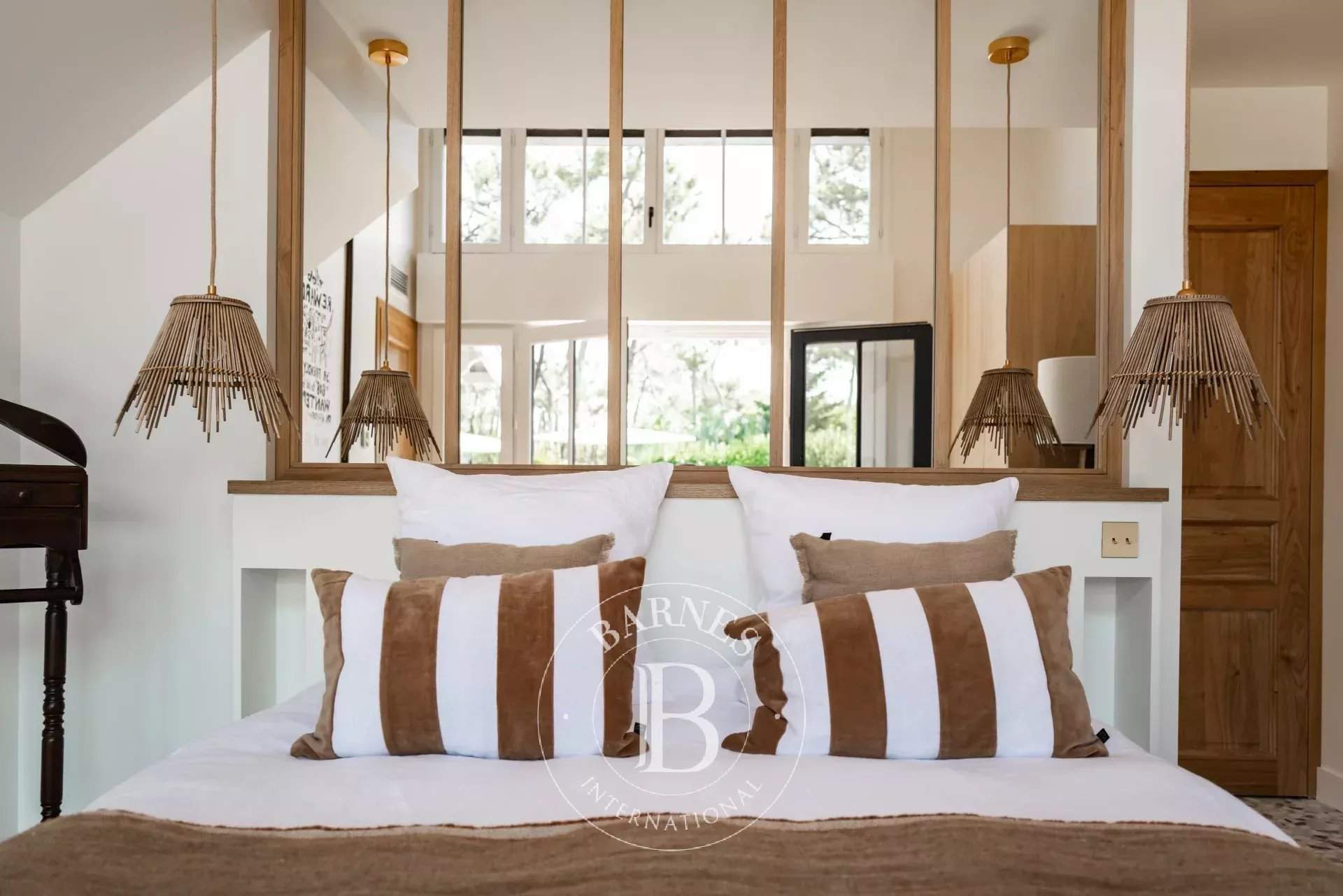 L'agence BARNES Cap Ferret vous présente, au Cap Ferret, cette villa d'exception proposée en location saisonnière, idéalement située à quelques minutes du Bassin d'Arcachon et des 44 hectares, des plages océanes et des commerces. Implantée dans un environnement calme, cette propriété d'environ 260 m² est une adresse privilégiée pour profiter pleinement du Cap Ferret en famille ou entre amis. La pièce de vie, spacieuse et lumineuse, réunit un salon et une cuisine ouverte entièrement équipée, pensée pour partager les moments du quotidien après la plage. Les larges ouvertures donnent accès aux terrasses et à la piscine, permettant de vivre dedans et dehors. La villa dispose de cinq chambres confortables, dont plusieurs bénéficient d'un accès direct à la terrasse et d'une vue sur la piscine, ainsi que de cinq salles d'eau. Cette configuration permet d'accueillir confortablement 8 à 10 personnes, chacun disposant de son propre espace. Un salon TV, un espace dédié aux enfants et une buanderie complètent l'agencement de la maison. À l'extérieur, le jardin paysager d'environ 1 800 m² accueille une piscine chauffée et sécurisée de 13 x 5 mètres, idéalement exposée. La propriété dispose également d'une cuisine d'été et d'un terrain de pétanque.