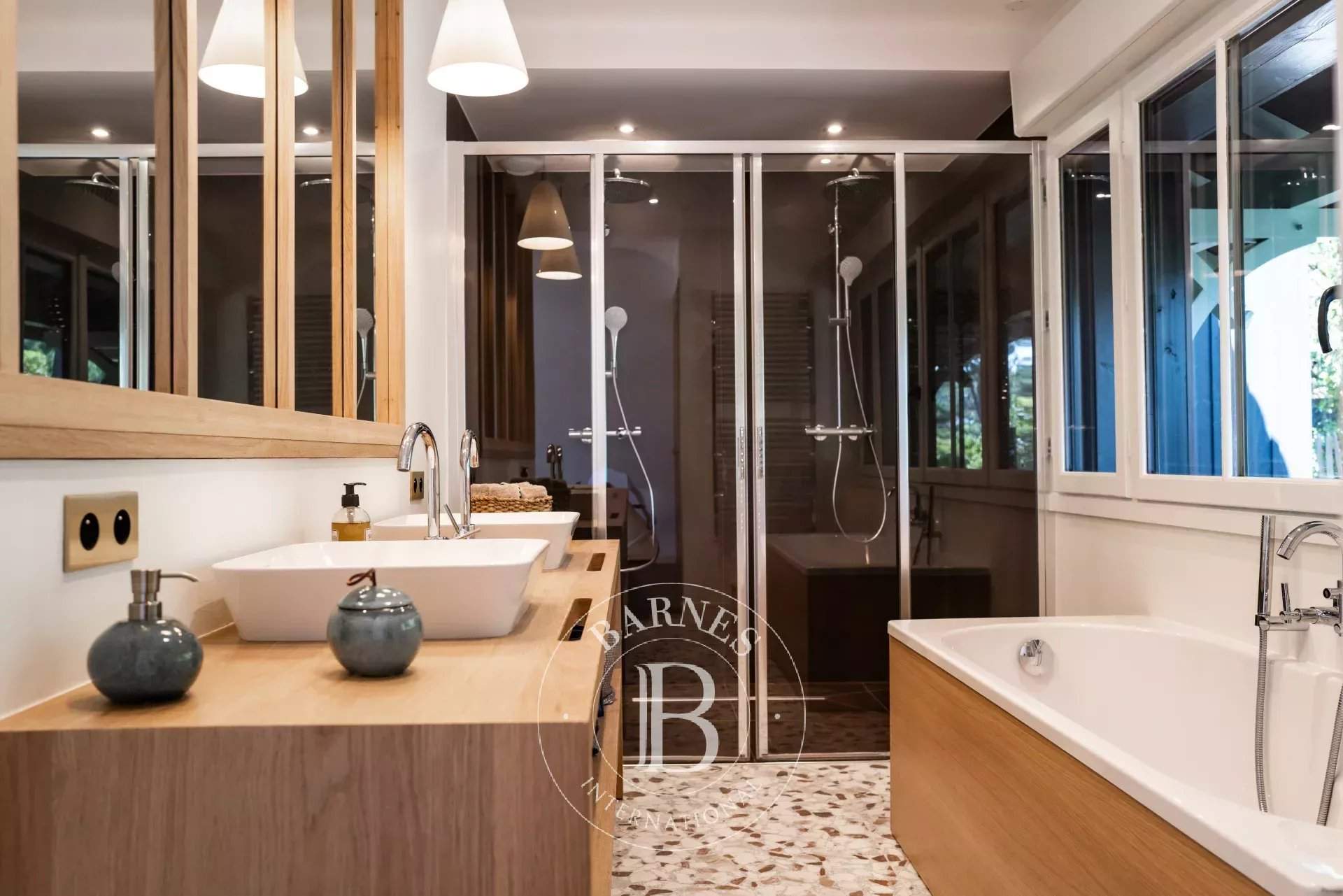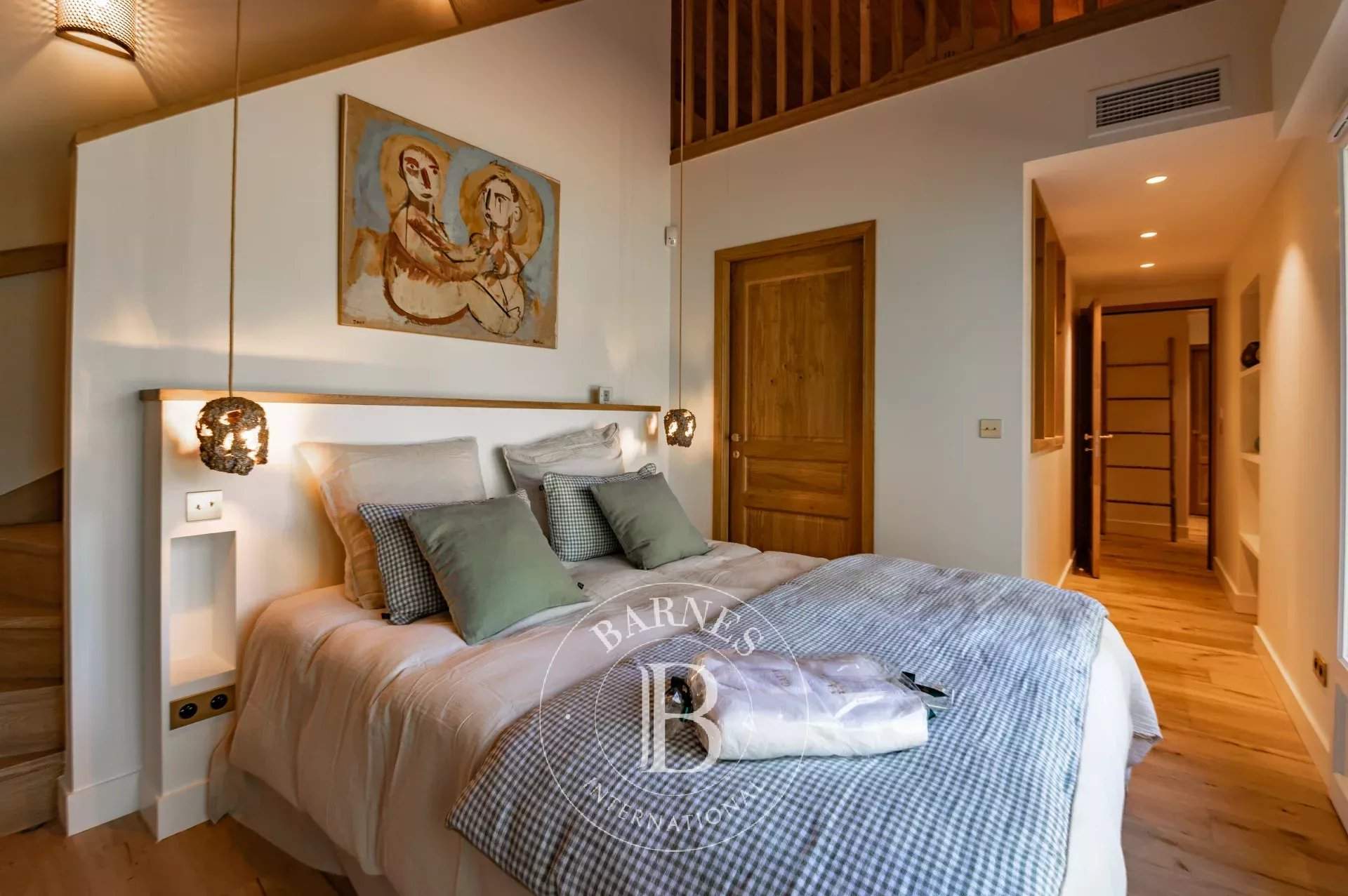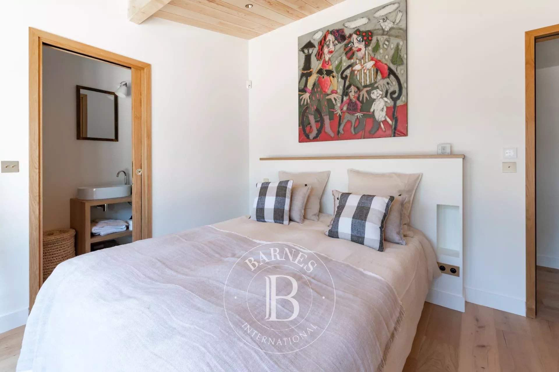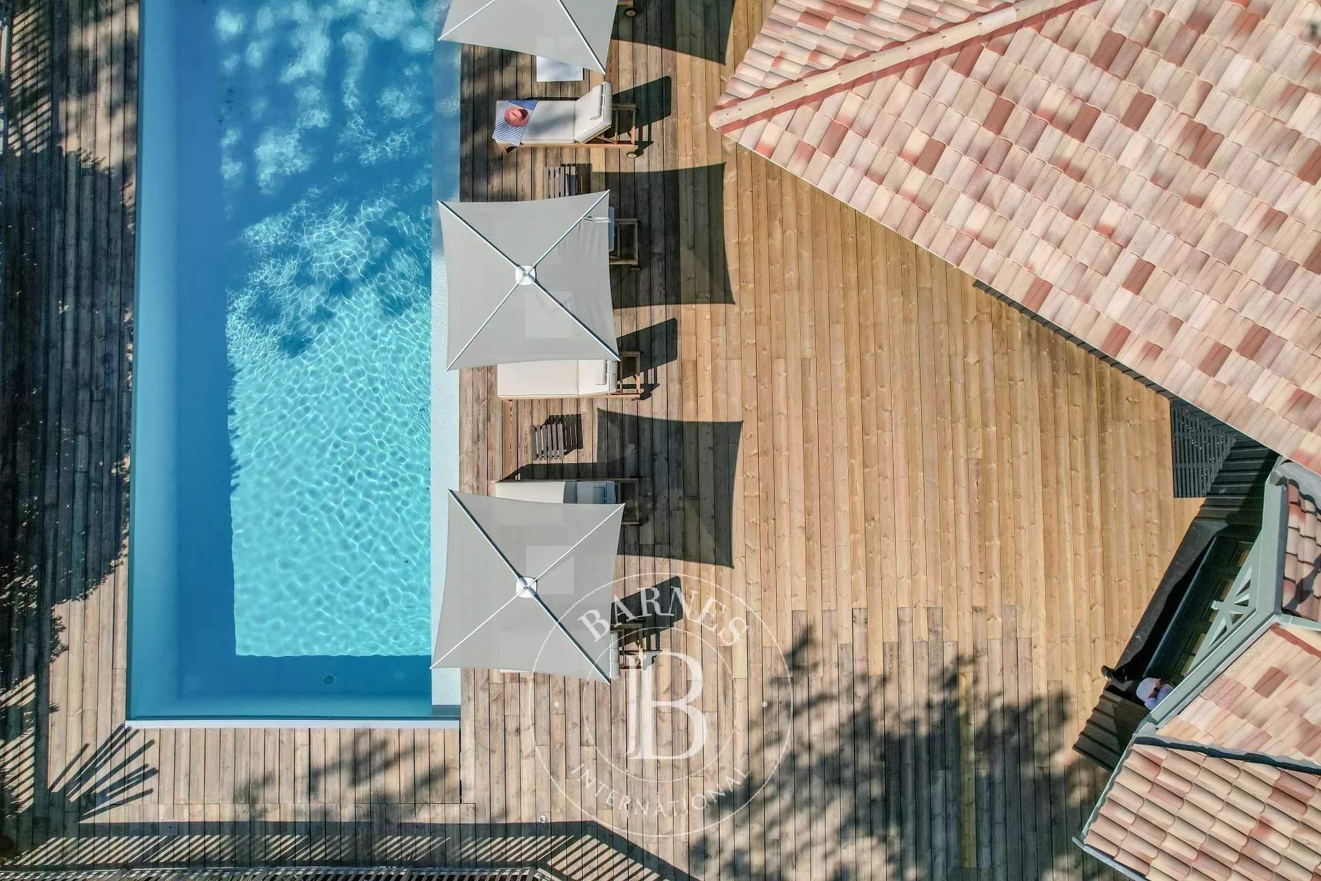 L'agence BARNES Cap Ferret vous présente, au Cap Ferret, cette villa d'exception proposée en location saisonnière, idéalement située à quelques minutes du Bassin d'Arcachon et des 44 hectares, des plages océanes et des commerces. Implantée dans un environnement calme, cette propriété d'environ 260 m² est une adresse privilégiée pour profiter pleinement du Cap Ferret en famille ou entre amis. La pièce de vie, spacieuse et lumineuse, réunit un salon et une cuisine ouverte entièrement équipée, pensée pour partager les moments du quotidien après la plage. Les larges ouvertures donnent accès aux terrasses et à la piscine, permettant de vivre dedans et dehors. La villa dispose de cinq chambres confortables, dont plusieurs bénéficient d'un accès direct à la terrasse et d'une vue sur la piscine, ainsi que de cinq salles d'eau. Cette configuration permet d'accueillir confortablement 8 à 10 personnes, chacun disposant de son propre espace. Un salon TV, un espace dédié aux enfants et une buanderie complètent l'agencement de la maison. À l'extérieur, le jardin paysager d'environ 1 800 m² accueille une piscine chauffée et sécurisée de 13 x 5 mètres, idéalement exposée. La propriété dispose également d'une cuisine d'été et d'un terrain de pétanque.
