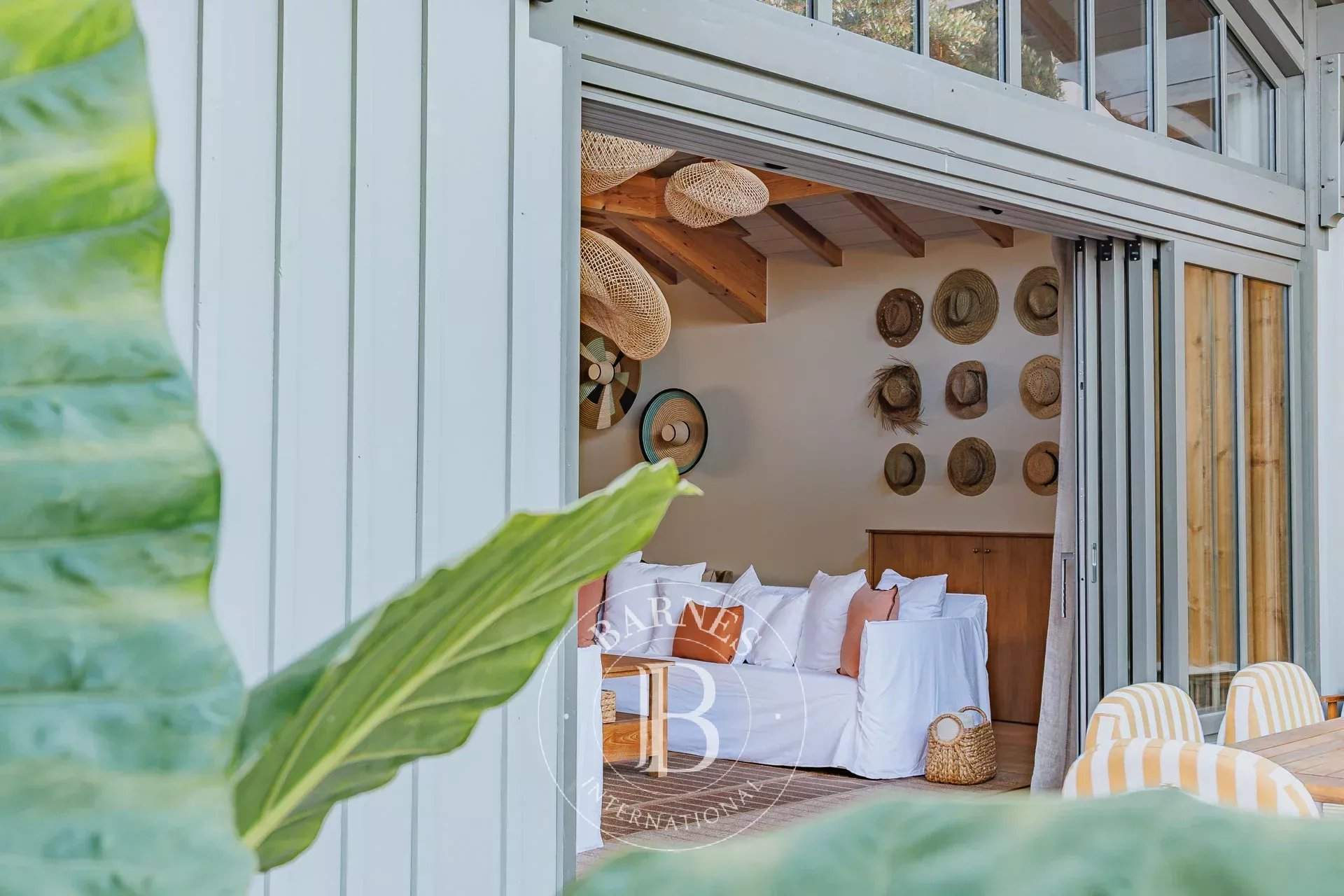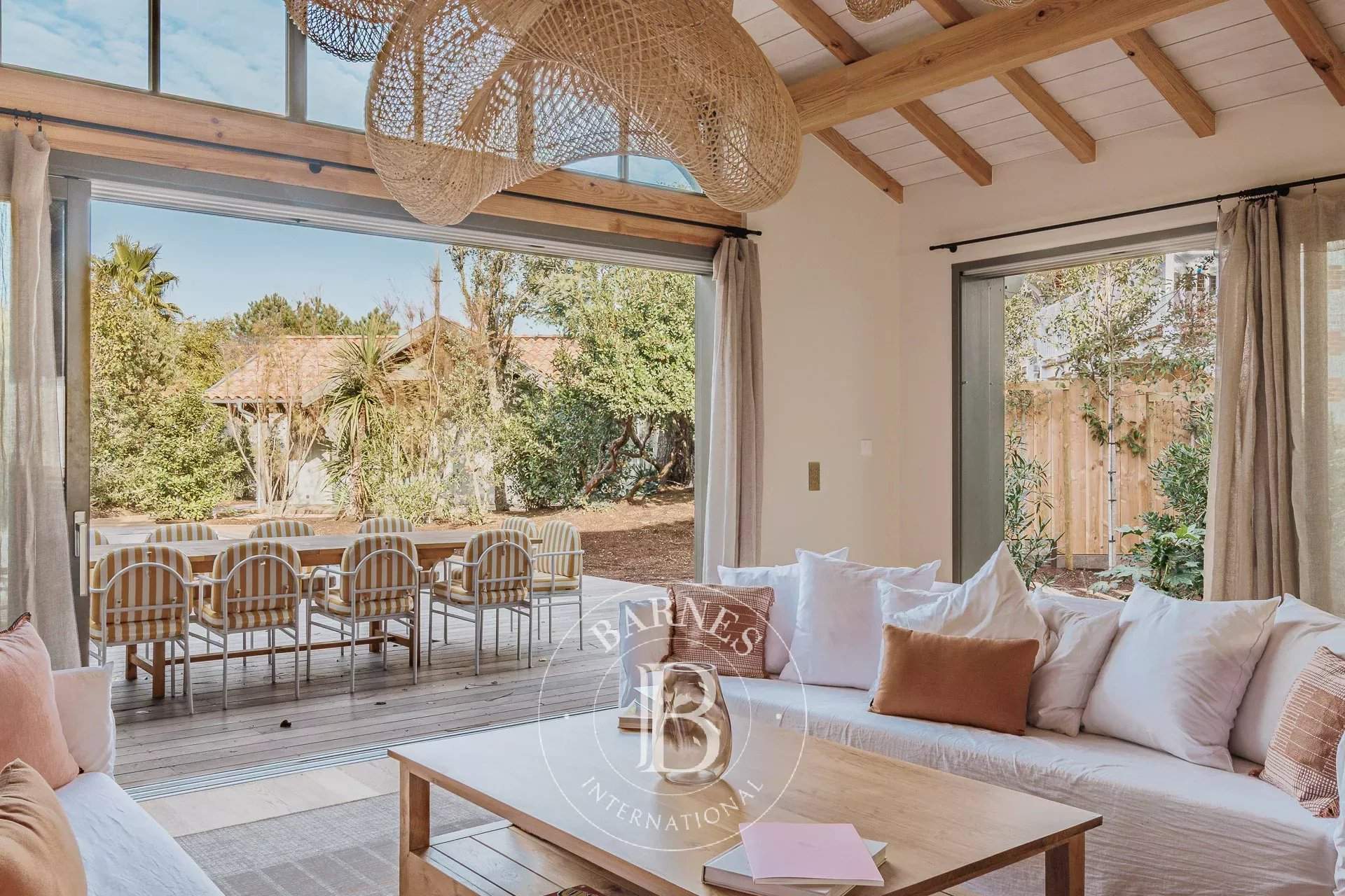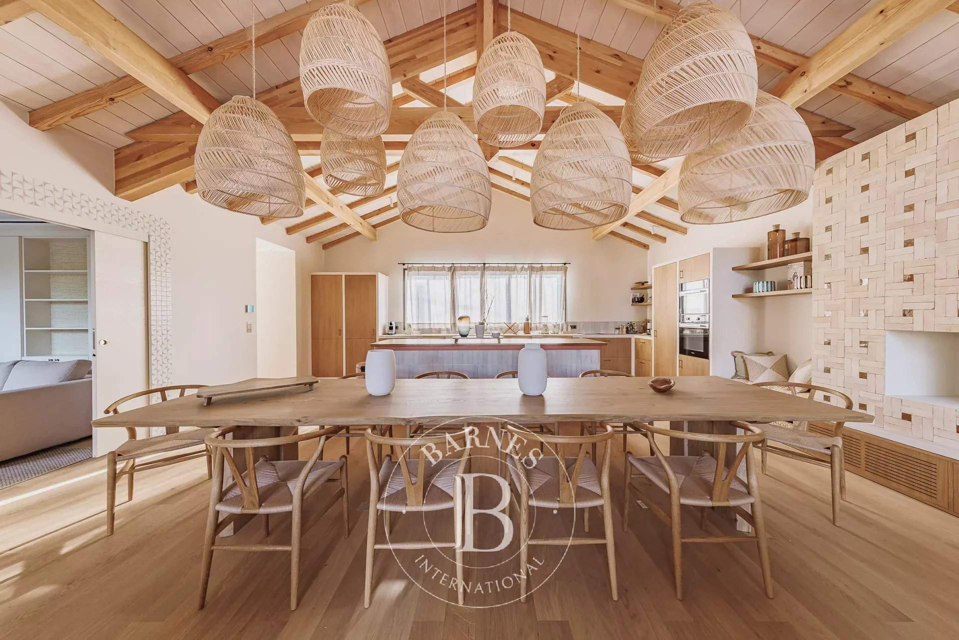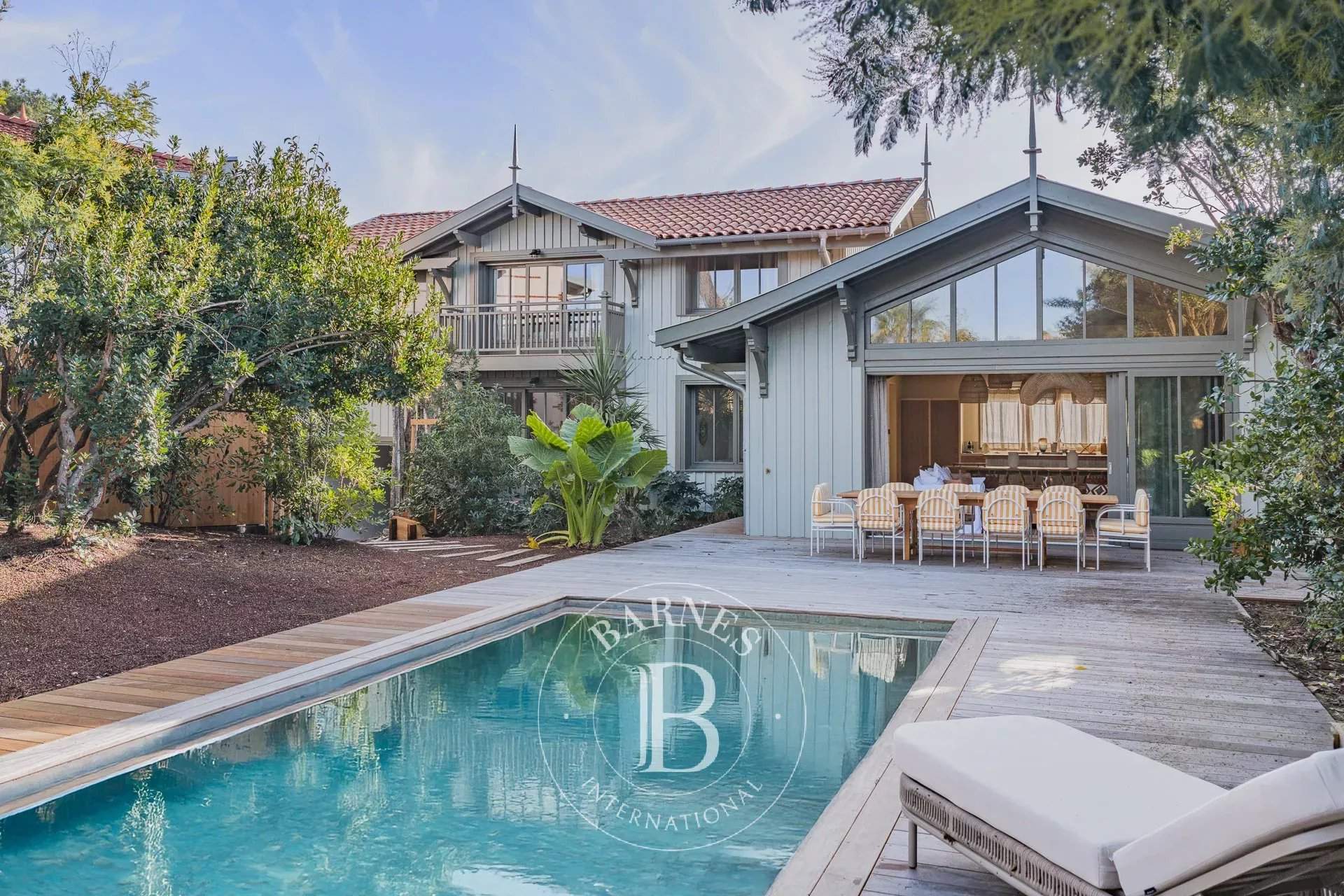 L'agence BARNES Cap Ferret vous présente la « Villa du Marché », une adresse rare au coeur du Cap Ferret, pensée pour des vacances où tout se fait à pied. À quelques mètres du marché, des commerces et des plages, cette villa neuve bénéficie d'un emplacement central tout en offrant des volumes confortables et une organisation parfaitement adaptée à la vie de villégiature au Cap Ferret. La pièce de vie principale se distingue par sa belle hauteur sous plafond et sa luminosité. Elle réunit un vaste salon, un salon TV et une cuisine ouverte entièrement équipée, formant un espace convivial et fonctionnel. L'ensemble permet d'organiser facilement des déjeuners et dîners sur la terrasse, dans un cadre agréable et convivial. La villa principale accueille quatre chambres, chacune disposant de sa propre salle d'eau, garantissant un excellent niveau de confort. Une seconde habitation indépendante complète la propriété : elle comprend deux chambres avec salles d'eau privatives ainsi qu'une cuisine équipée, idéale pour loger famille ou amis en toute autonomie. À l'extérieur, les aménagements ont été conçus pour profiter pleinement des beaux jours : piscine chauffée et sécurisée, cuisine d'été avec plancha, solarium et boulodrome. Une villa récente, entièrement climatisée et soigneusement décorée, offrant une capacité d'accueil de 12 personnes, idéale pour profiter du Cap Ferret.